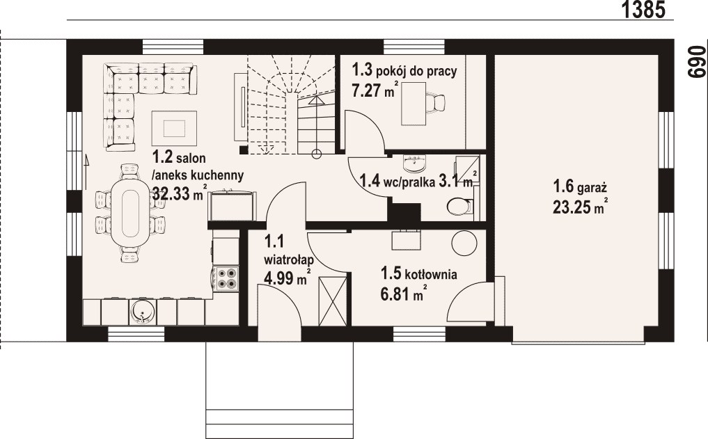- 1.2 - salon z aneksem kuchennym32.33 m²