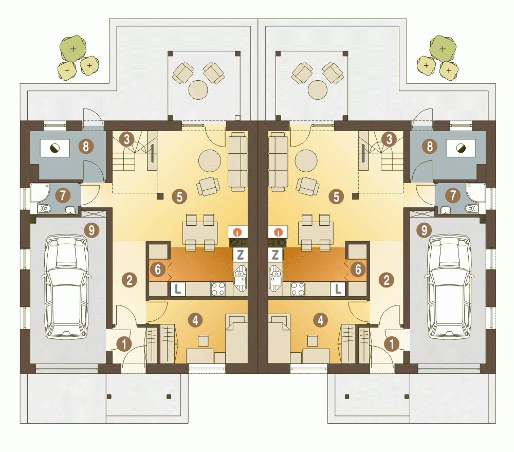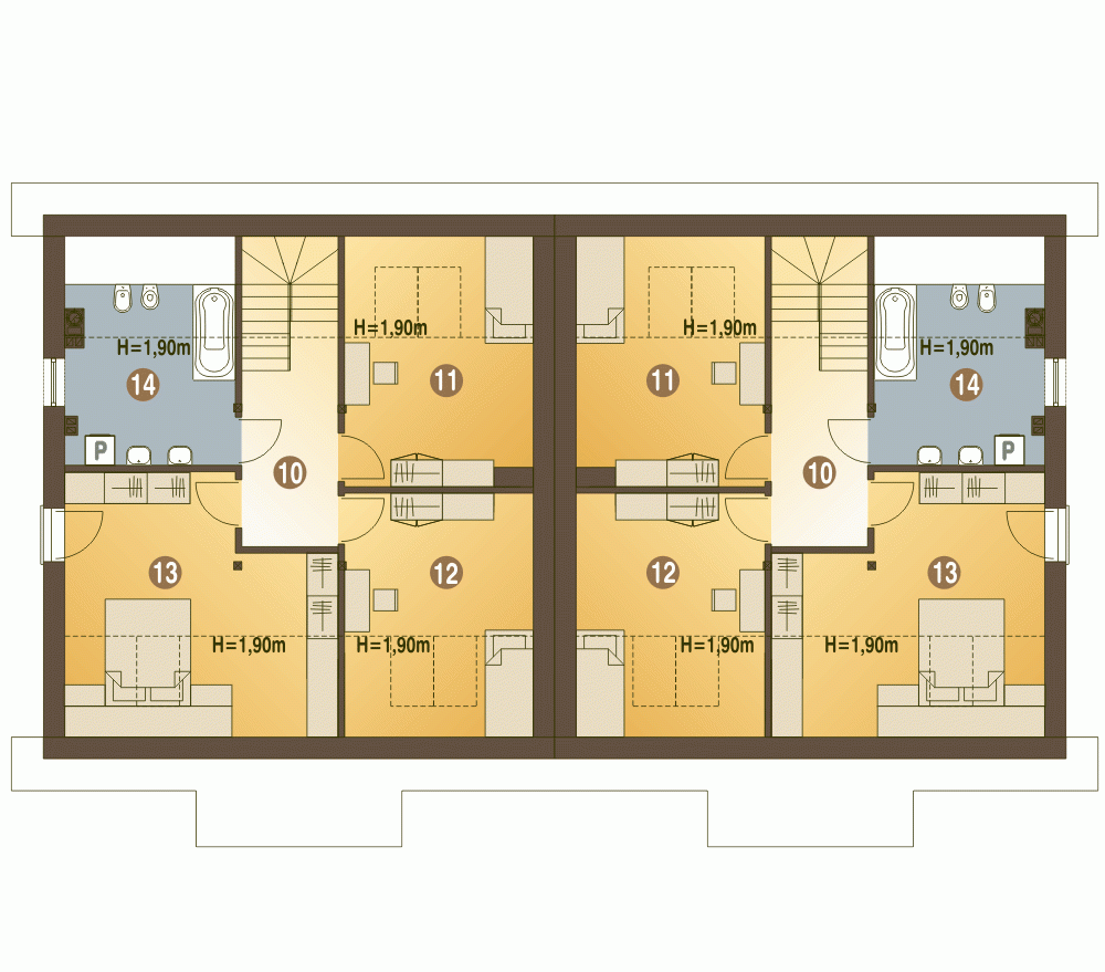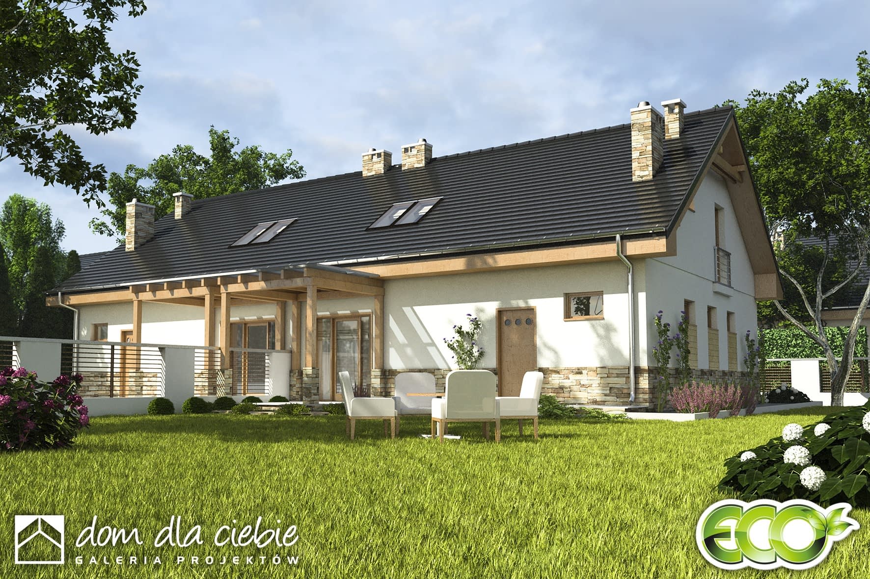 (Uwaga: projekty typu bliźniak oferujemy jako domy dwulokalowe, projekt można zamówić również w zabudowie bliźniaczej)Jarząbek II A-BL2 powstał z połączenia dwóch segmentów budynku (lewy i prawy) ścianami szczytowymi od strony salonów. Poniższy opis dotyczy jednego segmentu.Jarząbek II to mały domek w układzie kalenicowym, zaprojektowany z myślą o ekonomicznej budowie o użytkowaniu dla 3-4 osobowej rodziny.Parter zawiera w sobie salon z kuchnią (niewielka spiżarnia przy kuchni), pokój gościnny, wiatrołap, hol, łazienkę z natryskiem oraz garaż i kotłownię na paliwo stałe.Na poddasze prowadzą wygodne schody. Poddasze mieści w sobie sporą łazienkę oraz trzy sypialnie.Architektura Jarząbka II łączy w sobie elementy tradycyjne i nowoczesne.