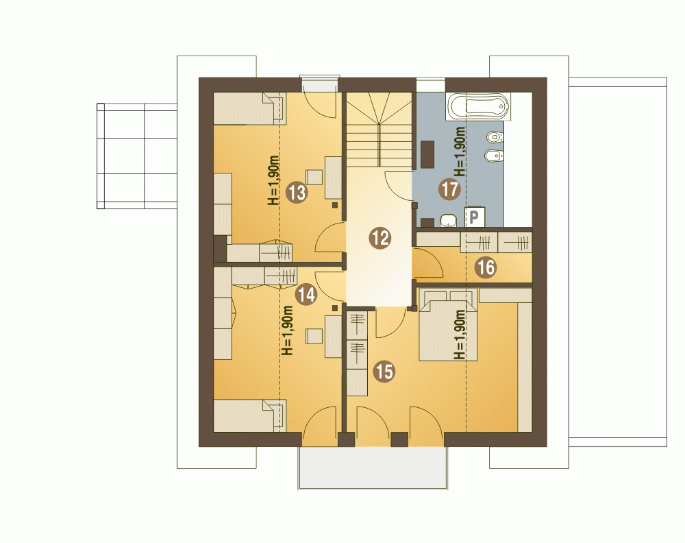 Jarząbek to mały domek dedykowany 3-4 osobowej rodzinie. Zaprojektowany z myślą o ekonomicznej budowie i użytkowaniu. Parter zawiera w sobie salon z kuchnią (niewielka spiżarnia przy kuchni), pokój gościnny, wiatrołap, hol, łazienkę z natryskiem, garderobę pod schodami oraz garaż 2-stanowiskowy i kotłownię na paliwo stałe.Na poddasze prowadzą wygodne schody. Poddasze mieści w sobie sporą łazienkę oraz trzy sypialnie i garderobę. Architektura Jarząbka łączy w sobie elementy tradycyjne i nowoczesne.