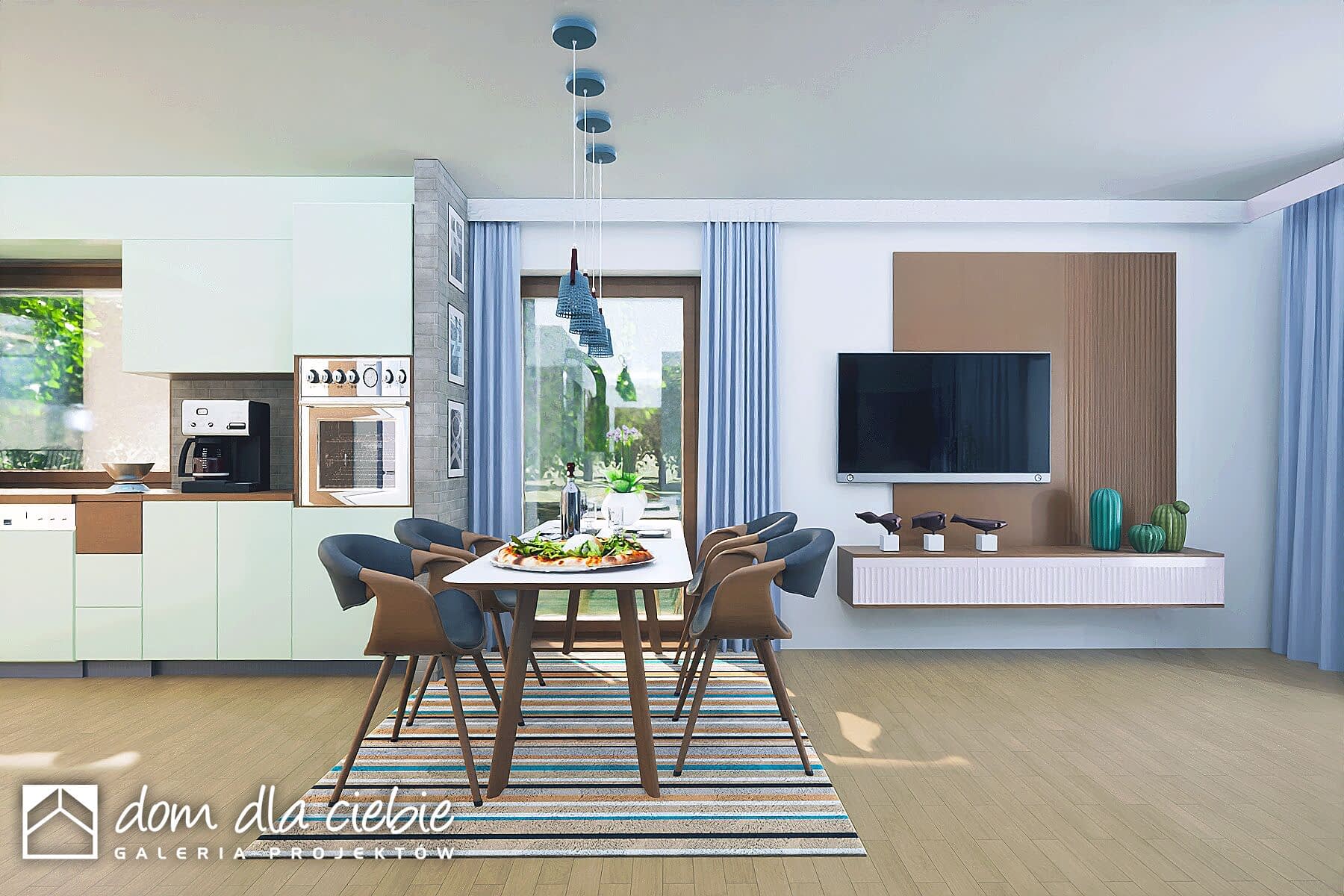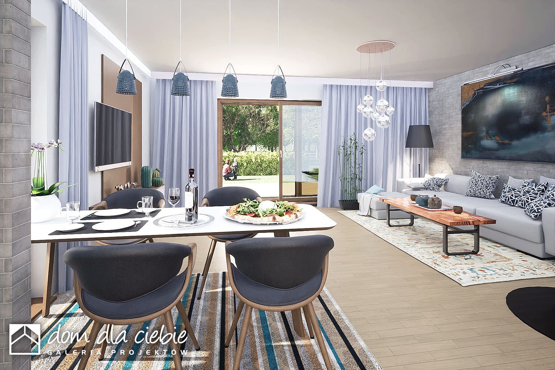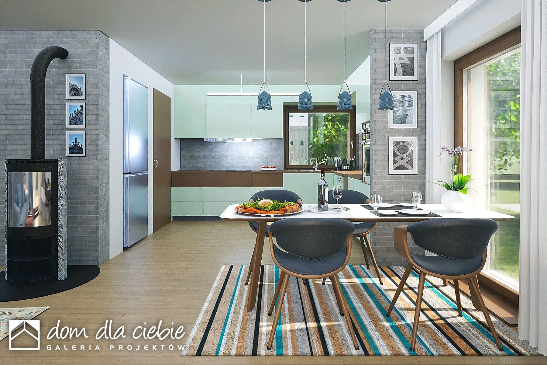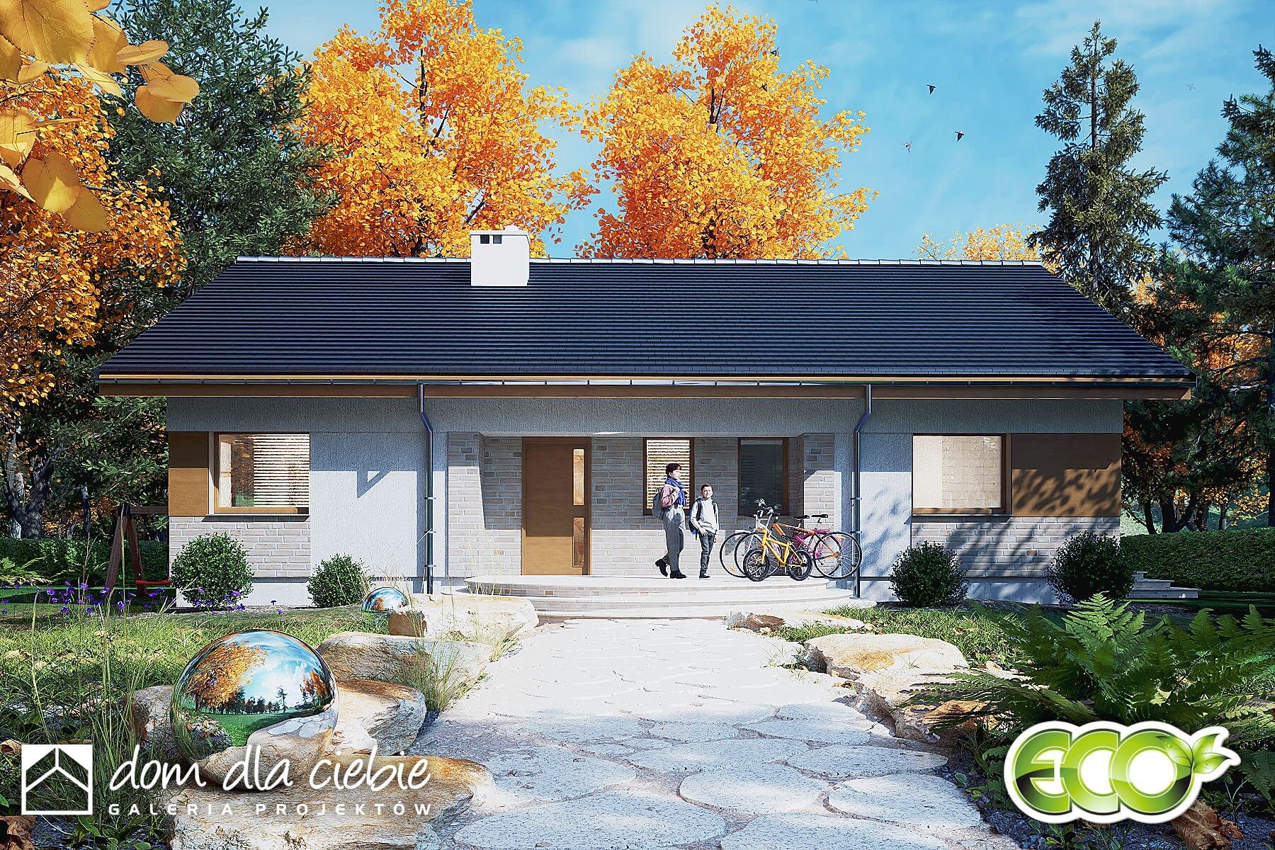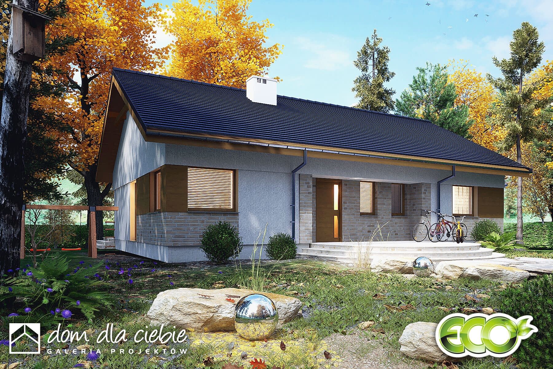 Jarzębina to mały, jednopiętrowy dom z prostym dwuspadowym dachem, który prezentuje się elegancko. Idealny dla czteroosobowej rodziny, zapewniający komfort i funkcjonalność.Główne wejście, chronione podcieniem, prowadzi do wiatrołapu z praktycznymi szafami, a stamtąd do salonu i korytarza. Salon, kuchnia i jadalnia tworzą otwartą przestrzeń z kominkiem i przeszklonymi drzwiami prowadzącymi do ogrodu. Kuchnia ma także niewielką spiżarnię, a stół jadalny stoi przy wysokim oknie.Strefa prywatna zawiera trzy sypialnie, WC, łazienkę i pomieszczenie techniczne z pralką i suszarką. Dostęp do ogrodu jest możliwy także bezpośrednio z tej strefy.Ten ekonomiczny i ekologiczny dom ma uniwersalny design, doskonale wpasowujący się zarówno w nowe osiedla, jak i istniejącą zabudowę.