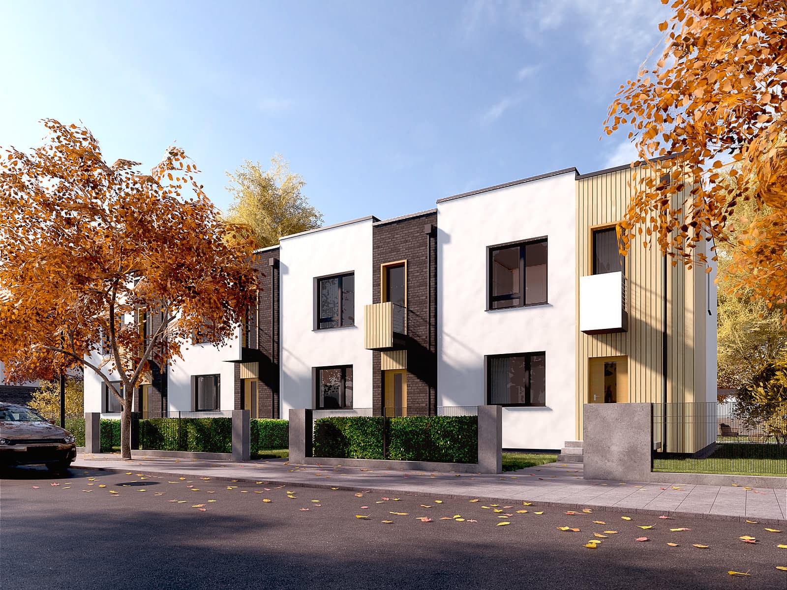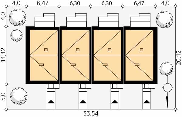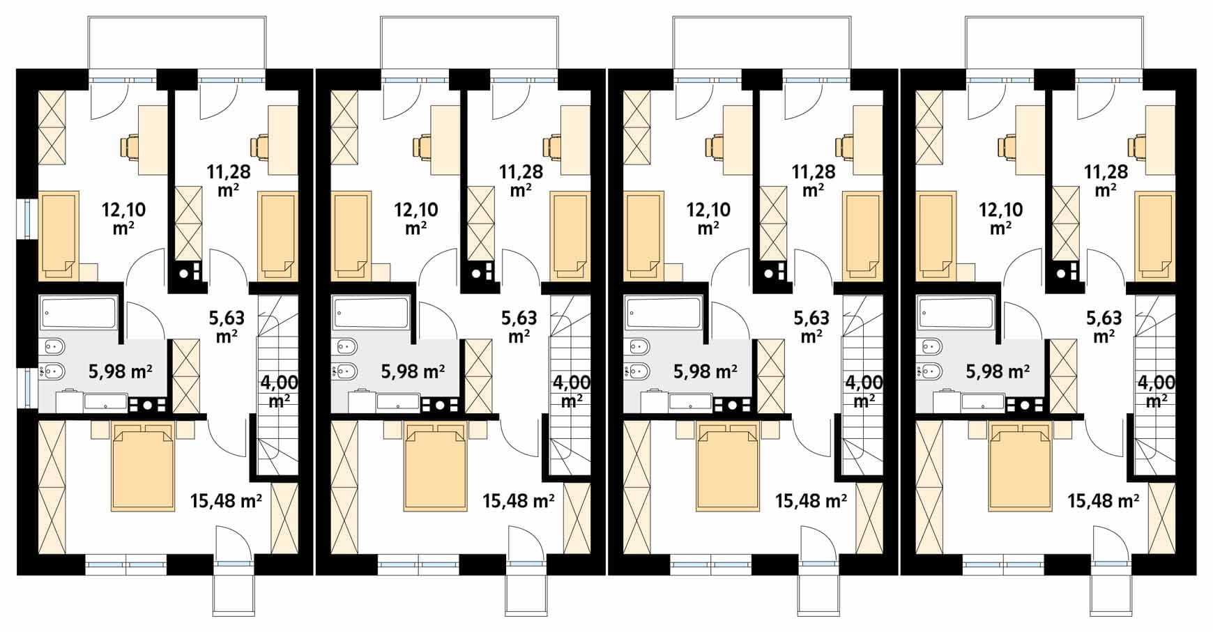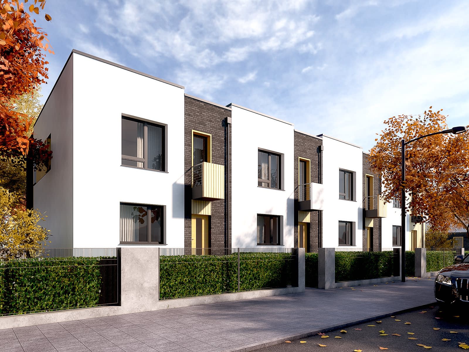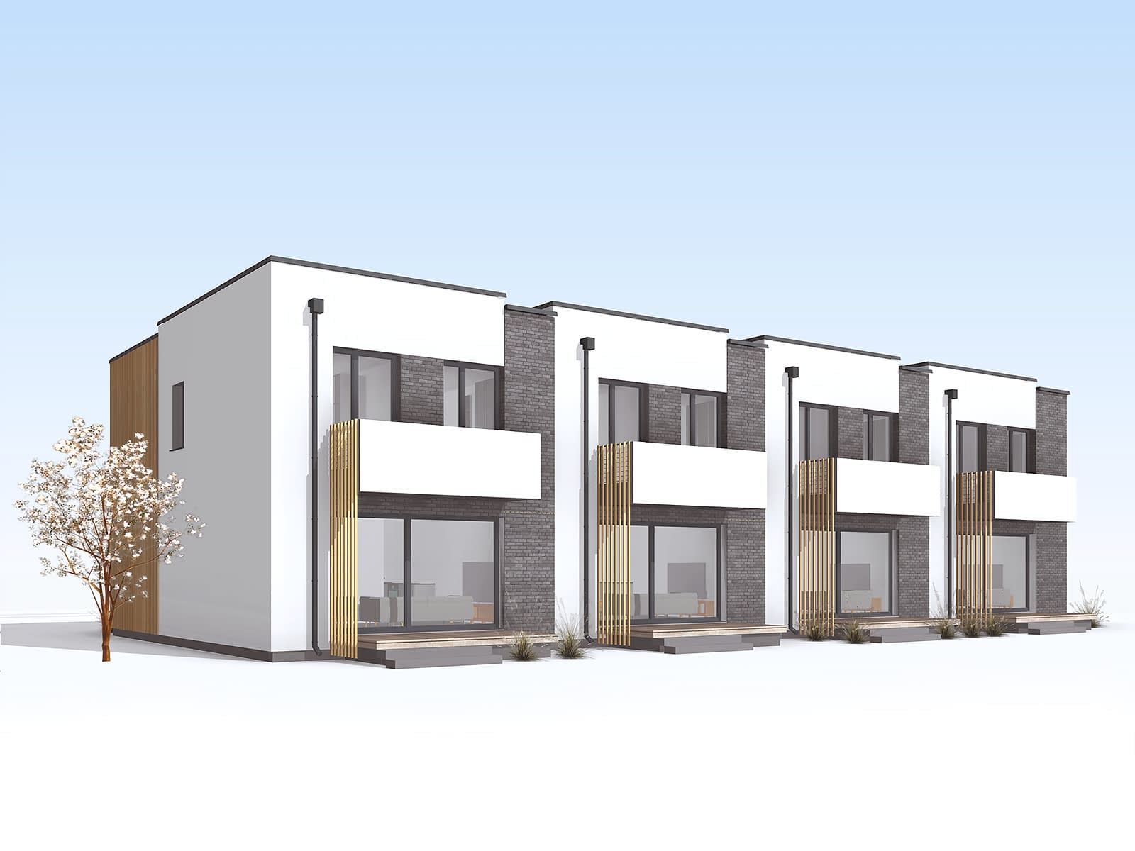 Niewielka szeregówka przeznaczona dla 4-osobowej rodziny. Projekt przyciąga uwagę prostą, niedrogą w budowie bryłą i nowoczesnym detalem. Rozdział na strefę dzienną i prywatną odpowiada podziałowi na kondygnacje. Otwarta przestrzeń parteru umożliwia stworzenie przytulnego i nowoczesnego wnętrza. Układ został rozplanowany wokół centralnego pionu mieszczącego pomieszczenia i urządzenia techniczno-sanitarne. Na piętrze znajduje się łazienka i trzy wygodne sypialnie z dostępem do balkonów. Istnieje możliwość wykonania projektu budynku z inną liczbą i układem segmentów.Konstrukcja