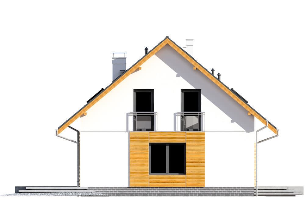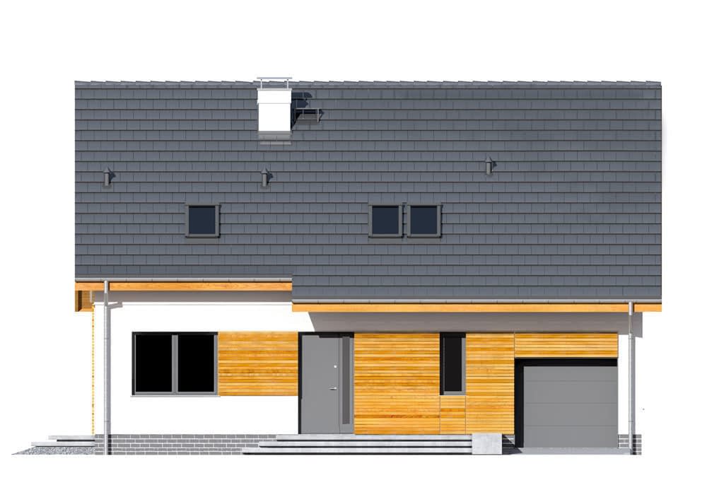 Dom został zaprojektowany dla potrzeb 4-ro lub 5-cio osobowej rodziny. Kompaktowa, zwarta bryła domu, oparta na rzucie prostokąta, jest przekryta dwuspadowym dachem o bardzo prostej konstrukcji drewnianej. Dom zaprojektowano dodatkowo z garażem jednostanowiskowym wbudowanym bryłę budynku. Proste i funkcjonalne wnętrze zakłada strefę dzienną wraz z pokojem gościnnym na parterze oraz w pełni rozkładową strefę nocną na poddaszu. Przestronny, otwierający się na ogród salon z jadalnią dopełniono częściowo zadaszonym tarasem, który doskonale sprawdzi się jako miejsce na letnie posiłki. Nad pomieszczeniem garażu i kotłowni znajduje się przestronny strych użytkowy który można przeznaczyć na dodatkowy pokój lub pomieszczenie rekreacyjne. Optymalna wysokość ścianki kolankowej (106 cm w części mieszkalnej i 163 cm w części strychu), pozwala na uzyskanie komfortowej powierzchni mieszkalnej na poddaszu i zachowanie idealnych proporcji bryły obiektu. Budynek stanowi kompromis tradycyjnej formy, współczesnej estetyki oraz nowoczesnych materiałów, takich jak elewacyjna okładzina klinkierowa, czy szlachetna dachówka ceramiczna. Ponadczasowa architektura tego małego domu sprawia, że z łatwością wpisze się w niemal każdy krajobraz.