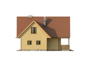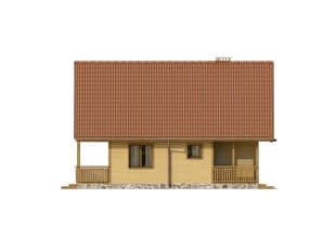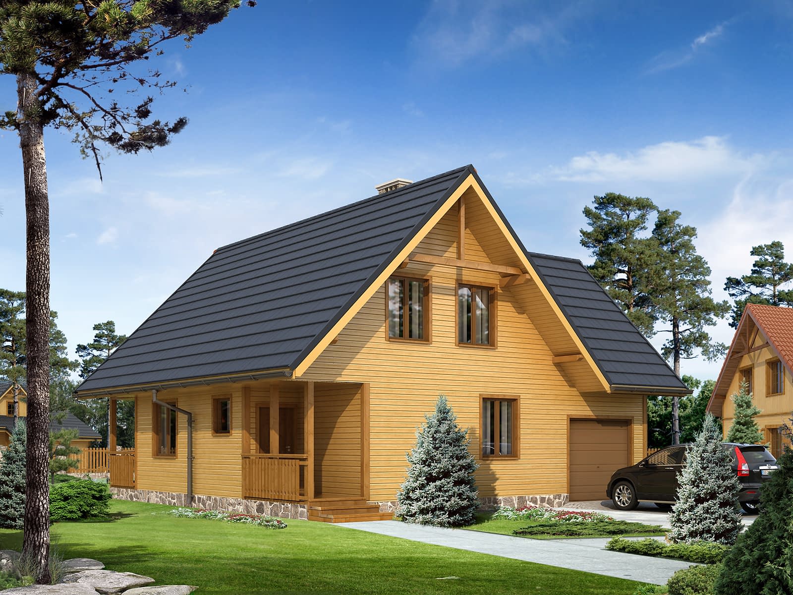 Drewniany dom z użytkowym poddaszem i garażem. Na parterze zlokalizowano przestronny pokój dzienny z wyjściem na zadaszony taras. Na piętrze zlokalizowano trzy sypialnie i łazienkę.Konstrukcja