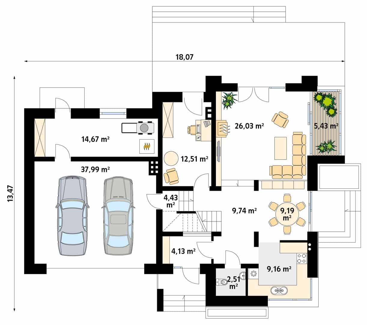 Nowoczesny dom mieszkalny projektowany według standardów przyjętych w domach energooszczędnych. W dużych przestronnych wnętrzach parteru zaprojektowano oranżerię. Na poddaszu zaprojektowano trzy sypialnie oraz pokój zabaw lub hobby nad garażem. Na parterze znajduje się dodatkowy pokój.Konstrukcja