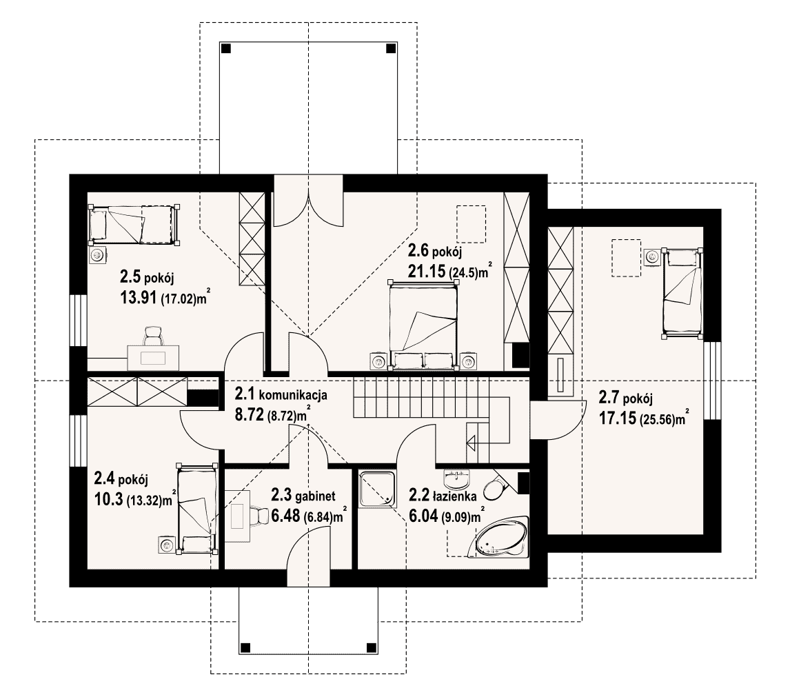 Całkowicie podpiwniczony, przestronny i funkcjonalny dom z dobudowanym garażem. Salon z kominkiem, oraz z aneksem kuchennym. Gabinet na parterze i poddaszu. Ponadto na poddaszu cztery sypialnie. Duże balkony, zadaszony taras.Rzuty