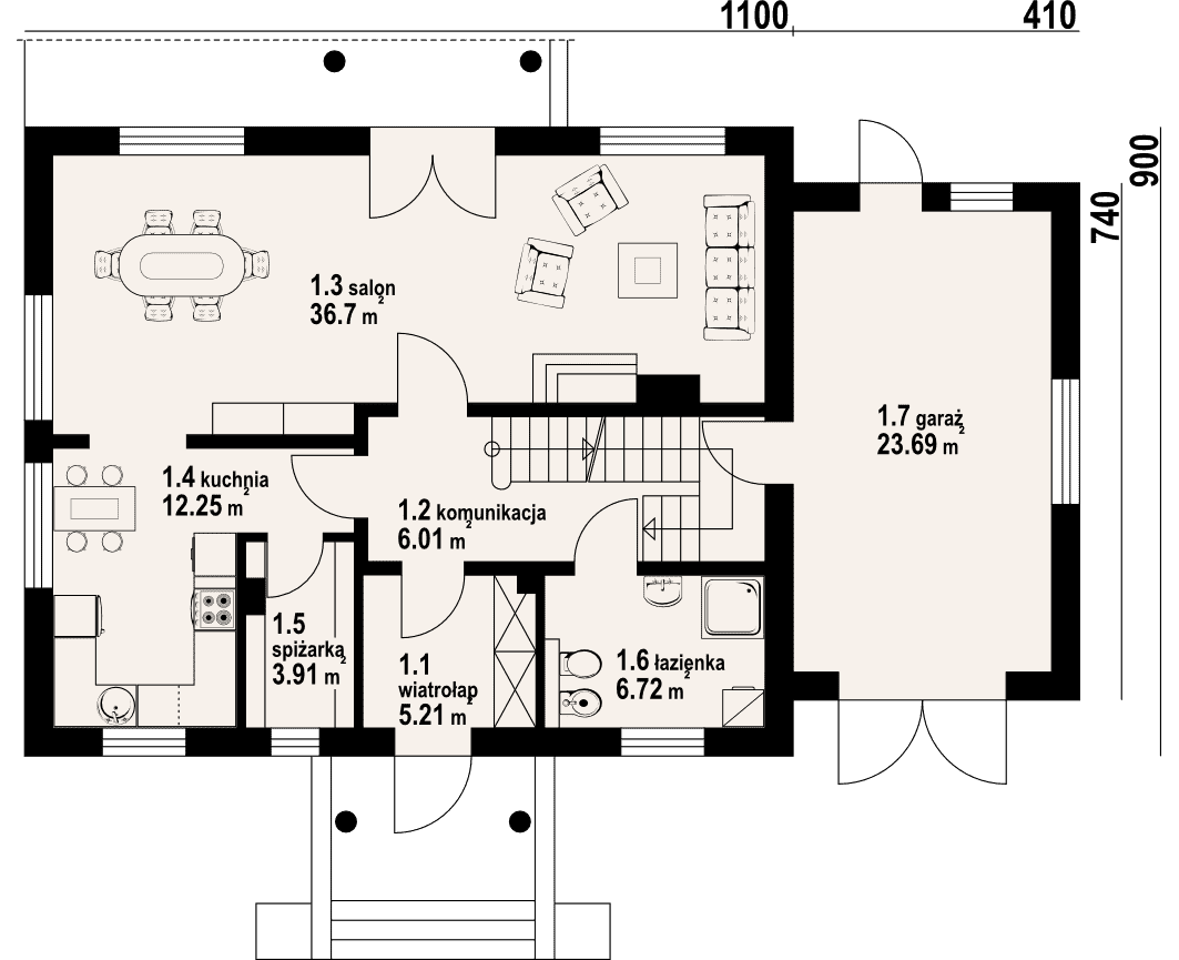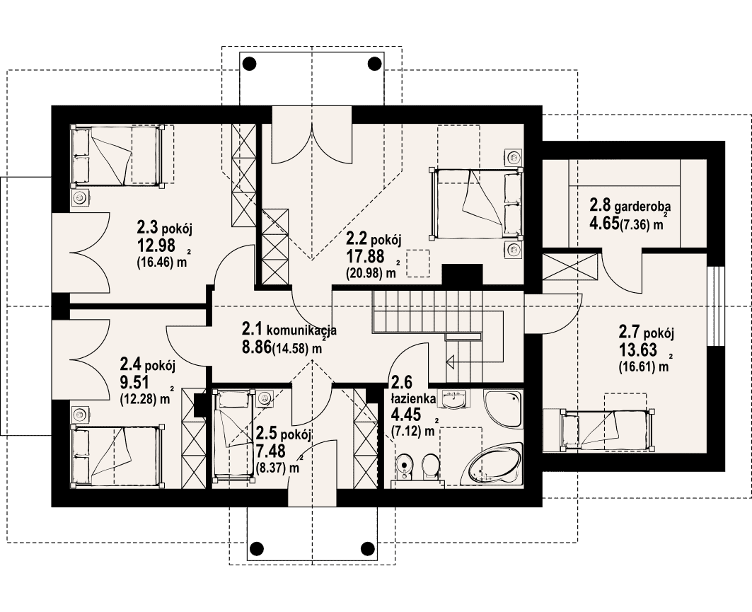 Interesujący dom z podpiwniczeniem o układzie funkcjonalnym przeznaczonym dla cztero-sześcioosobowej rodziny. Na parterze duży salon z kominkiem, wydzielona kuchnia z spiżarką, oraz łazienka. Garaż dostępny bezpośrednio z budynku. Poddasze to pięć sypialni, w tym jedna z garderobą i łazienka. W podpiwniczeniu zaplecze gospodarcze.Rzuty