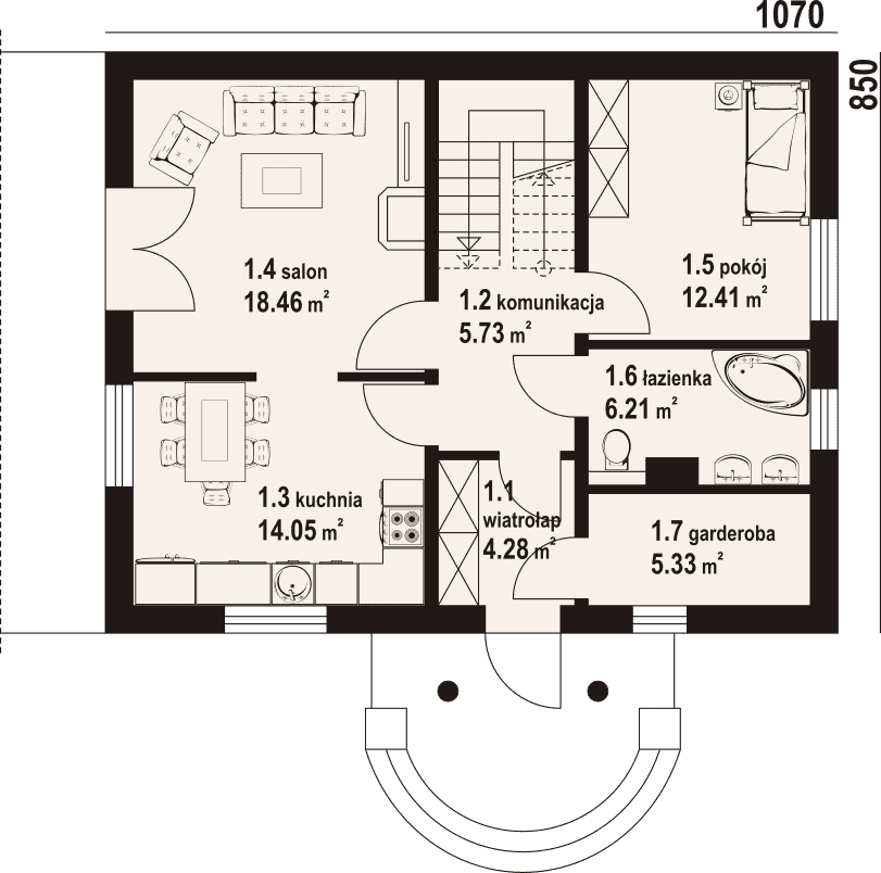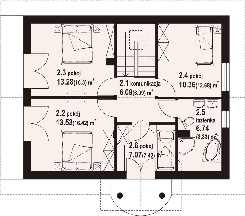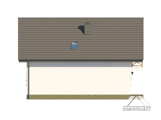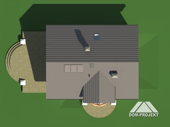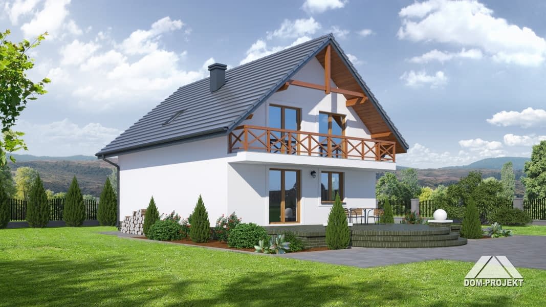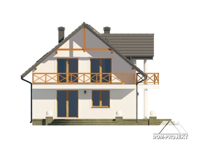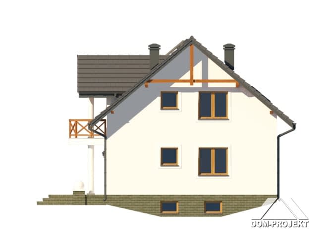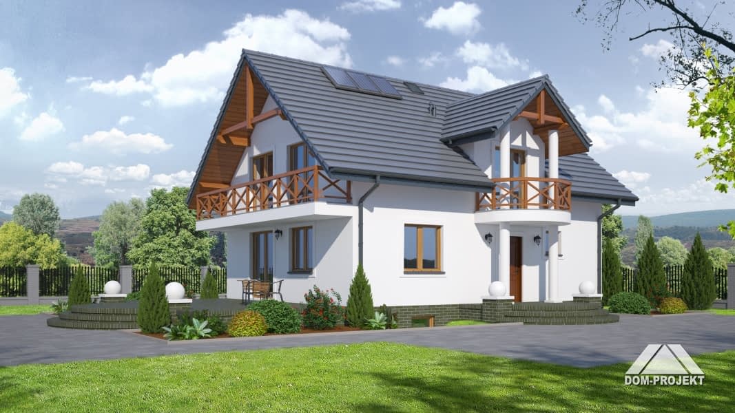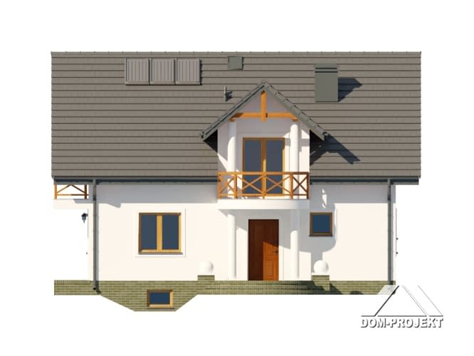Wygodny dom – sześć pokoi, dwie łazienki, kotłownia w piwnicy. Na parterze duża kuchnia z jadalnią łączy się z salonem. W salonie kominek i wyjście na taras. Pokój, łazienka, wiatrołap, garderoba, schody na poddasze. Na poddaszu cztery pokoje ( trzy z balkonem) i wygodna łazienka. W piwnicach pomieszczenia gospodarcze. Liczne wersje projektu.Rzuty