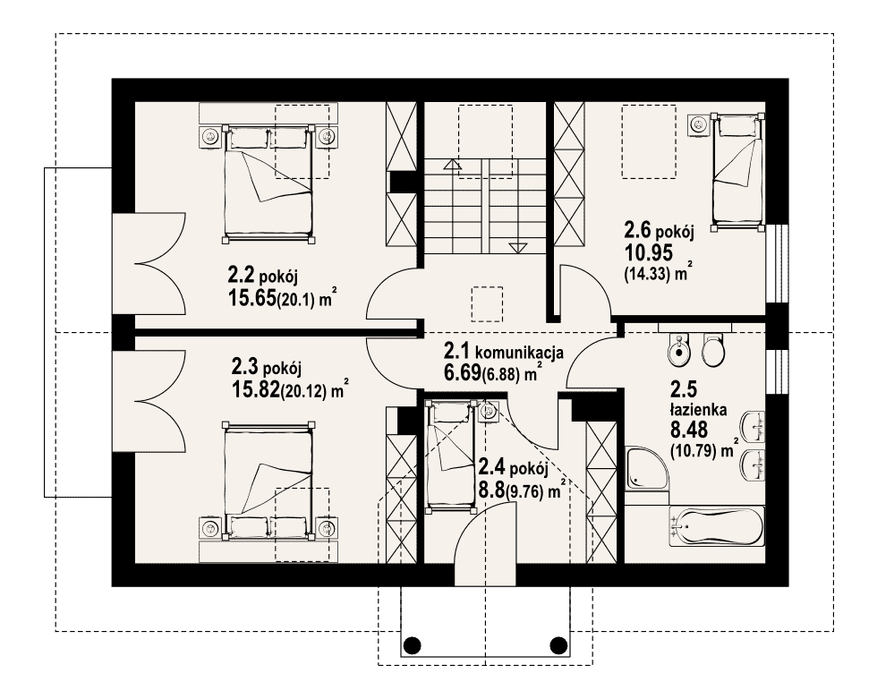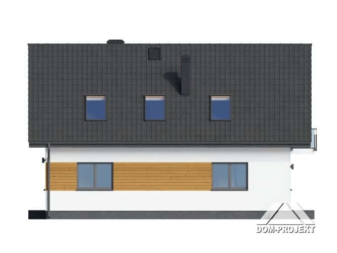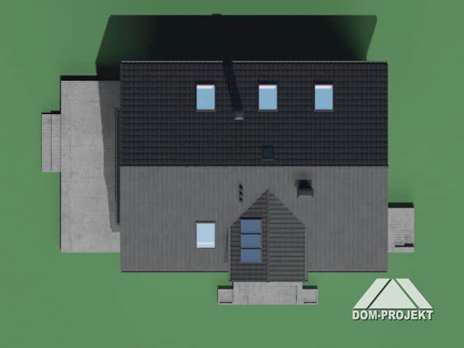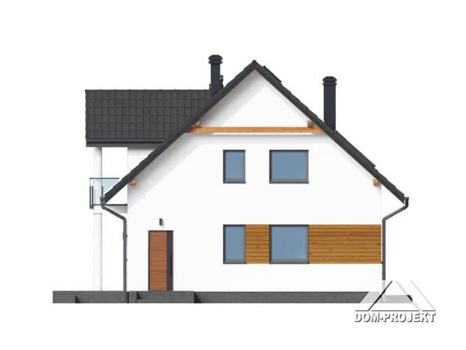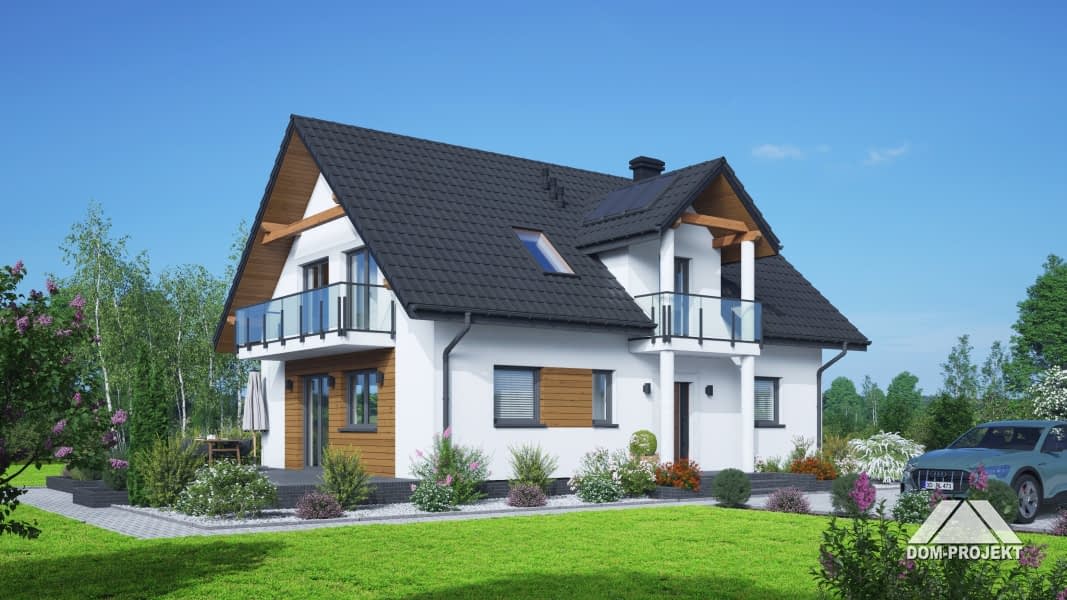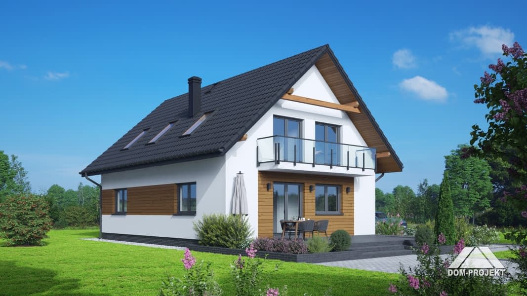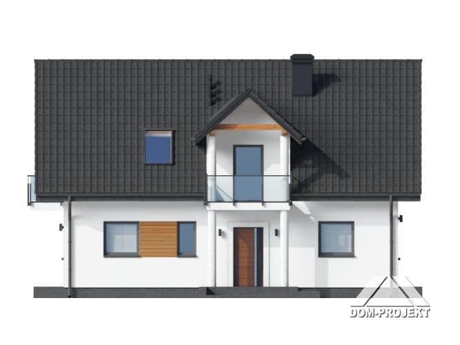 Dom o funkcjonalnym programie.Na parterze salon z aneksem kuchennym, kominkiem i wyjściem na taras i do ogrodu. Pokój, łazienka, wiatrołap i komunikacja. Na poddaszu cztery pokoje (trzy z balkonem) i wygodna łazienka. Atutem domu jest prosty układ funkcjonalny pozwalający na swobodną aranżację pomieszczeń. Liczne wersje projektu.Rzuty