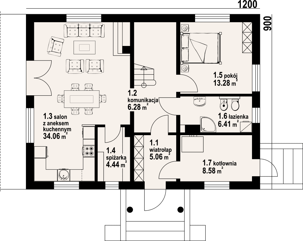 - 1.3 - salon z aneksem kuchennym34.06 m²