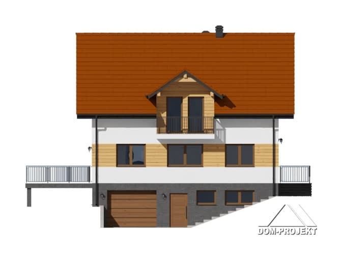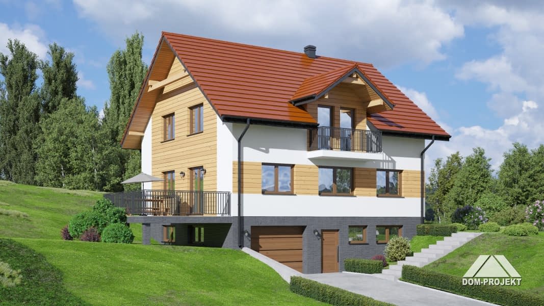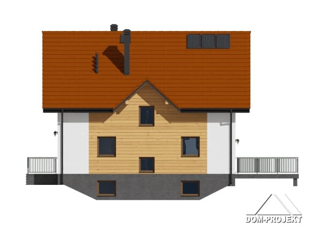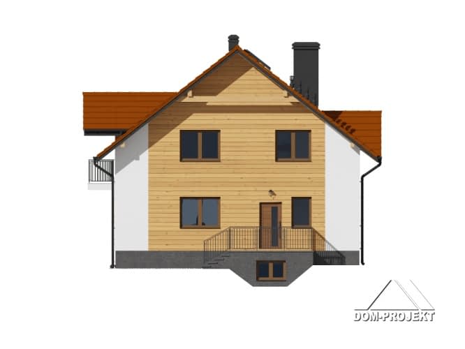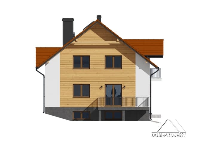 Dom z poddaszem użytkowym. Podpiwniczony. Na parterze duży salon z kominkiem, wyjściem na taras i przejściem do dużej kuchni. Wiatrołap, łazienka, komunikacja. Na poddaszu trzy pokoje, łazienka, komunikacja. W podpiwniczeniu garaż, dwie piwnice, kotłownia i komunikacja.Rzuty