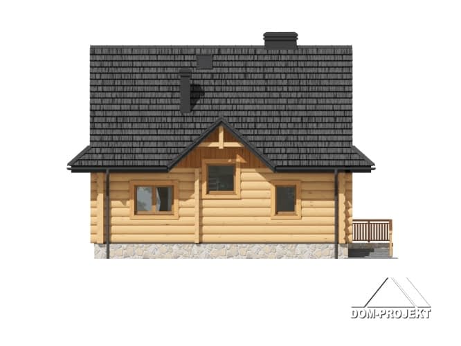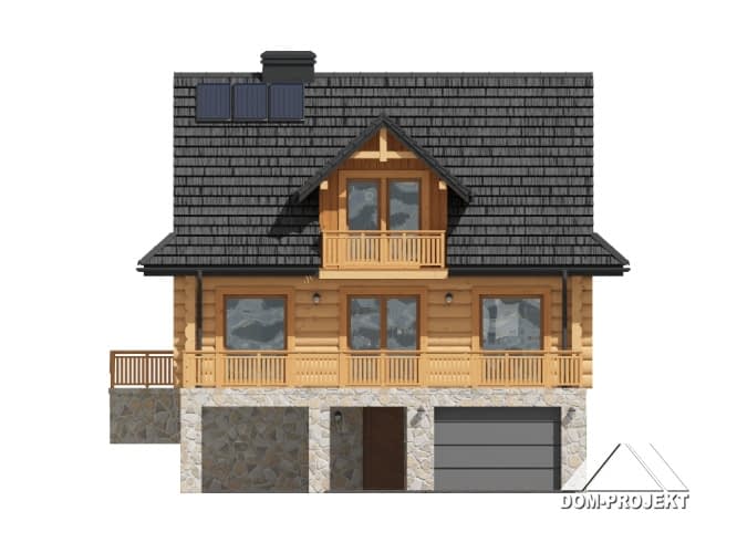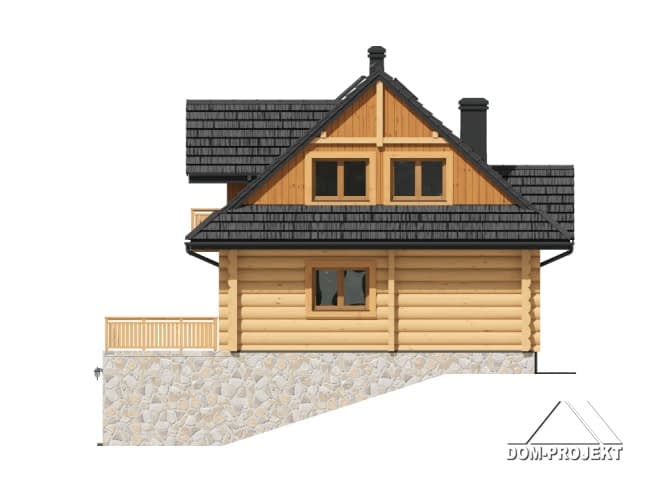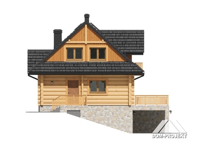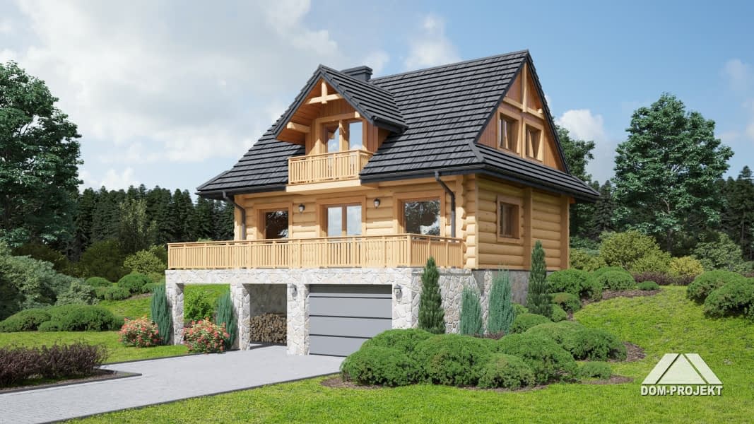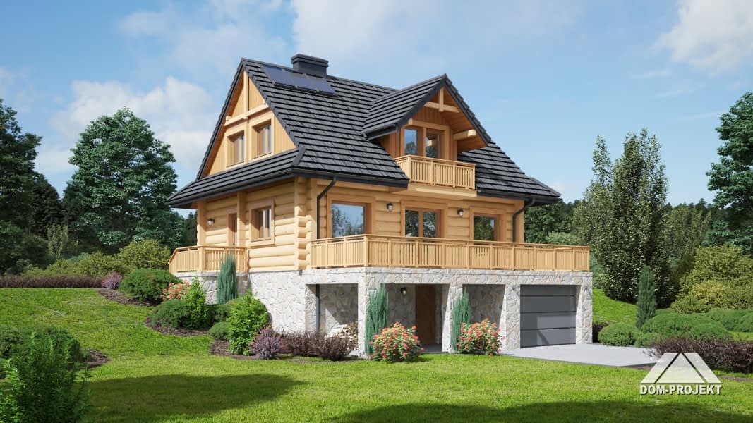 Dom z bali, podpiwniczony. Duży salon z kuchnią, kominkiem i wyjściem na duży taras. Łazienka, komunikacja i wiatrołap. Na poddaszu trzy wygodne pokoje, duża i wygodna łazienka, komunikacja oraz balkon. W piwnicach garaż, pomieszczenia gospodarcze, pralnia, kotłownia i komunikacja. Zwarta bryła budynku i dach dwuspadowy sprzyjają szybkiej i łatwej budowie i niskim kosztom eksploatacji.Rzuty