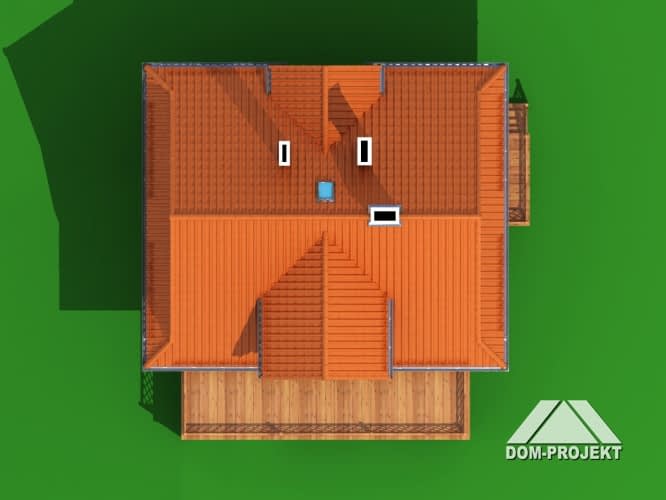 Dom na działkę ze spadkiem terenu. Wyjątkowo duży taras, a pod nim miejsce na samochód pod łukami. W piwnicach pomieszczenia gospodarcze, a także kuchnia letnia i pomieszczenie wypoczynkowe z wyjściem do ogrodu. Na parterze duży salon z aneksem kuchennym, kominkiem i wyjściem na taras, łazienka, wiatrołap i schody. Na poddaszu trzy sypialnie i duża łazienka. Liczne wersje projektu w tym wersja drewniana z bali.Rzuty