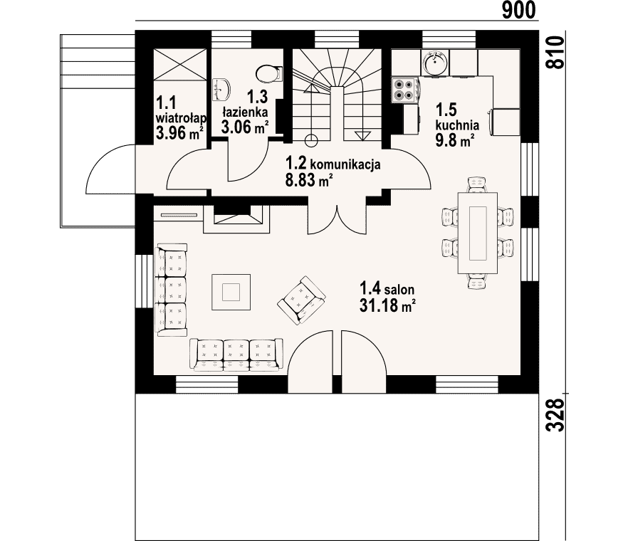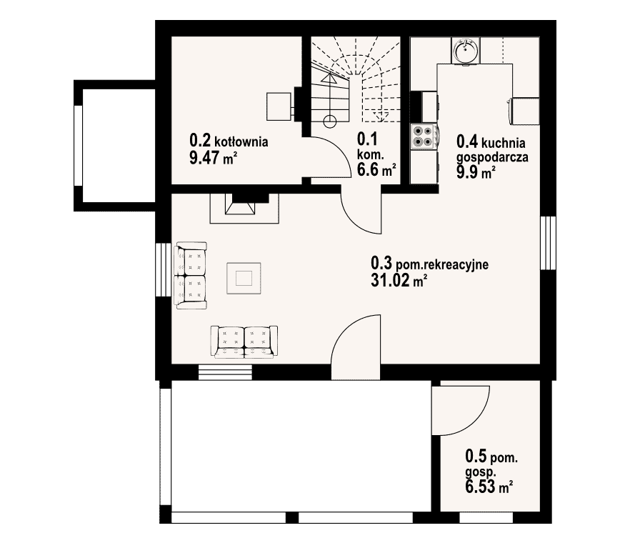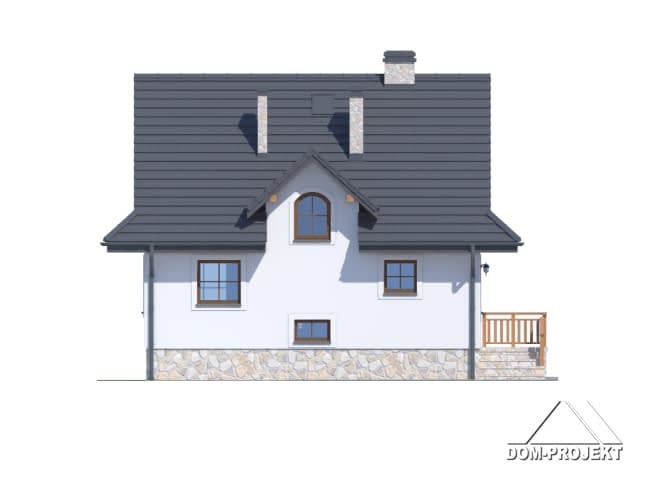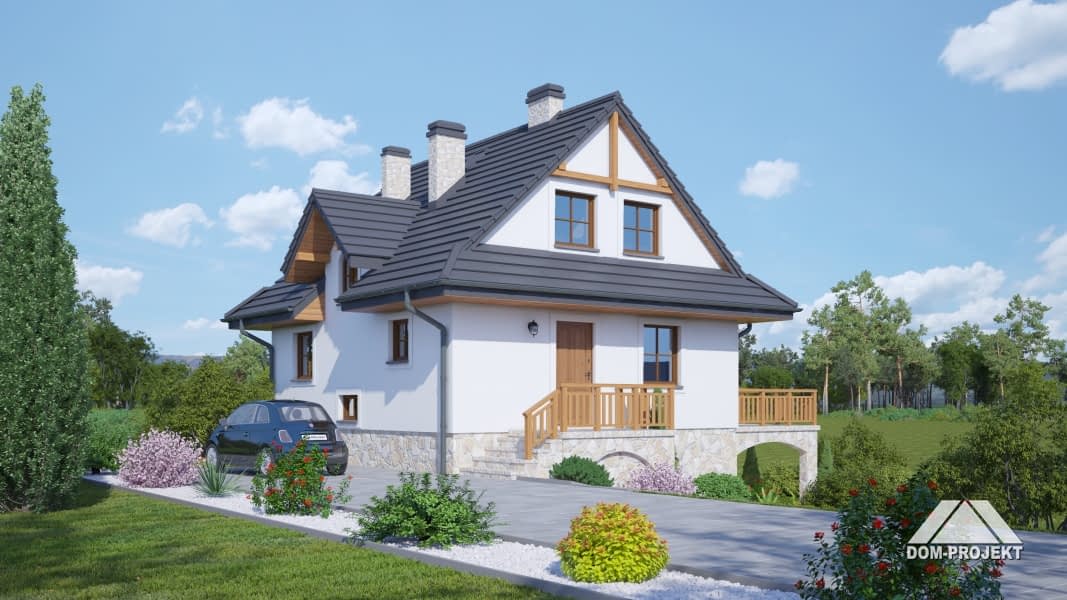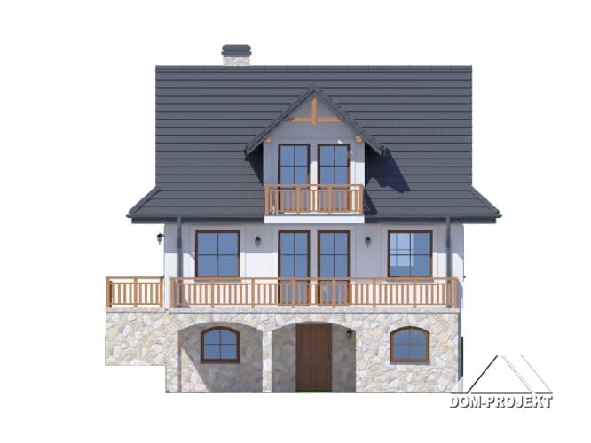 Dom podpiwniczony z poddaszem mieszkalnym. Na parterze duży salon z aneksem kuchennym, kominkiem i wyjściem na duży taras. Wiatrołap, komunikacja. Na poddaszu trzy pokoje, łazienka, balkon i komunikacja. W piwnicach pomieszczenie rekreacyjne, kuchnia gospodarcza, pomieszczenie gospodarcze, kotłownia i komunikacja. Zwarta bryła budynku i duże tarasy. Dom idealny do usytuowania na działkach ze spadkiem terenu.Rzuty