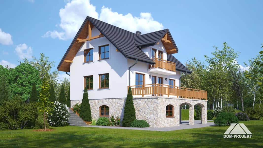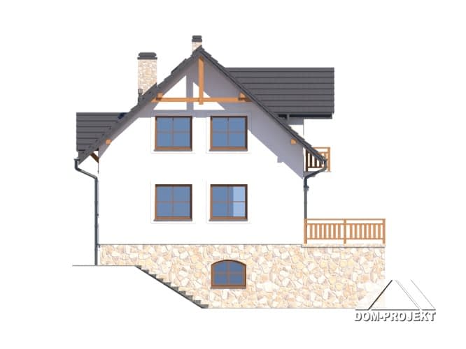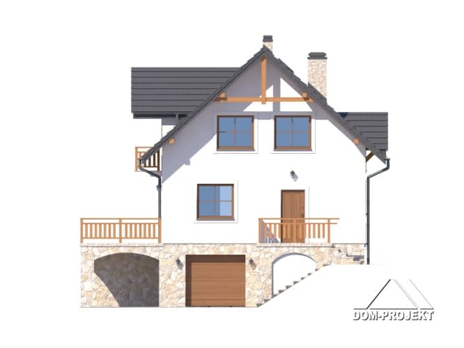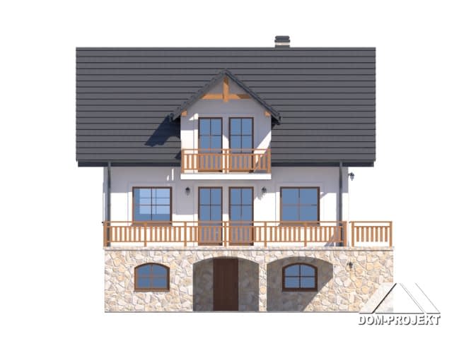 Dom podpiwniczony, idealnie nadający się do realizacji na działce ze spadkiem terenu. Na parterze przestronny salon z aneksem kuchennym, kominkiem i wyjściem na bardzo duży taras. Ponadto wiatrołap, łazienka i komunikacja. Na poddaszu trzy wygodne pokoje, duża łazienka i balkon. W piwnicach garaż, kotłownia, pralnia, pom. piwniczne i gospodarcze. Zwarta bryła budynku sprzyja szybkiej i taniej budowie i niskim kosztom eksploatacji.Rzuty
