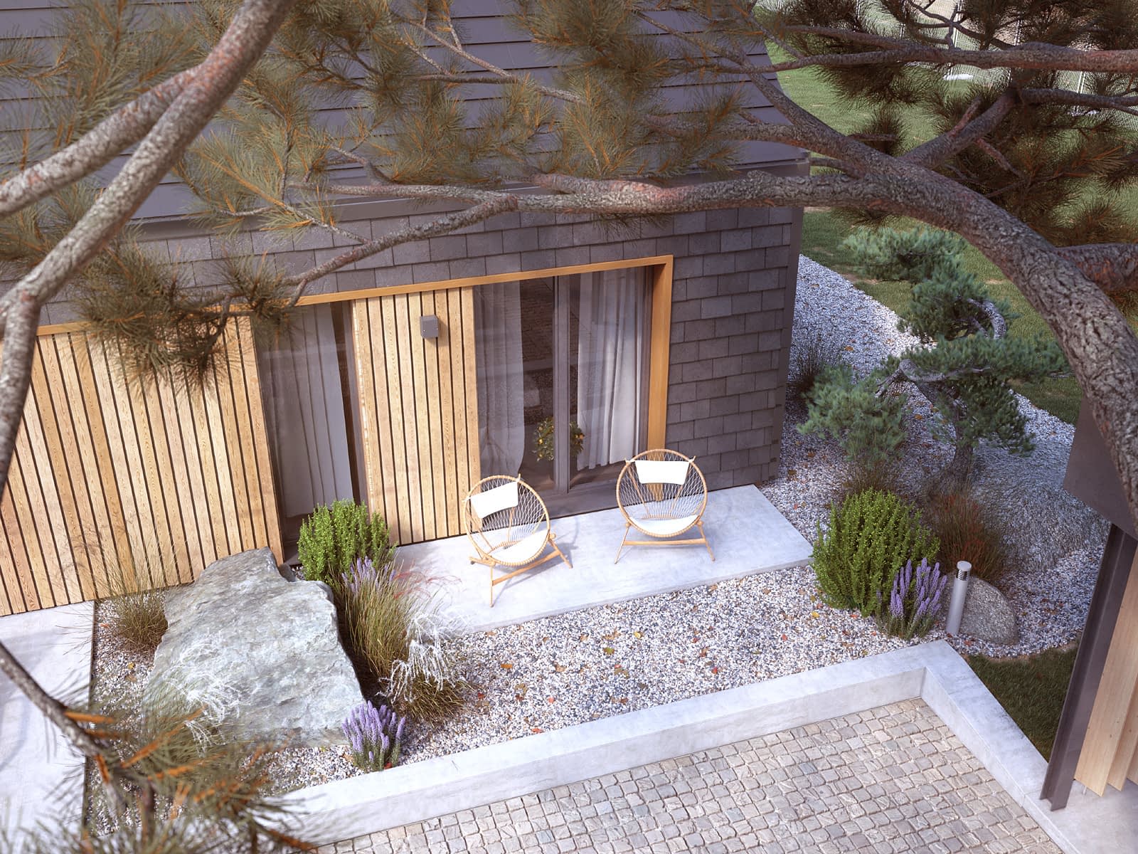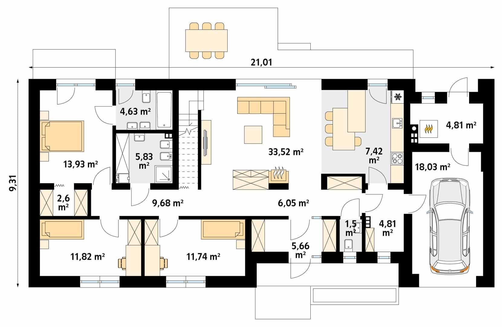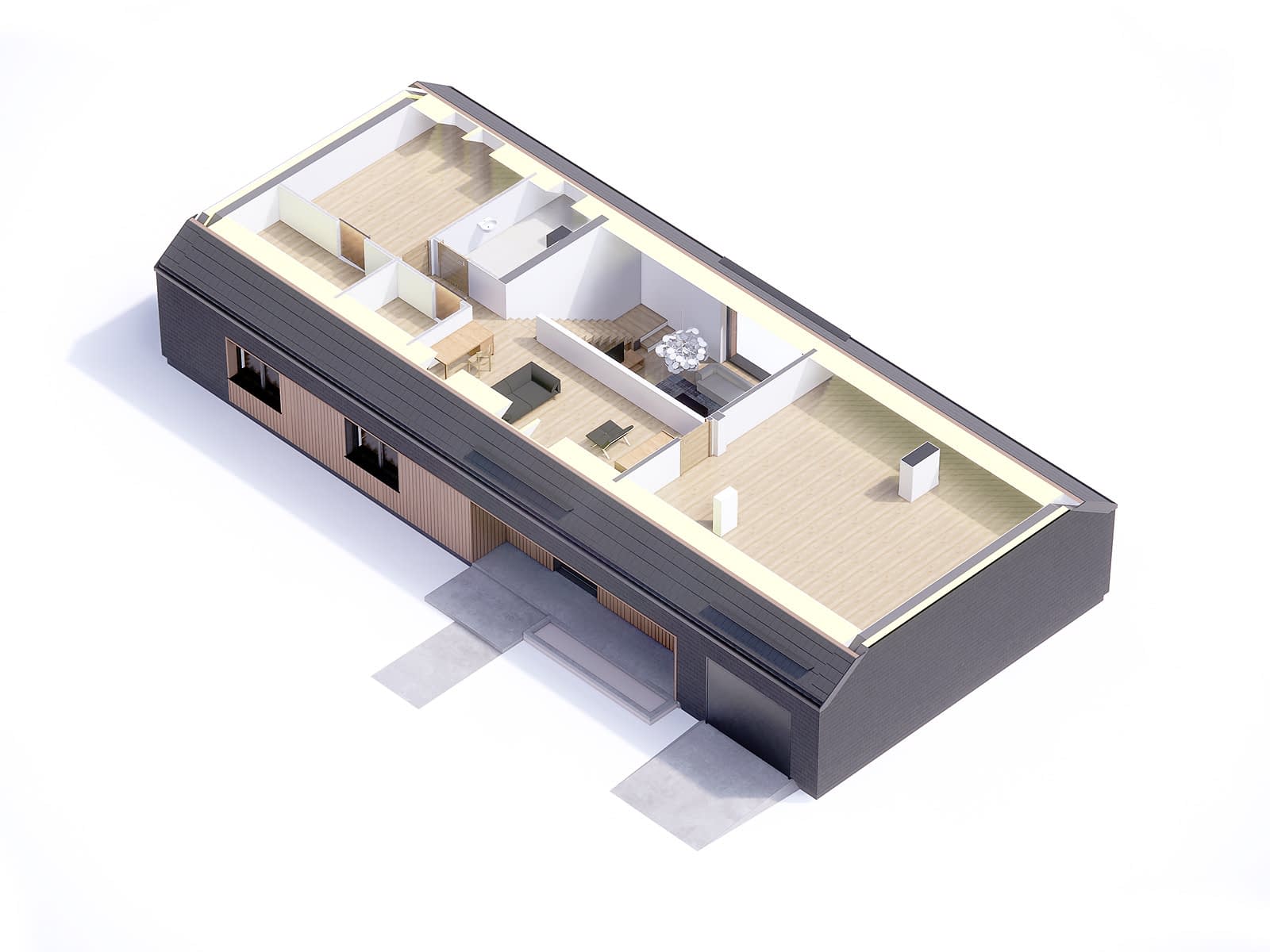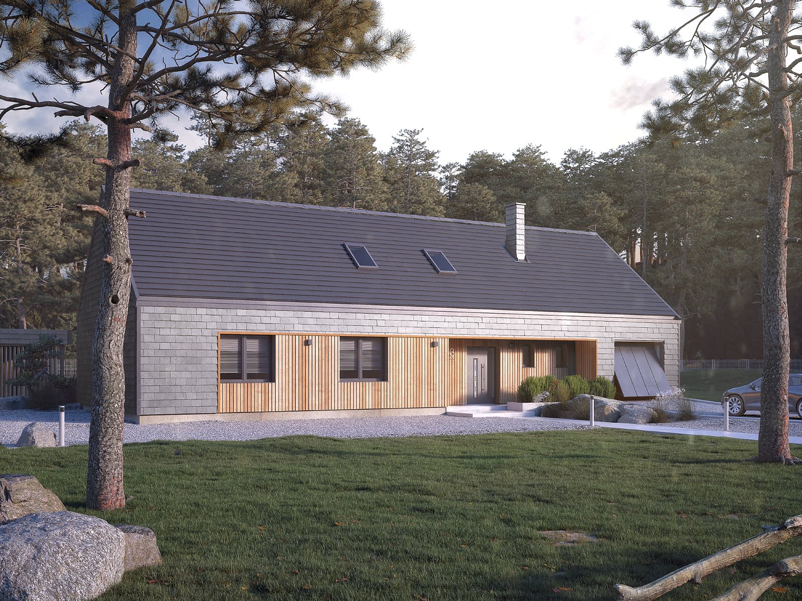 Jemioła 3 została zaprojektowana jako dom dla 4-osobowej rodziny, w którym istnieje możliwość zwiększenia liczby pokoi. Przestrzeń na poddaszu może zostać w przyszłości zaadaptowana np. jako dodatkowe sypialnie, pracownie, biblioteka, czy pokoje hobby. Część dzienną stanowi salon, który spójnie łączy się z kuchnią i jadalnią. Charakterystycznym elementem tej przestrzeni są liczne przeszklenia, które podkreślają otwartą przestrzeń z antresolą. W części prywatnej domu znajdują się trzy sypialnie oraz łazienka. Głowna sypialnia gospodarzy posiada dodatkowo łazienkę oraz garderobę. Dom może funkcjonować jako parterowy, z możliwością późniejszej adaptacji poddasza. W razie potrzeby istnieje możliwość przeprojektowania garażu, by mieścił 2 stanowiska parkingowe.Konstrukcja