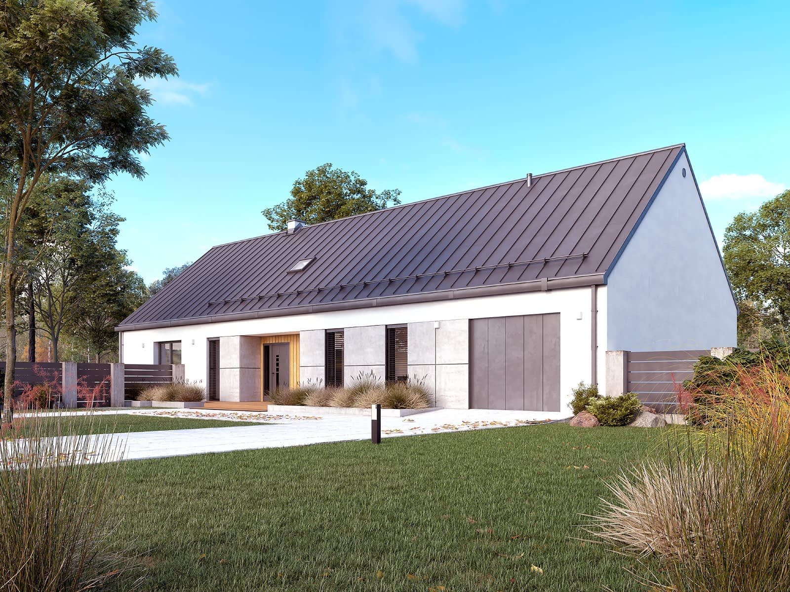 Ściany: 1-warstwowe - beton komórkowy 48cm, Stropy: lekkie płyty prefabrykowane, Dach: blacha na rąbek stojący Ruukki Classic,Rzuty