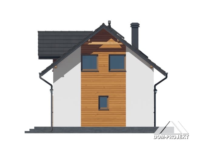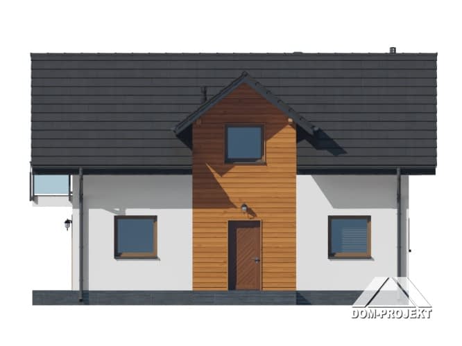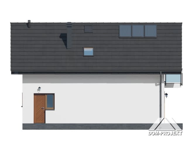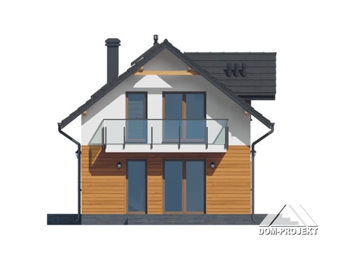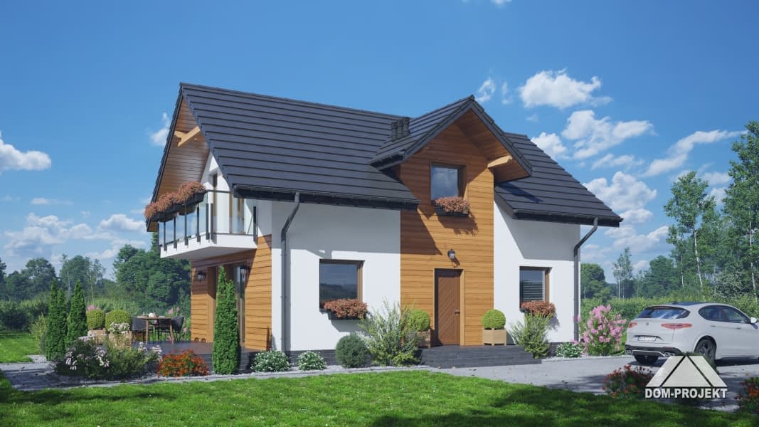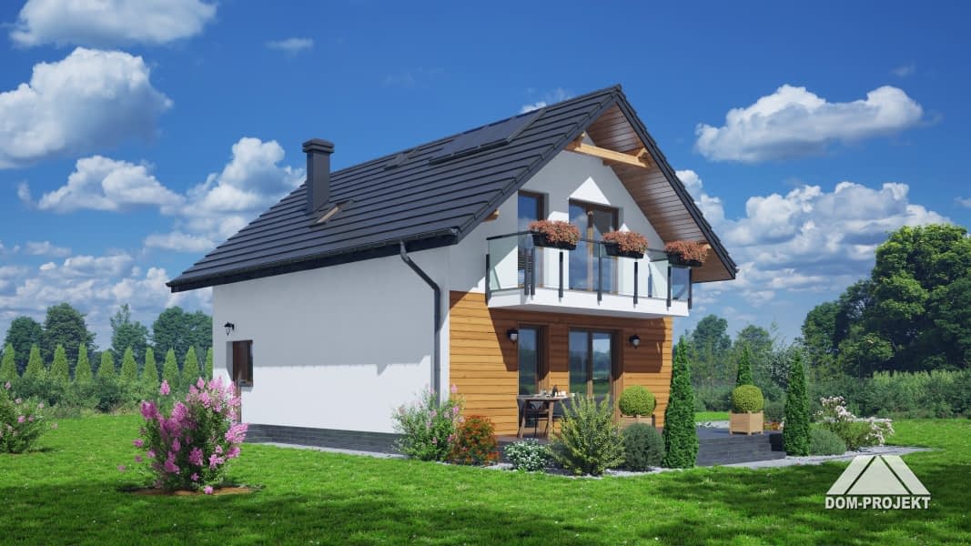 Dom z poddaszem użytkowym. Na parterze salon z aneksem kuchennym, wyjściem na taras i schodami na poddasze. Pokój do pracy, wiatrołap, wc, kotłownia. Na poddaszu cztery pokoje, łazienka, komunikacja oraz balkon dostępny z dwóch pokoi. Zwarta bryła budynku oraz dach dwuspadowy sprzyjają szybkiej i taniej budowie oraz niskim kosztom eksploatacji.Rzuty