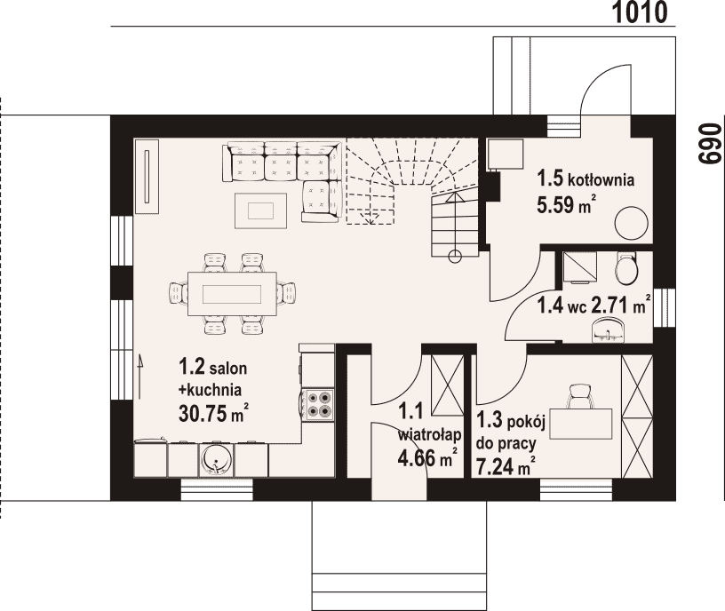 - 1.2 - kuchnia, salon30.75 m²