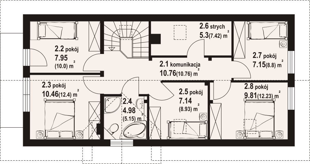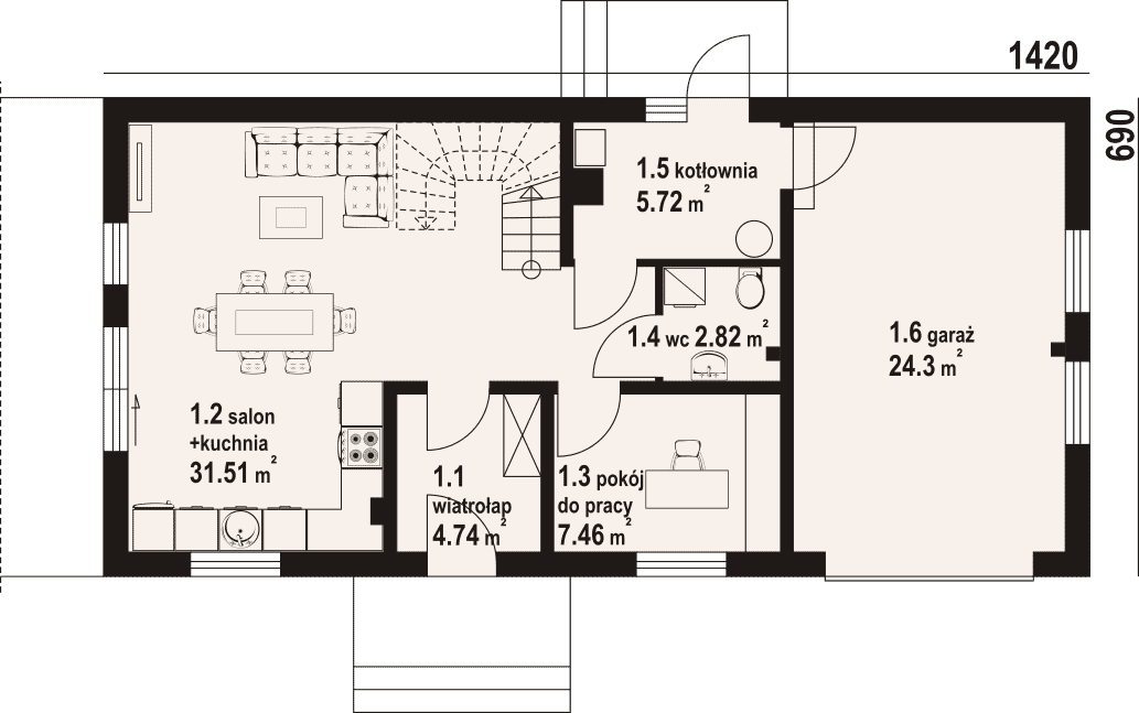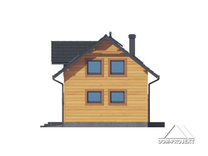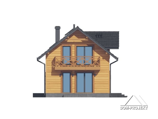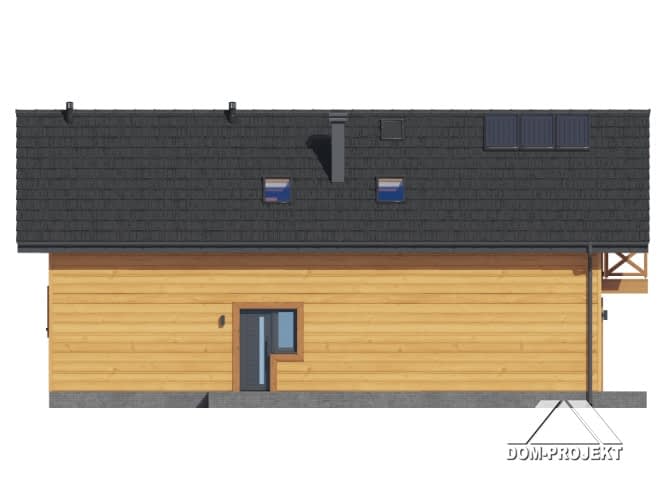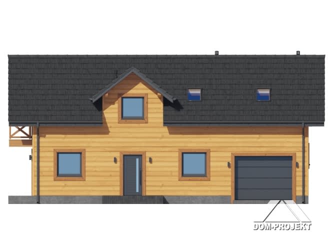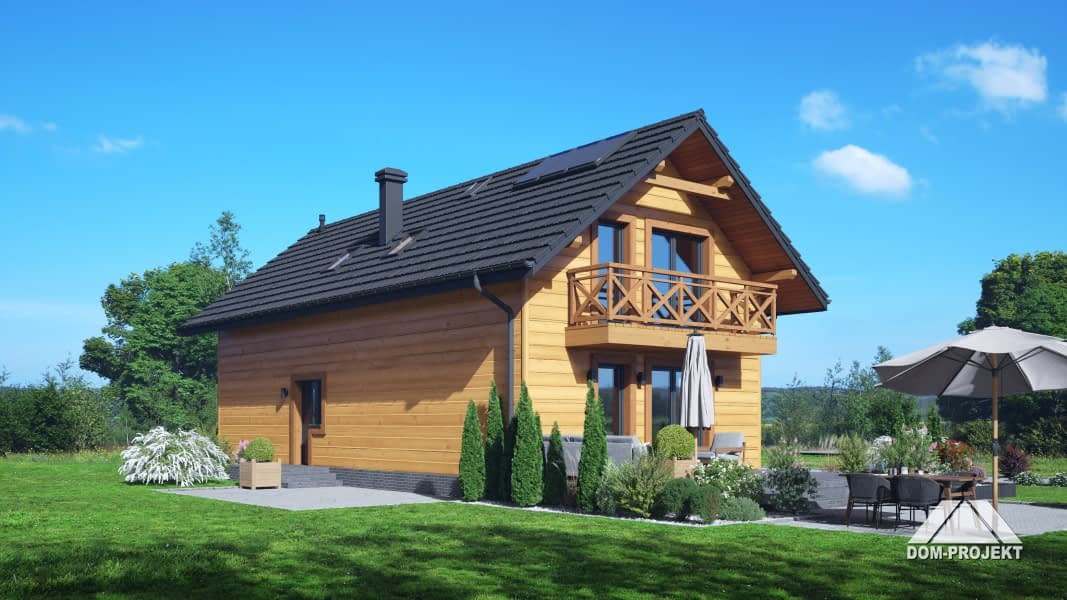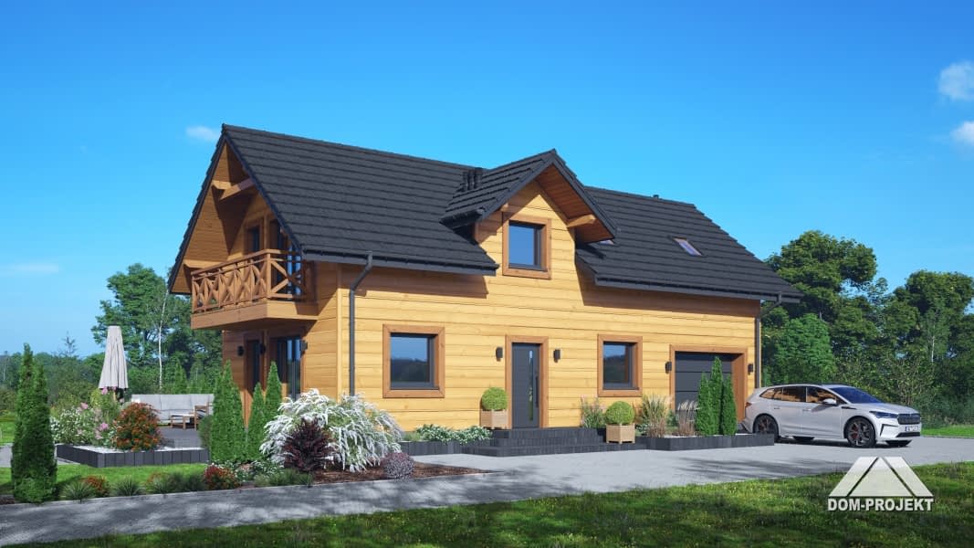 Dom w konstrukcji szkieletu drewnianego. Na parterze salon z aneksem kuchennym, wyjściem na taras i schodami na poddasze. Wiatrołap, pokój do pracy, wc, kotłownia, garaż. Na poddaszu pięć pokoi, łazienka, komunikacja, strych. Balkon dostępny z dwóch pokoi. Zwarta bryła budynku oraz dach dwuspadowy sprzyjają szybkiej i taniej budowie oraz niskim kosztom eksploatacji.Rzuty