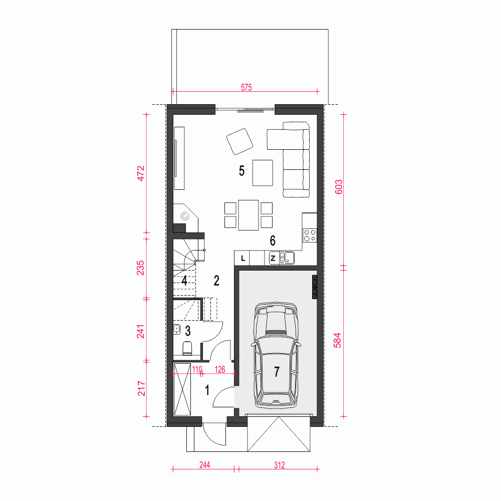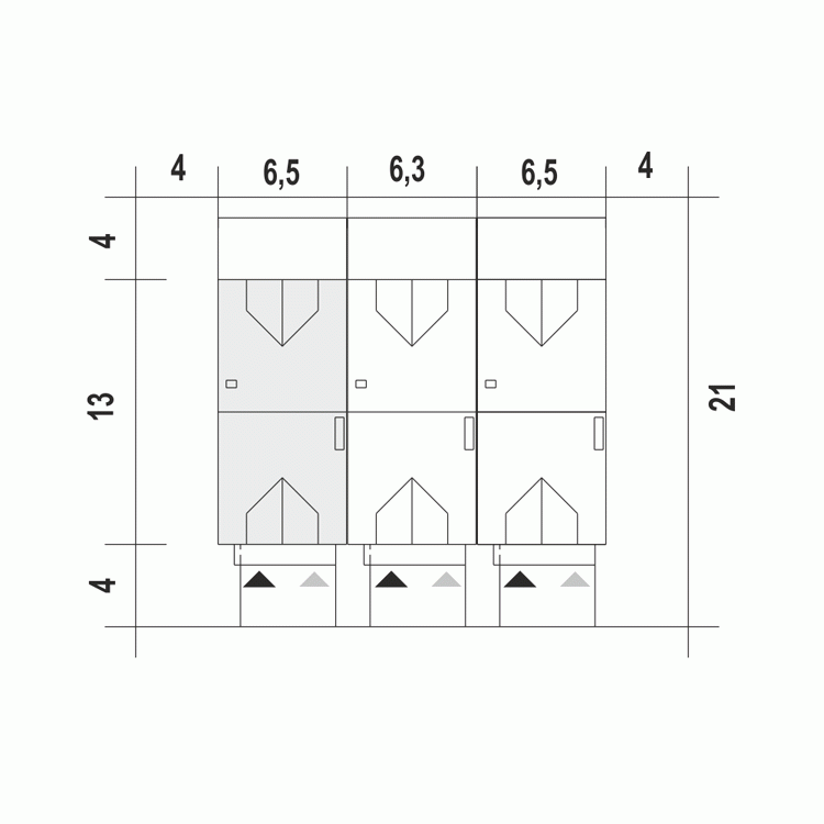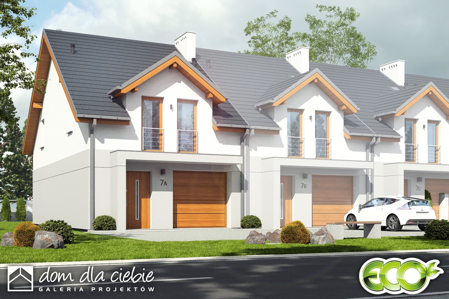 Projekt domu Jukka segment skrajny lewy to atrakcyjny dom parterowy z poddaszem użytkowym w zabudowie szeregowej. Jukka jest projektem idealnym na wąskie działki o bardzo prostej i zwartej formie oraz o niedużej powierzchni użytkowej - blisko 100 m2 - co przekłada się na niski koszt budowy i eksploatacji domu. Projekt Jukka to dom dla 4-5cio osobowej rodziny z wbudowanym garażem, o tradycyjnej konstrukcji ścian z pustaków ceramicznych izolowanych styropianem. Dach dwuspadowy zaprojektowano jako podniesiony na ściankach kolankowych o wysokości 1,14 m. Funkcja domu obejmuje część ogólnodostępną na parterze i prywatną na poddaszu. Na parterze zaprojektowano część wejściową z wiatrołapem, holem, WC i schodami schodami prowadzącymi na poddasze. Dalej mamy przewidziany ustawny salon z kominkiem i jadalnią, oraz wygodny aneks kuchenny. Z salonu dostaniemy się na przydomowy ogród. Na poddasz zlokalizowana na poddaszu, obejmuje przedpokój z którego dostaniemy się do trzech sypialni, wspólnej łazienki oraz pomieszczenia pralni z piecem gazowym c.o. Jukka szeregówka, to projekt domu o parametrach energooszczędnych, o prostej konstrukcji i zwartej formie. To idealny projekt do realizacji inwestycji deweloperskich.