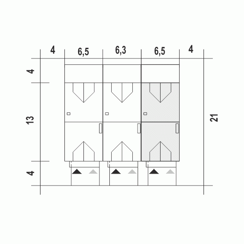 Projekt domu Jukka segment skrajny prawy to atrakcyjny dom parterowy z poddaszem użytkowym w zabudowie szeregowej. To idealny projekt na wąskie działki o bardzo prostej i zwartej formie oraz o niedużej powierzchni użytkowej - blisko 100 m2 - co przekłada się na niski koszt budowy i eksploatacji domu. Projekt Jukka to dom dla 4-5cio osobowej rodziny z wbudowanym garażem, o tradycyjnej konstrukcji ścian z pustaków ceramicznych izolowanych styropianem. Dach dwuspadowy zaprojektowano jako podniesiony na ściankach kolankowych o wysokości 1,14 m. Funkcja domu obejmuje część ogólnodostępną na parterze i prywatną na poddaszu. Na parterze zaprojektowano część wejściową z wiatrołapem, holem, WC i schodami schodami prowadzącymi na poddasze. Dalej mamy przewidziany ustawny salon z kominkiem i jadalnią, oraz wygodny aneks kuchenny. Z salonu dostaniemy się na przydomowy ogród. Na poddasz zlokalizowana na poddaszu, obejmuje przedpokój z którego dostaniemy się do trzech sypialni, wspólnej łazienki oraz pomieszczenia pralni z piecem gazowym c.o. Jukka szeregówka, to projekt domu o parametrach energooszczędnych, o prostej konstrukcji i zwartej formie. To idealny projekt do realizacji inwestycji deweloperskich.