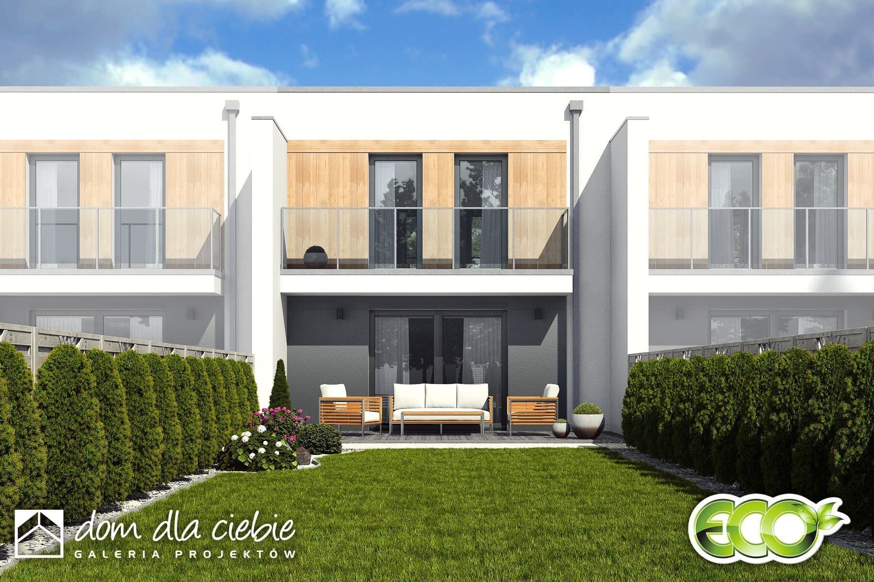 Projekt domu Jukka II w zabudowie szeregowej, to atrakcyjny dom piętrowy z płaskim dachem. To idealny projekt na wąskie działki o bardzo prostej i zwartej formie budynku oraz o niedużej powierzchni użytkowej - około 104 m2 - co przekłada się na niski koszt budowy i niskie koszty eksploatacji domu. Projekt Jukka II zaprojektowany jest dla 4-5cio osobowej rodziny. To dom o tradycyjnej konstrukcji z pustaków ceramicznych izolowanych styropianem, przykryty płaskim dachem. Na funkcję domu składa się część ogólnodostępna i prywatna, zgodnie z podziałem na parter i poddasze. W części ogólnodostępnej zaprojektowano część wejściową z wiatrołapem, holem, WC i schodami prowadzącymi na poddasze. Mamy tu też przewidziany jenostanowiskowy garaż. Dalej mamy zaprojektowany ustawny salon z kominkiem i jadalnią, oraz wygodny aneks kuchenny. Z salonu dostaniemy się na przydomowy ogród. Część prywatna zlokalizowana na poddaszu i obejmuje przedpokój z którego dostaniemy się do 3 sypialni, wspólnej łazienki oraz pomieszczenia pralni z piecem gazowym c.o. Jukka II w zabudowie szeregowej, to projekt domu energooszczędnego, bardzo prostego w realizacji i idealnego dla inwestycji deweloperskich.