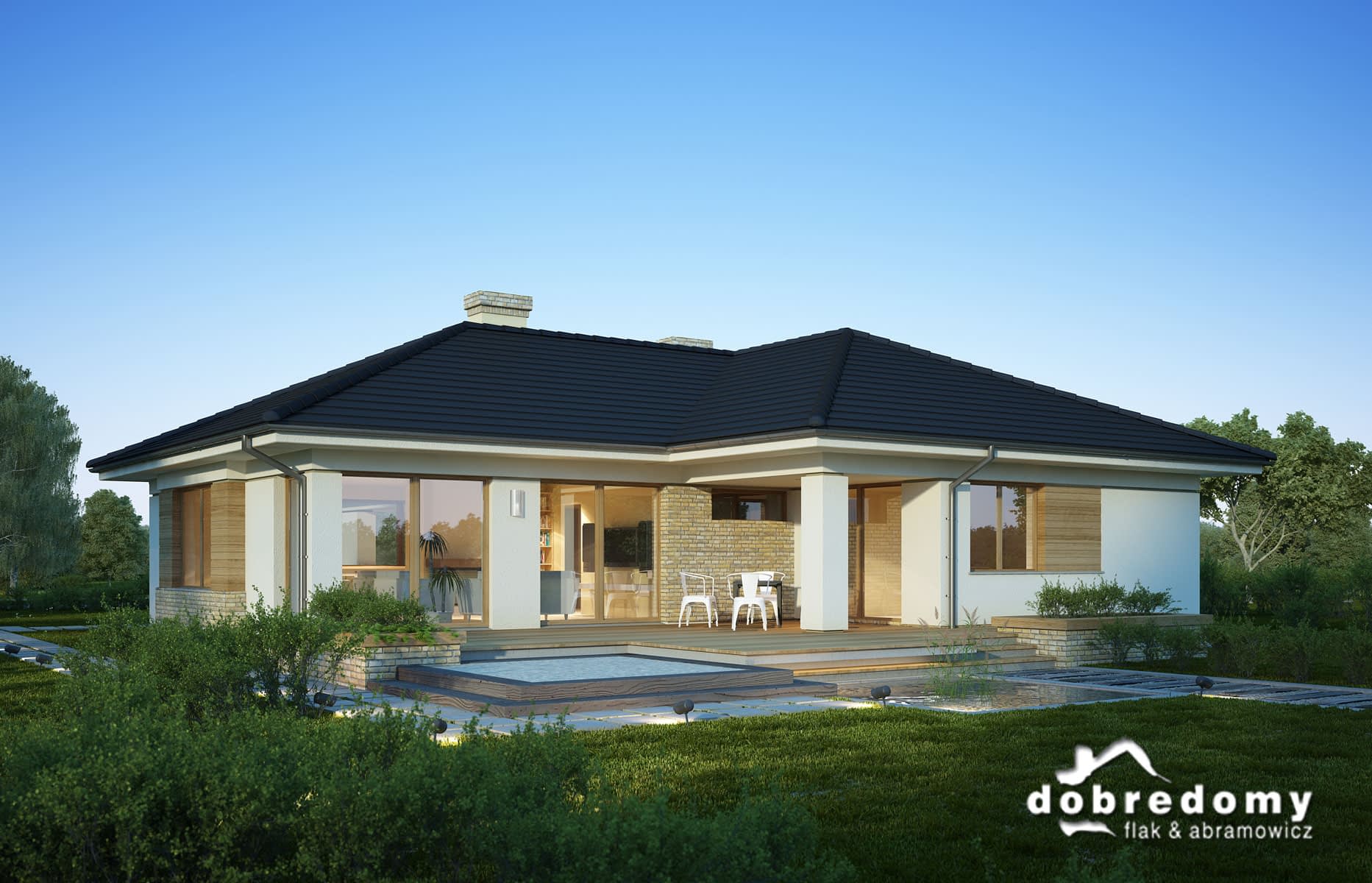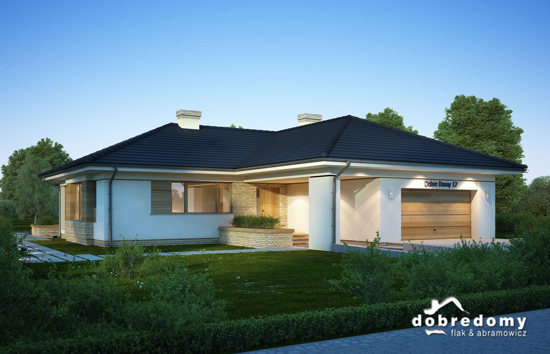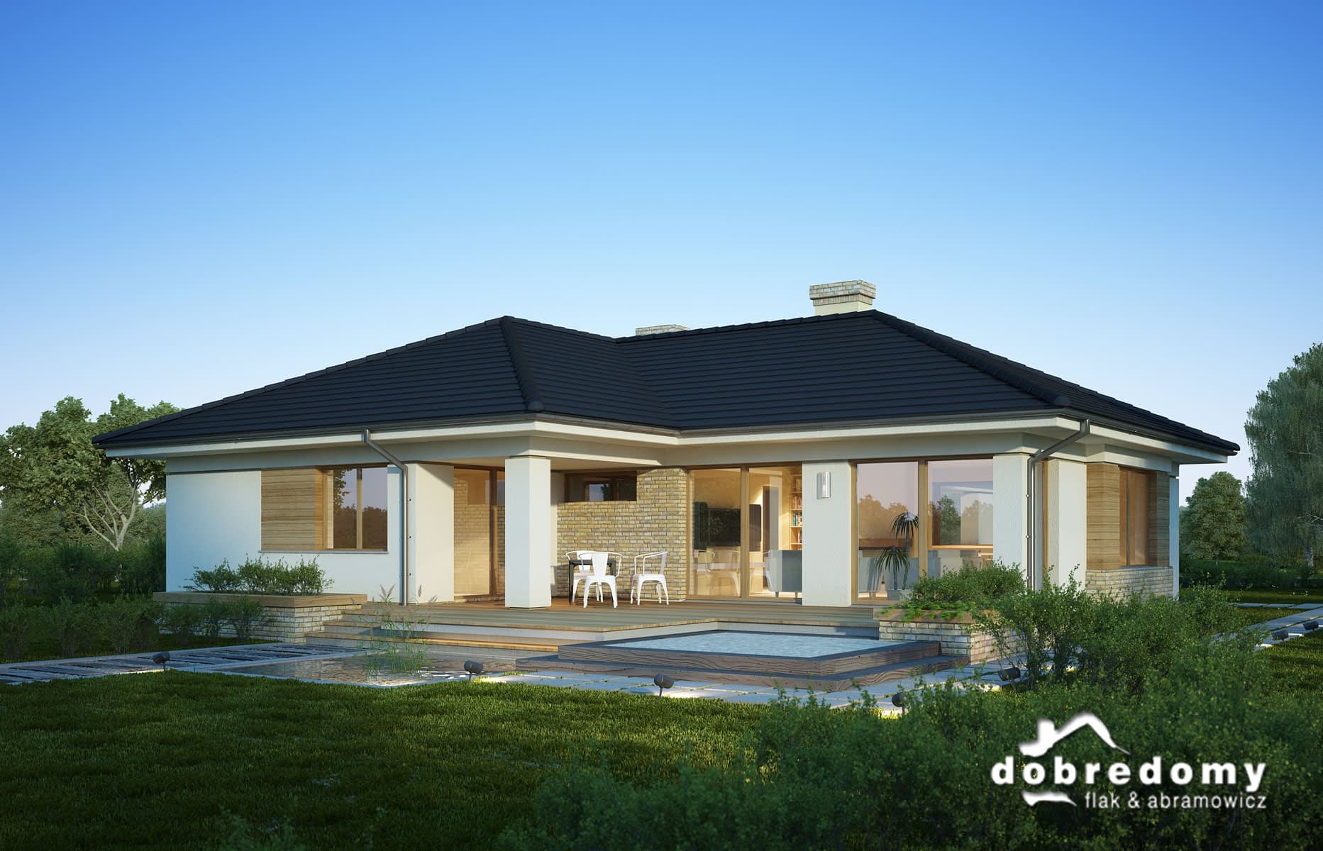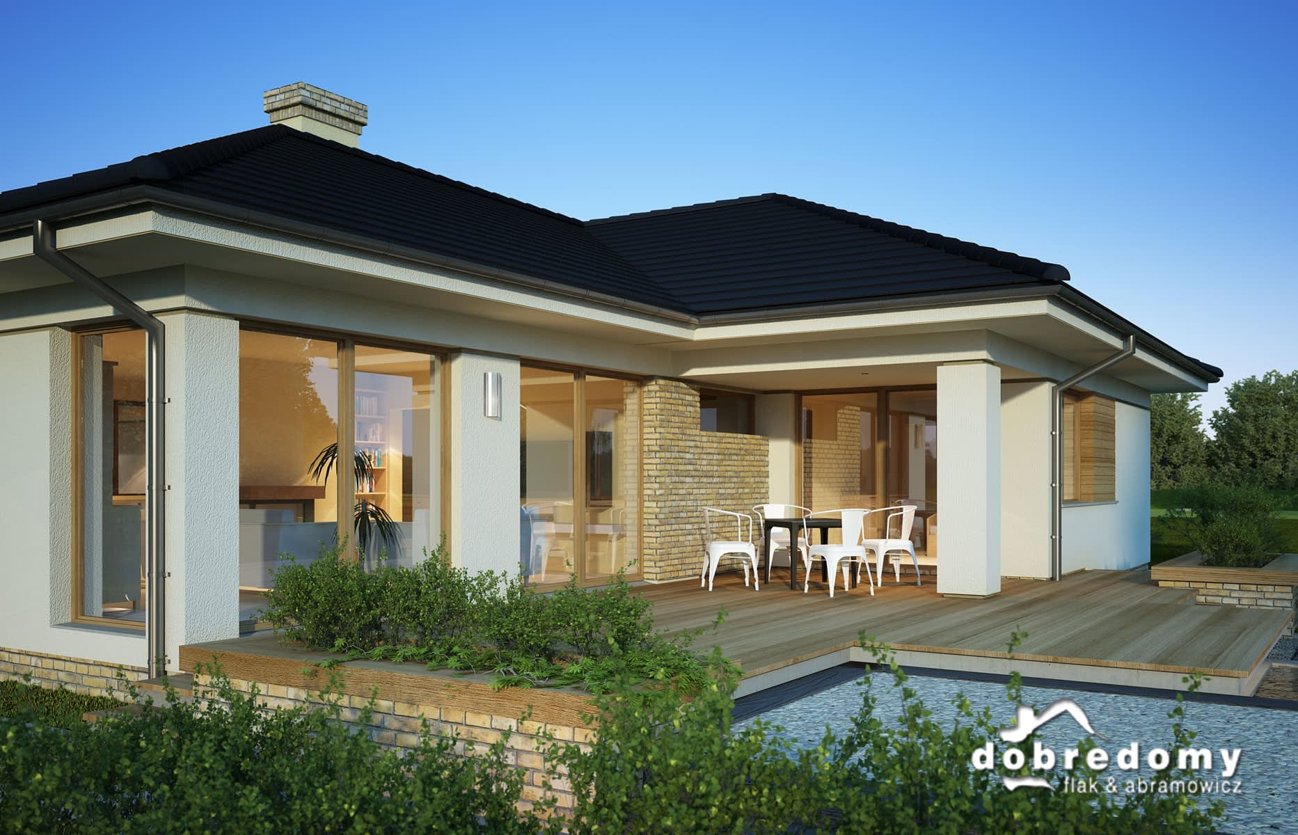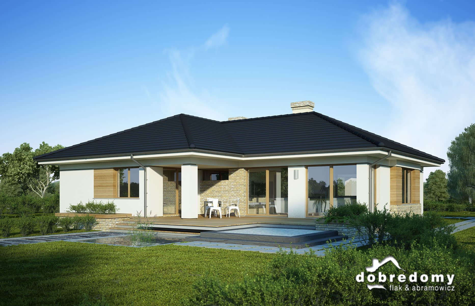 Parterowy dom zaprojektowany dla 4-5 osobowej rodziny. Dom podzielony jest na trzy strefy. Część dzienna to salon z jadalnią, kuchnia z dużą spiżarnią, hall, wiatrołap oraz niewielka łazienka. Część prywatna składa się z trzech sypialni, dużej łazienki oraz korytarza. Część gospodarcza to dwuatnowiskowy garaż oraz pomieszczenie gospodarcze.