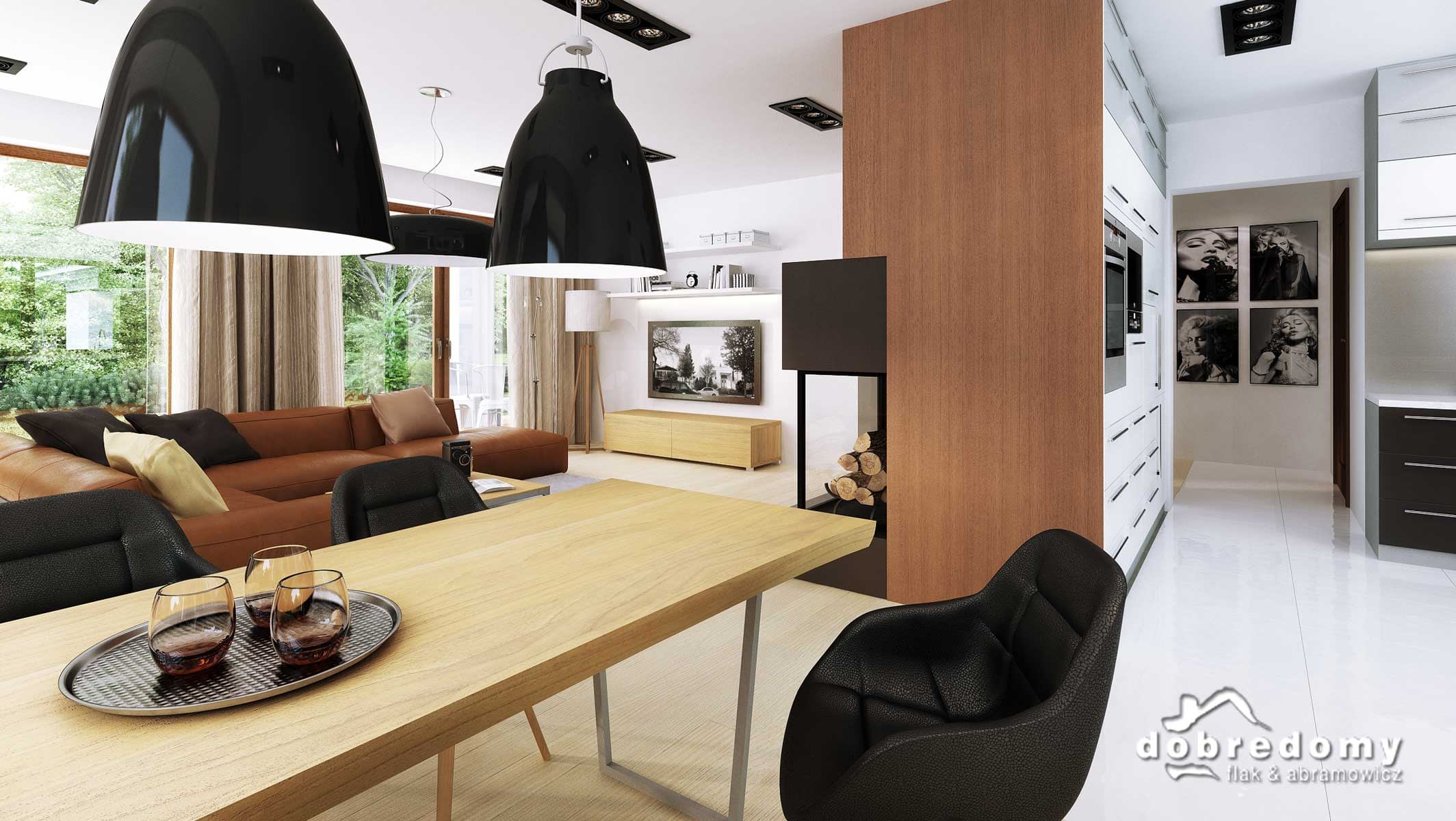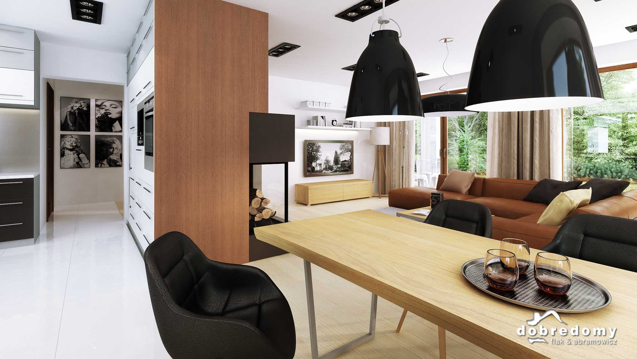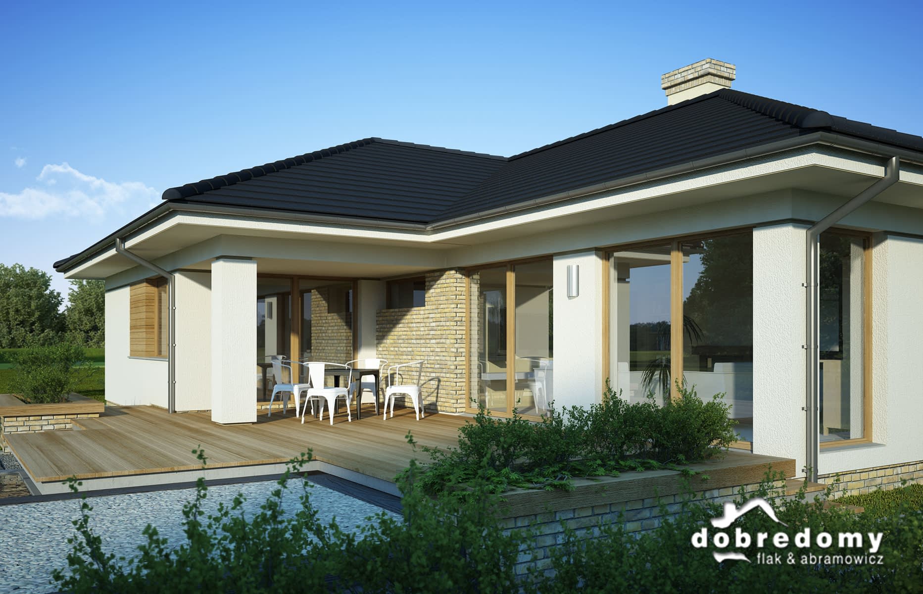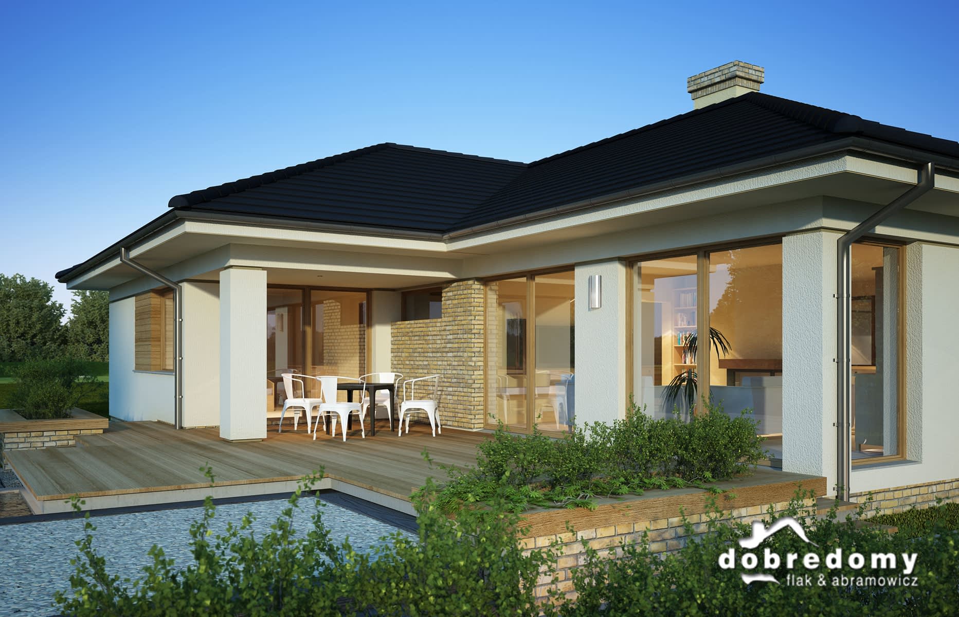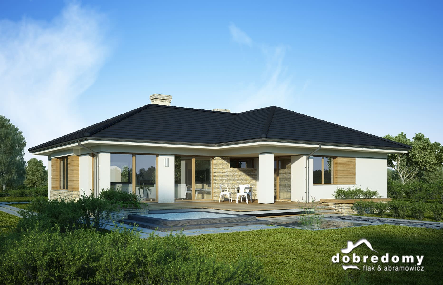 Parterowy dom zaprojektowany dla 4-5 osobowej rodziny. Dom podzielony jest na trzy strefy. Część dzienna to salon z jadalnią, kuchnia z dużą spiżarnią, hall, wiatrołap oraz niewielka łazienka. Część prywatna składa się z trzech sypialni, dużej łazienki oraz korytarza. Część gospodarcza to dwuatnowiskowy garaż oraz pomieszczenie gospodarcze.