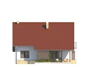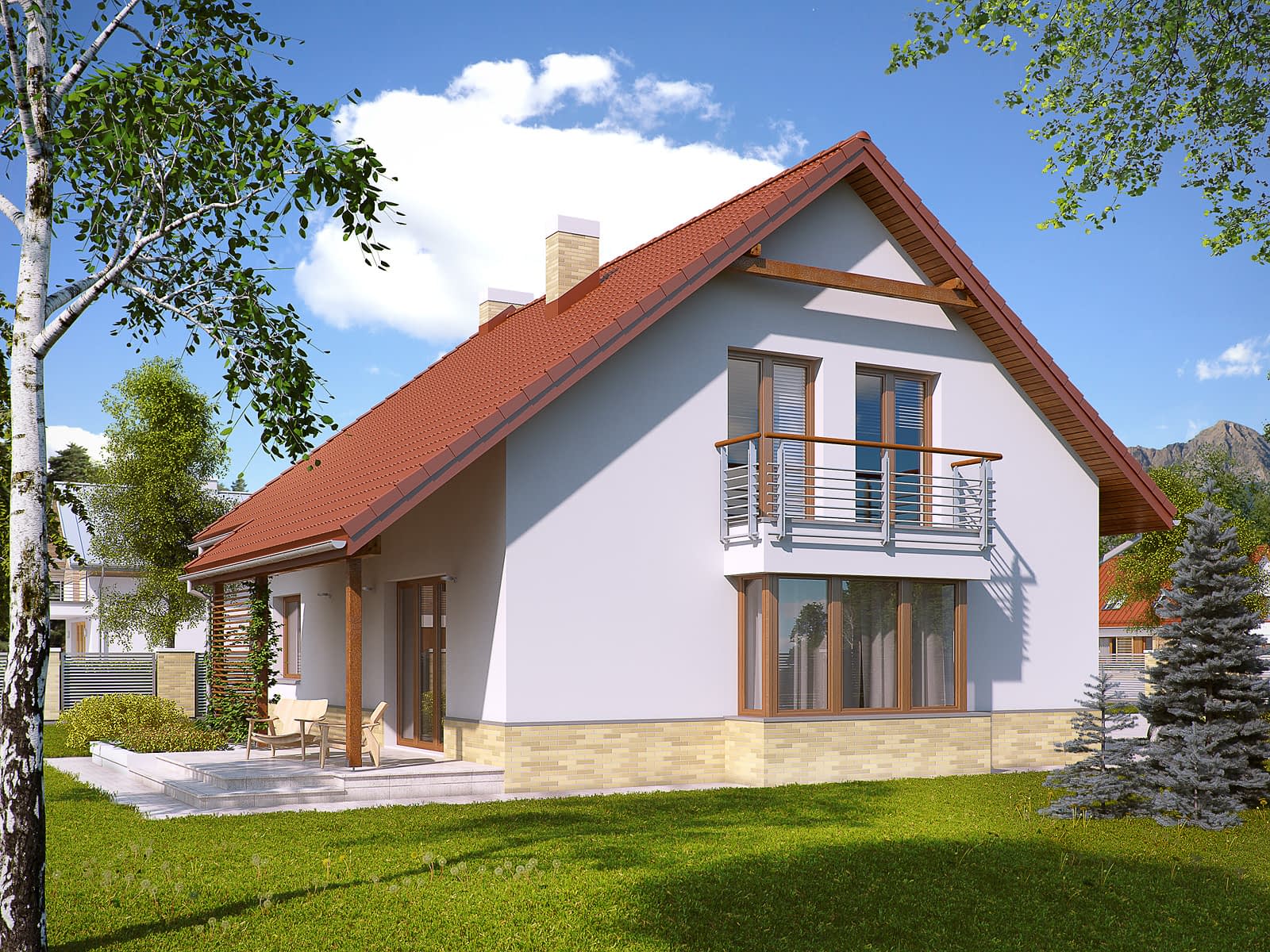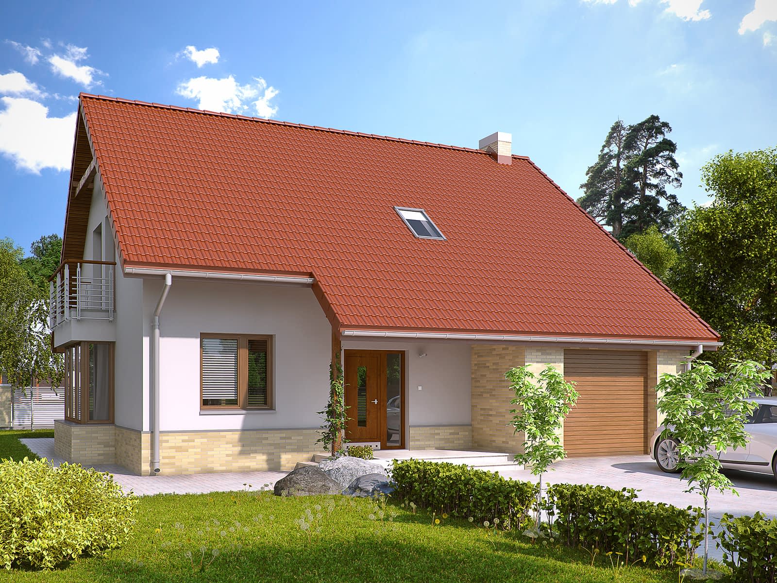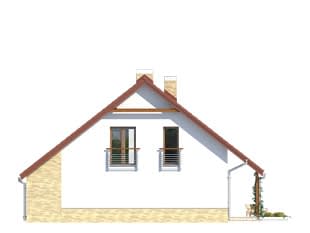 Dom jednorodzinny, wolno stojący, niepodpiwniczony z użytkowym poddaszem, przeznaczony dla 4 - 5-osobowej rodziny. Na parterze zaprojektowano przestronny pokój dzienny z jadalnią i kominkiem, kuchnię ze spiżarnią oraz dodatkowy pokój. Na poddaszu znajdują się trzy sypialnie, łazienka i garderoba. Sypialnie i łazienka są duże i widne - wszystkie doświetlone są oknami znajdującymi się w ścianach szczytowych budynku. Garderobę doświetla okno połaciowe. Dom na niewielkiej powierzchni mieści wygodny program funkcjonalny, posiada prostą bryłę przykrytą dwuspadowym dachem, jedno miejsce garażowe oraz częściowo zadaszony taras.Konstrukcja