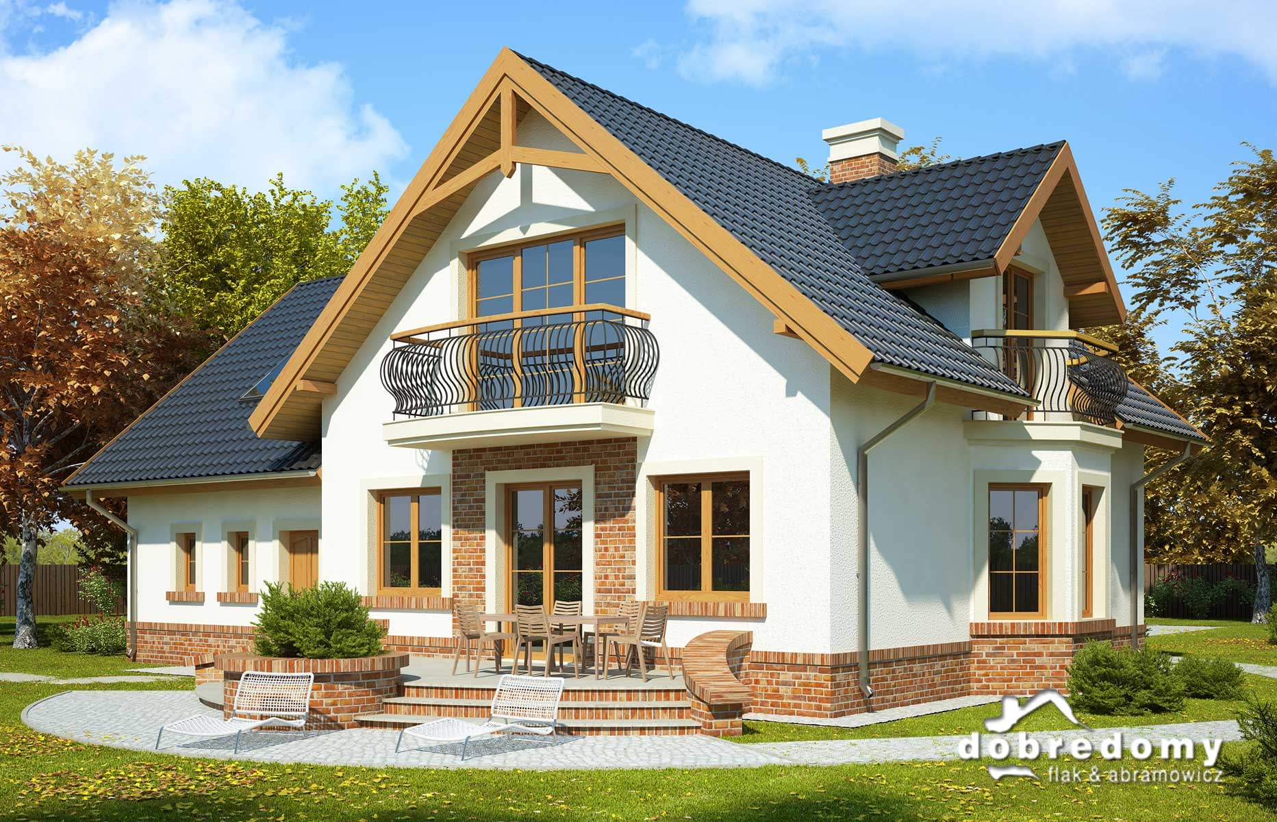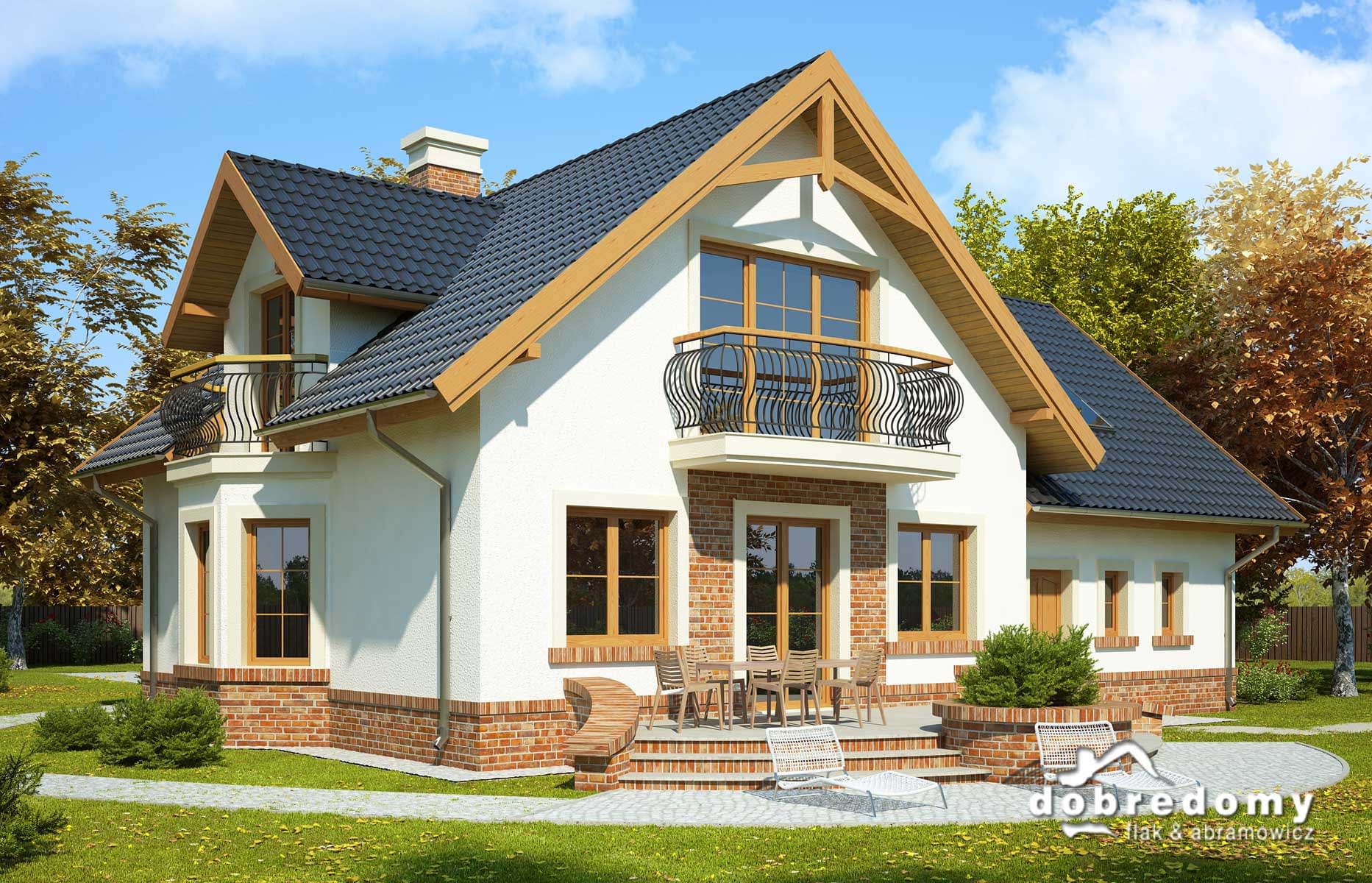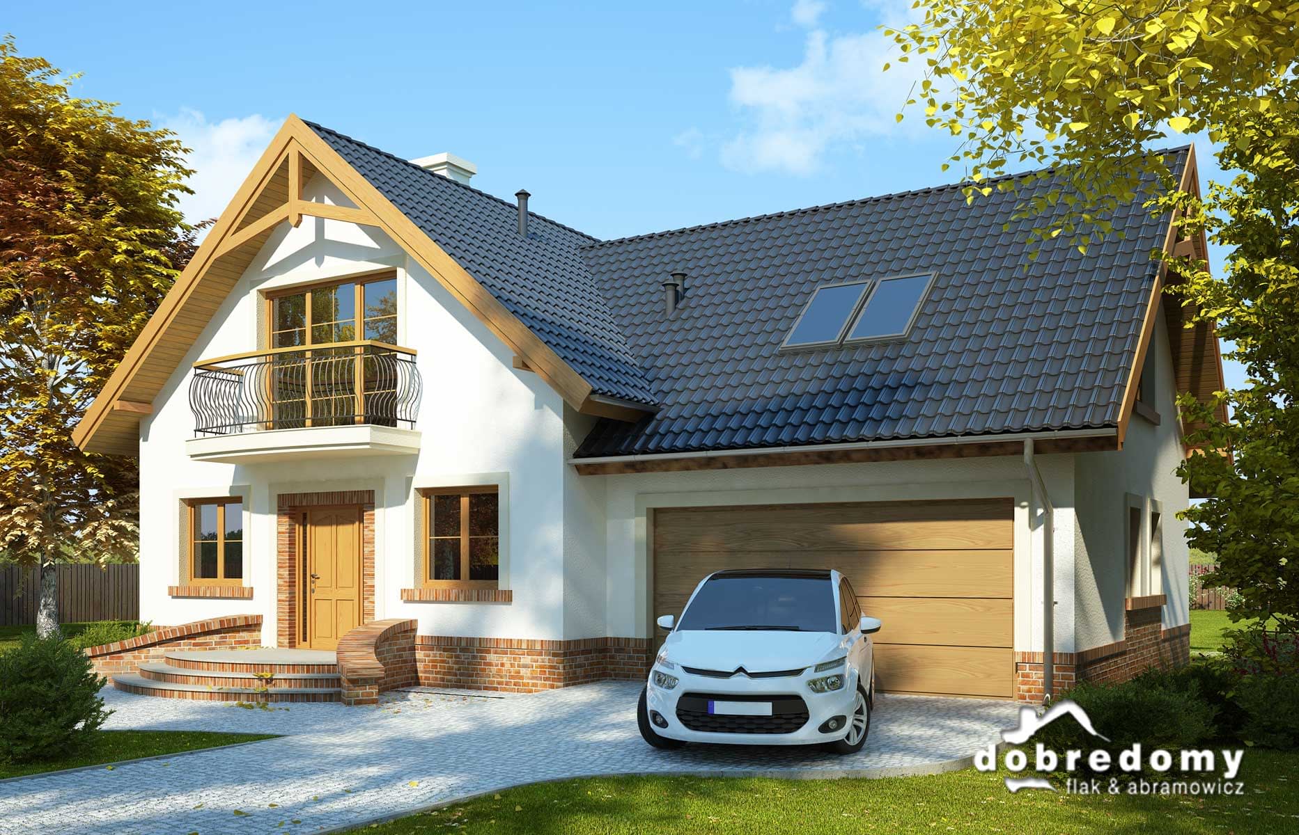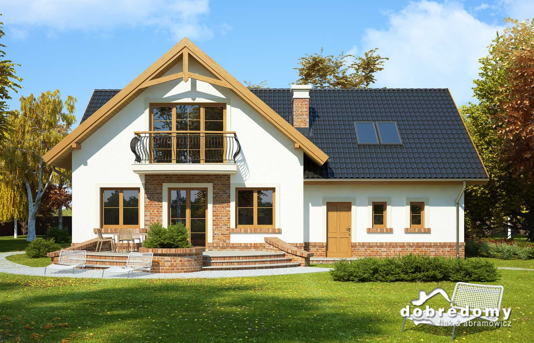 Elewacje pokryte tynkiem strukturalnym w systemie ociepleń Termo Organika oraz okładziną klinkierową. W projekcie zastosowano okna dachowe marki FAKRO. Pokrycie dachu - dachówka ceramiczna lub cementowa CREATON.