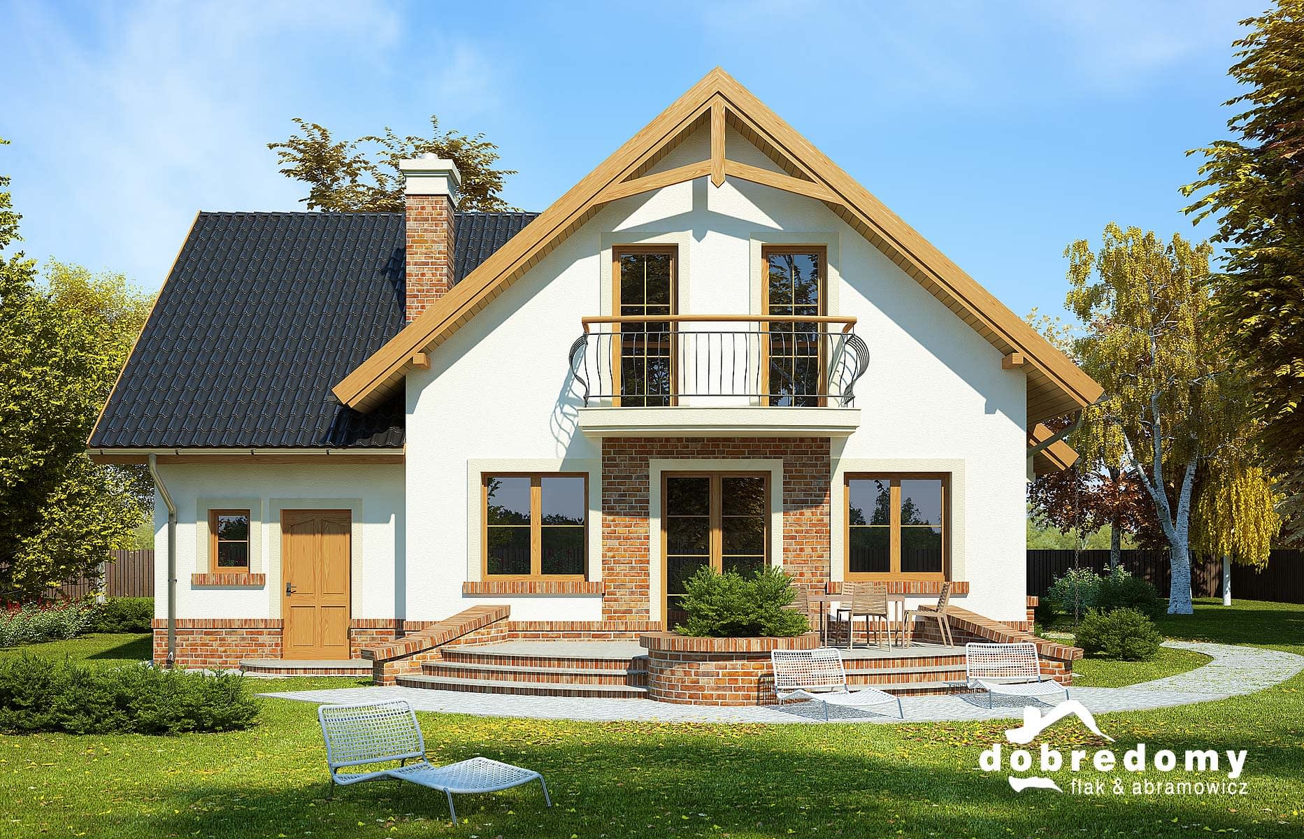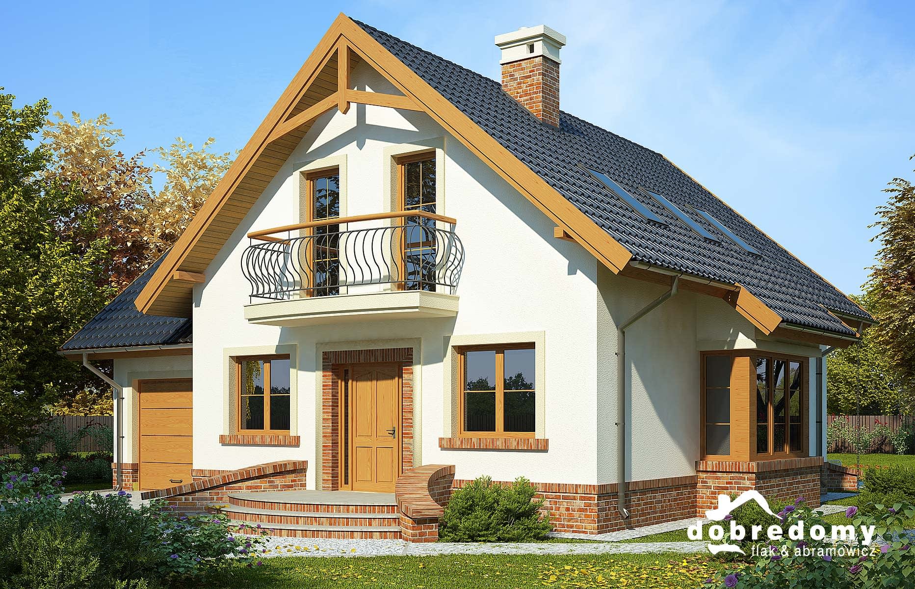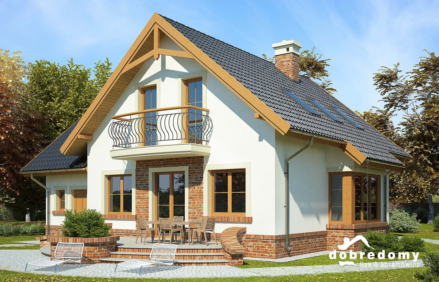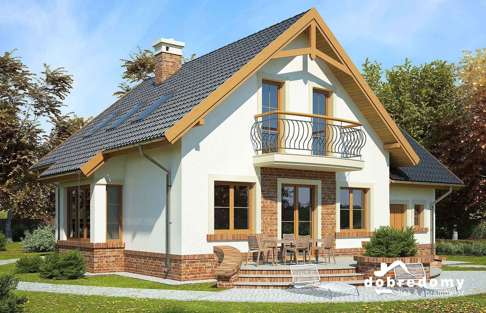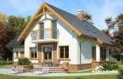 Elewacje pokryte tynkiem strukturalnym w systemie ociepleń Termo Organika oraz okładziną klinkierową. W projekcie zastosowano okna dachowe marki FAKRO. Pokrycie dachu - dachówka ceramiczna lub cementowa CREATON.