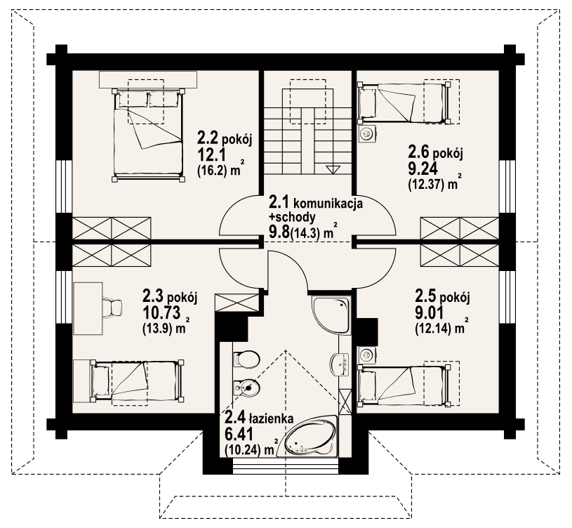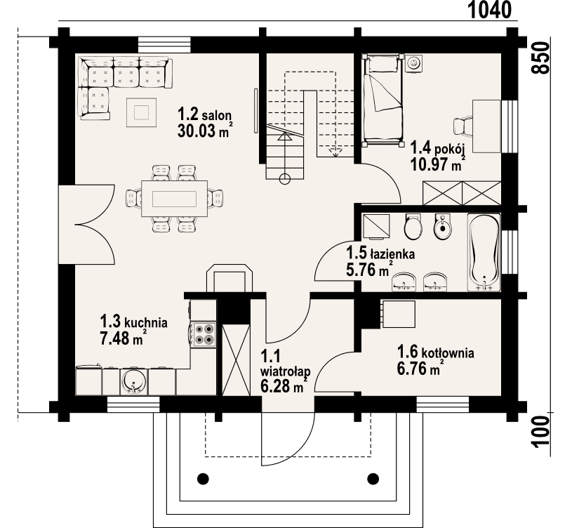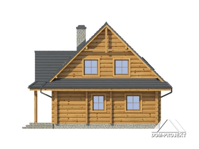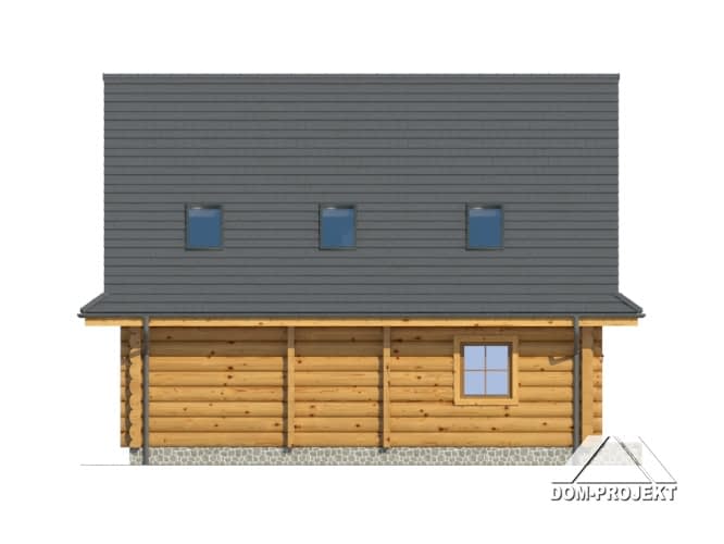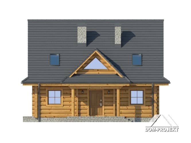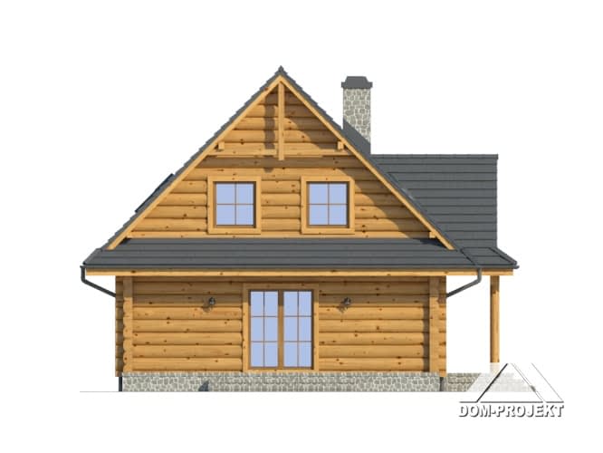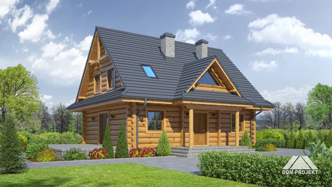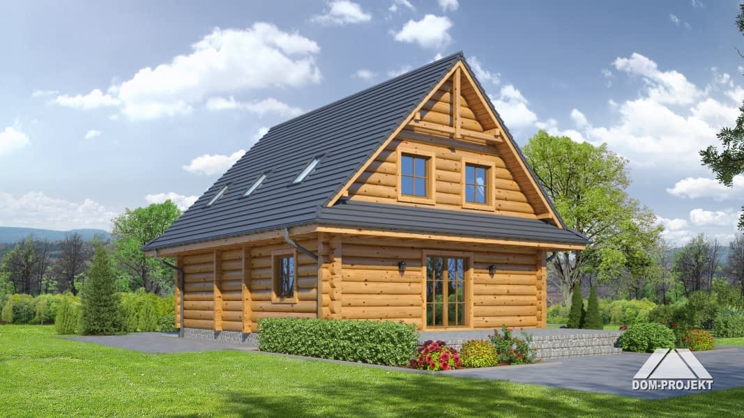 Dom z bali drewnianych. Duży salon z aneksem kuchennym, kominkiem i wyjściem na taras. Pokój, łazienka, komunikacja, wiatrołap, kotłownia. Na poddaszu cztery pokoje, łazienka i komunikacja. Zwarta bryła budynku i dach dwuspadowy sprzyjają szybkiej i taniej budowie i niskim kosztom eksploatacji.Rzuty