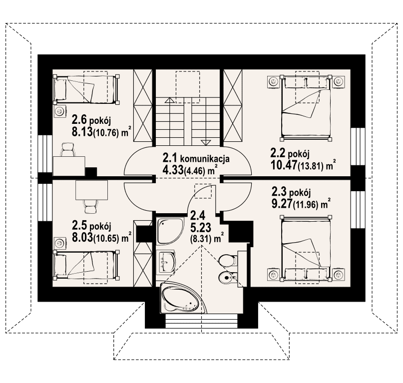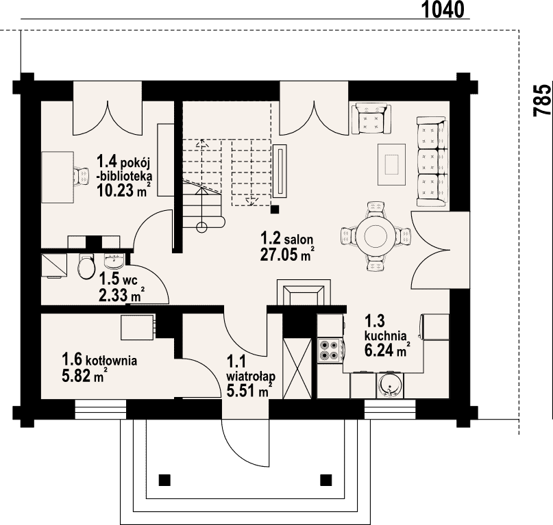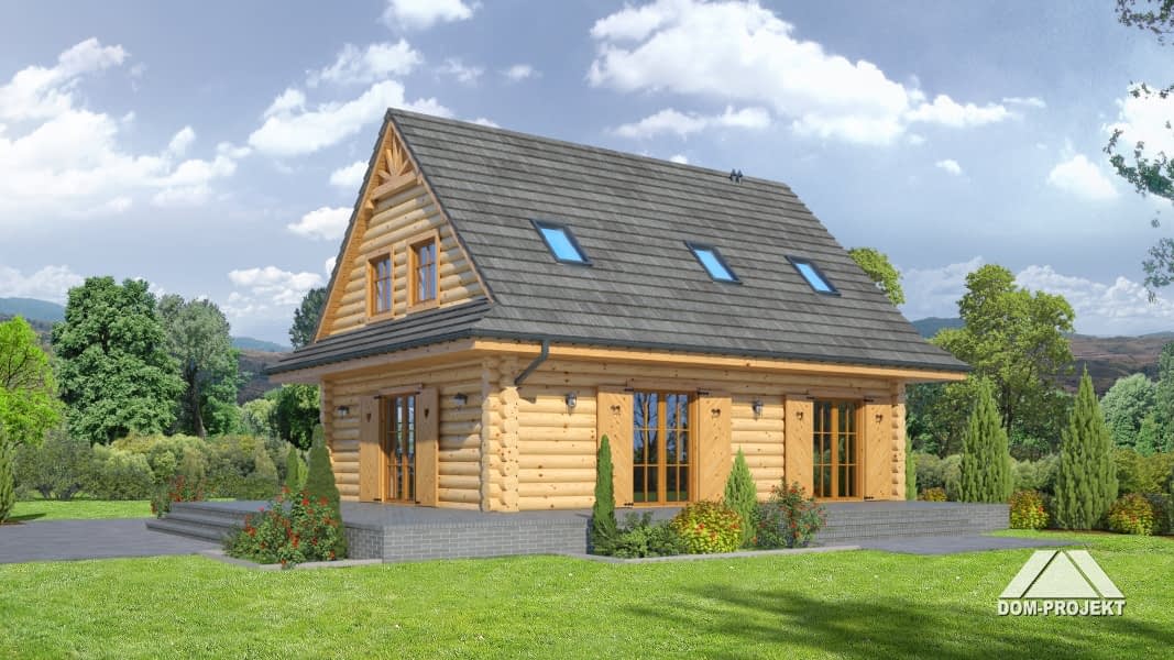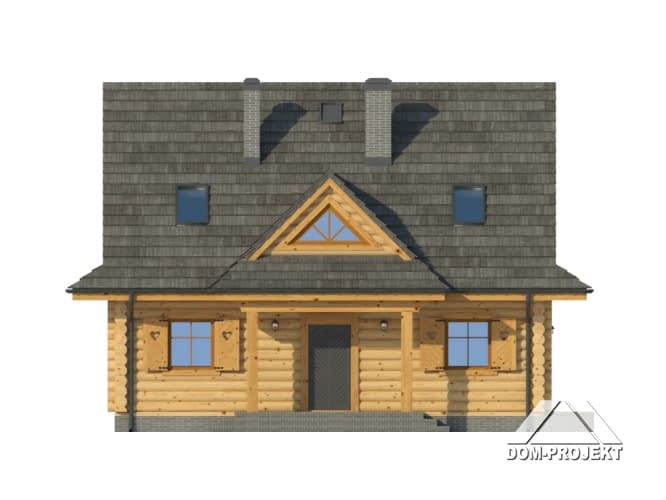 Dom z bali drewnianych, którego wygląd zewnętrzny jest wzorowany na domach góralskich, a wnętrze posiada współczesny funkcjonalny układ. Duży salon z aneksem kuchennym, wyjściem na taras, kominkiem i schodami na poddasze. Pokój-biblioteka, wc, kotłownia, wiatrołap. Na poddaszu cztery pokoje, łazienka i komunikacja.Rzuty