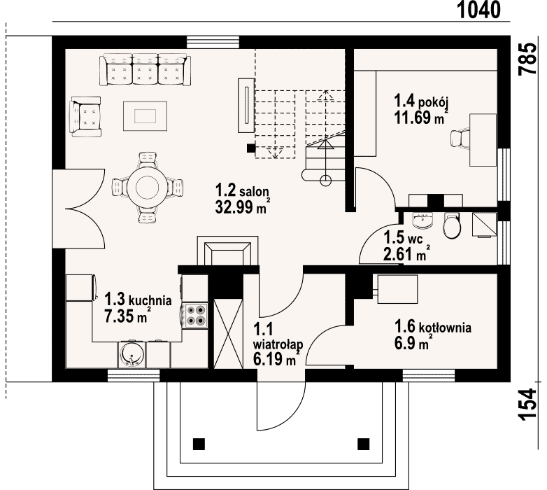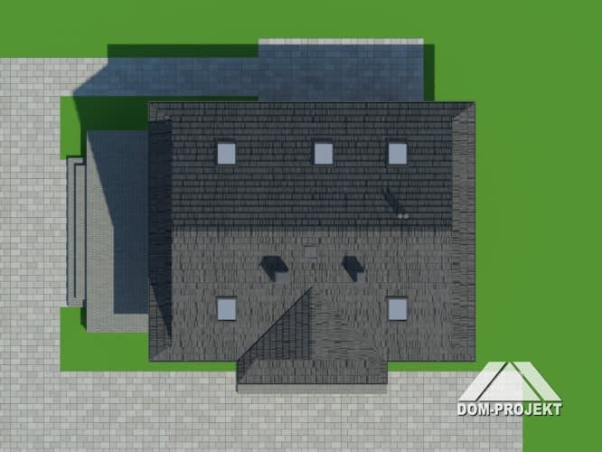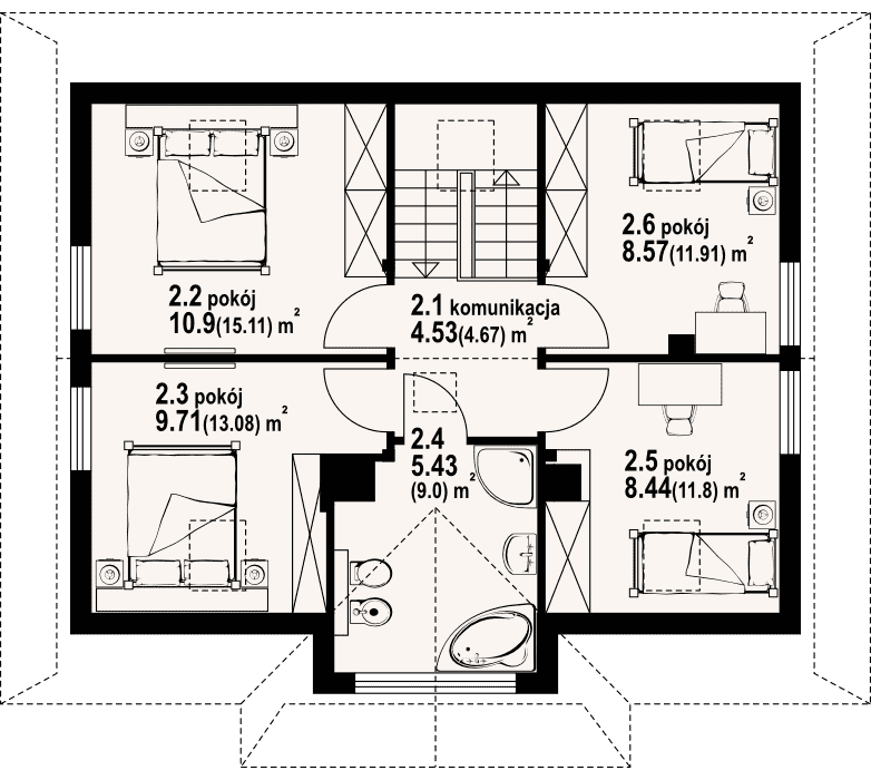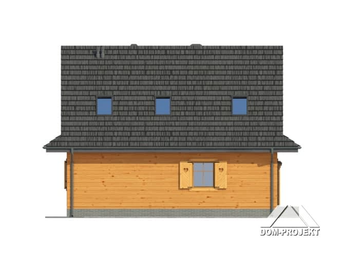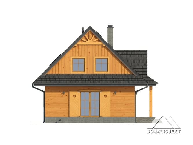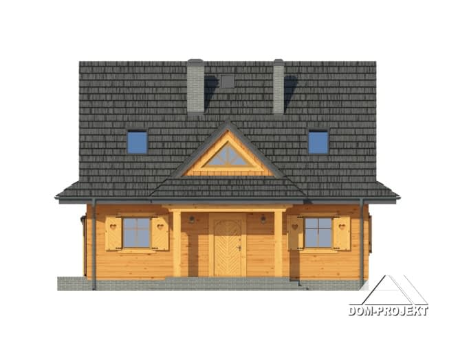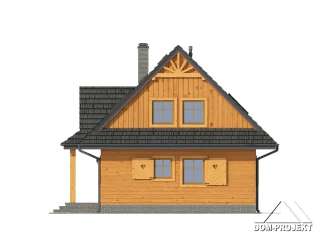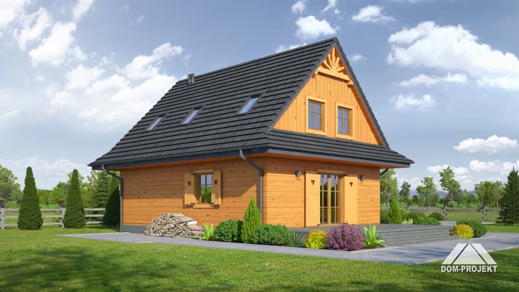 Dom w konstrukcji szkieletu drewnianego. Duży salon z kominkiem, aneksem kuchennym, schodami na poddasze i wyjściem na taras. Pokój, wc z pralką, kotłownia, wiatrołap. Na poddaszu cztery pokoje, łazienka i komunikacja. Zwarta bryła budynku i dach dwuspadowy sprzyjają szybkiej i taniej budowie i niskim kosztom eksploatacji.Rzuty