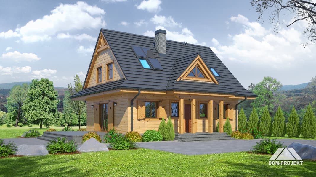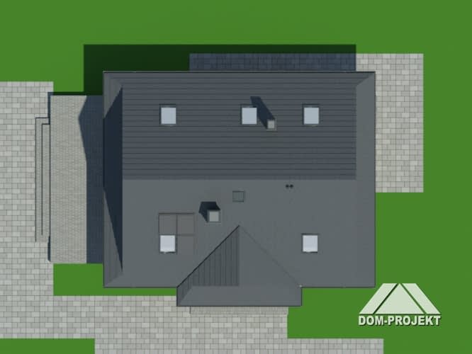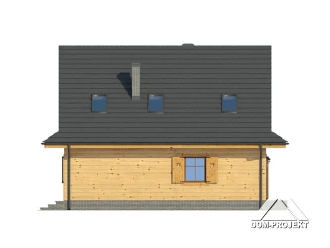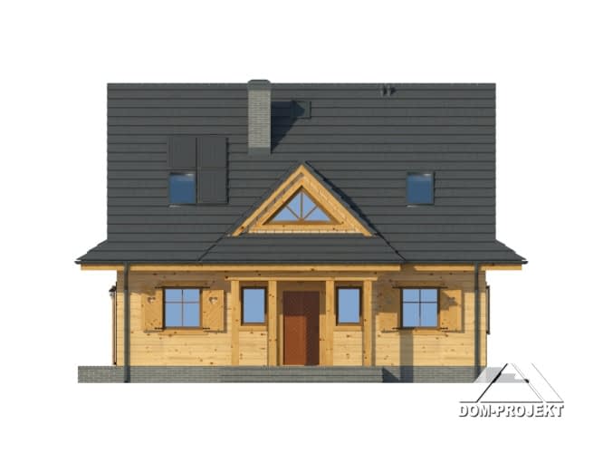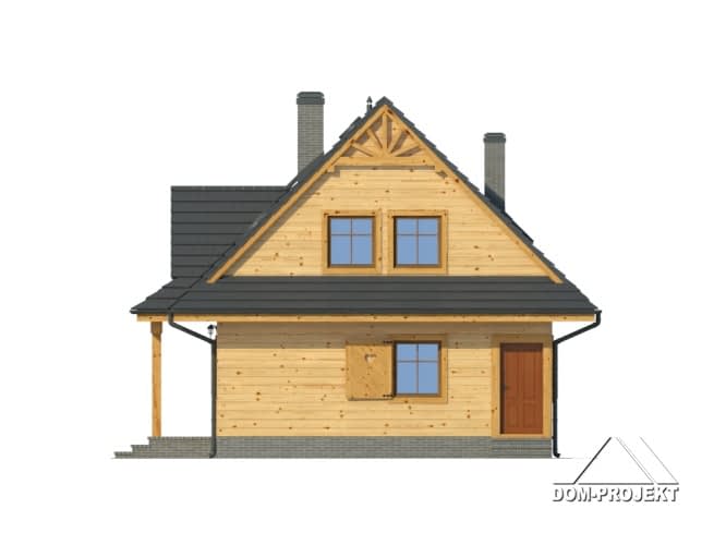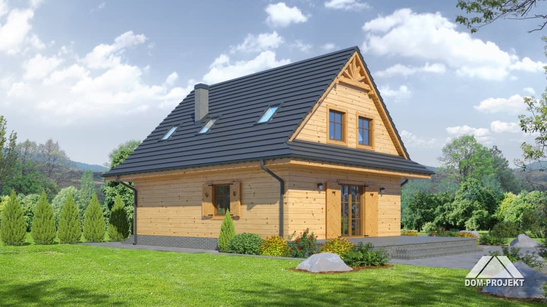 Dom w konstrukcji szkieletu drewnianego. Duży salon z aneksem kuchennym, kominkiem, wyjściem na taras i schodami na poddasze. Pokój, łazienka, kotłownia, wiatrołap. spiżarka. Na poddaszu cztery pokoje, łazienka, komunikacja. Zwarta bryła budynku sprzyja szybkiej i taniej budowie oraz niskim kosztom eksploatacji.Rzuty