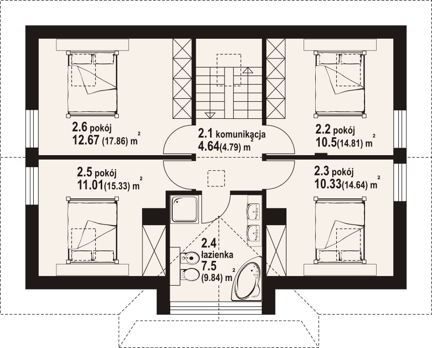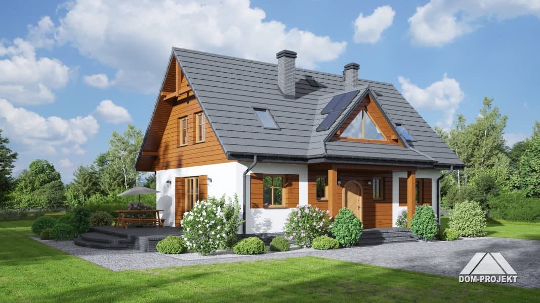 Piękny, zaprojektowany z dbałością o proporcje i estetykę dom przeznaczony dla 4-5 osobowej rodziny. Na parterze obszerna strefa dzienna składająca się z otwartej kuchni oraz salonu. W salonie kominek oraz schody prowadzące na poddasze. Dodatkowo na parterze zaprojektowano pokój-bibliotekę. Na poddaszu znajdują się cztery sypialnie oraz wygodna łazienka.Rzuty