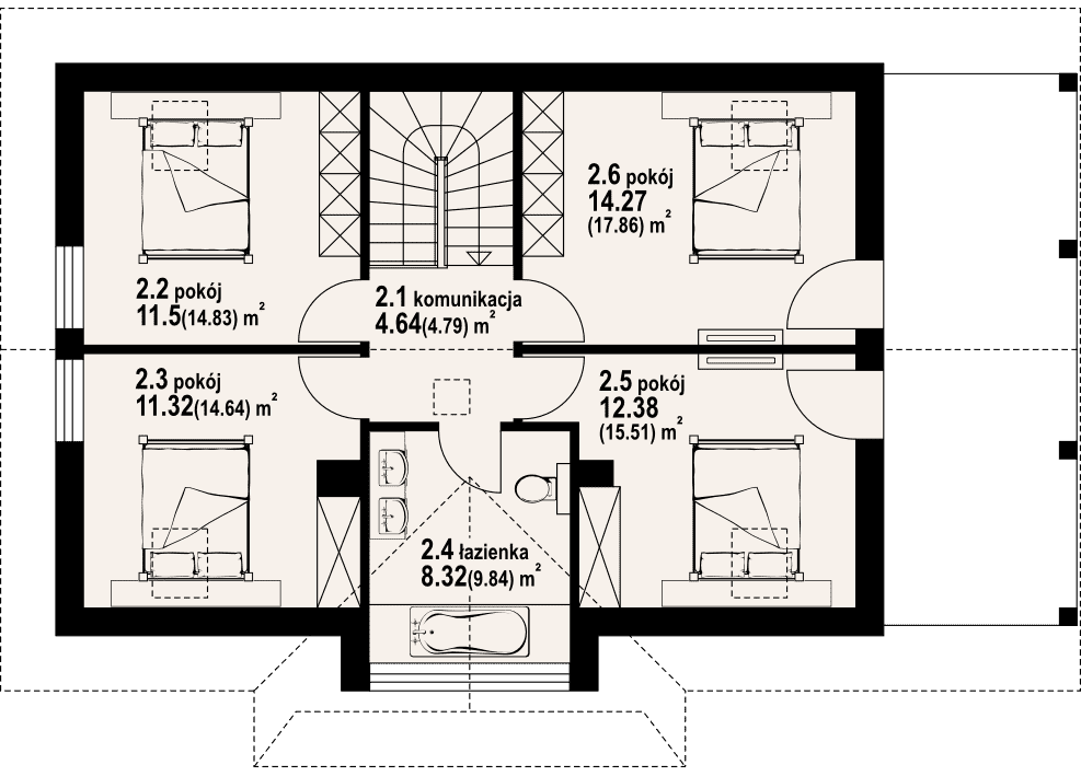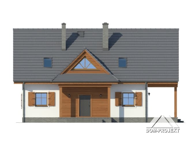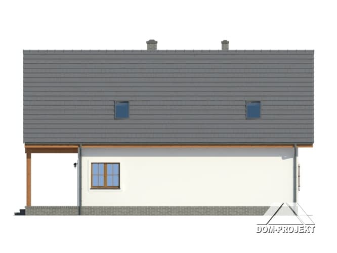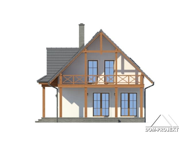 Dom parterowy z poddaszem użytkowym. Duży salon z aneksem kuchennym, kominkiem i wyjściem na duży, zadaszony taras. Pokój, łazienka, wiatrołap, spiżarka i kotłownia. Na poddaszu cztery pokoje, łazienka i komunikacja. Dwa pokoje poddasza mają dostęp do dużego zadaszonego balkonu. Zwarta bryła budynku i dwuspadowy dach sprzyjają szybkiej i taniej budowie i niskim kosztom eksploatacji.Rzuty