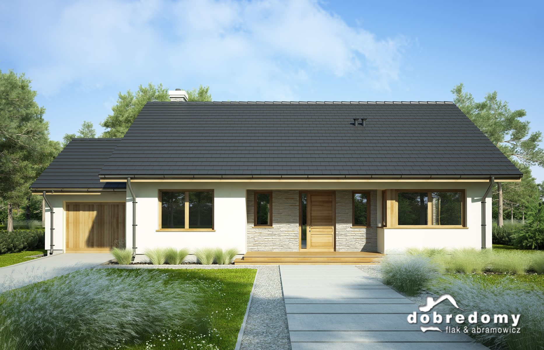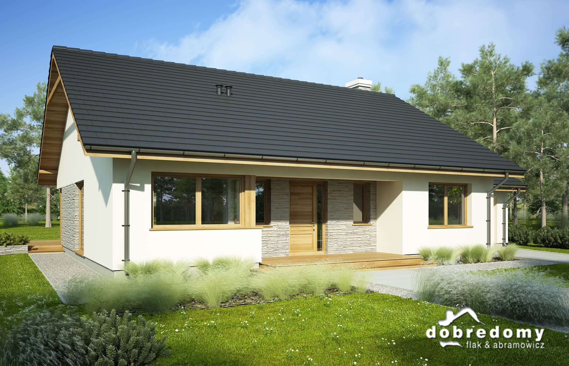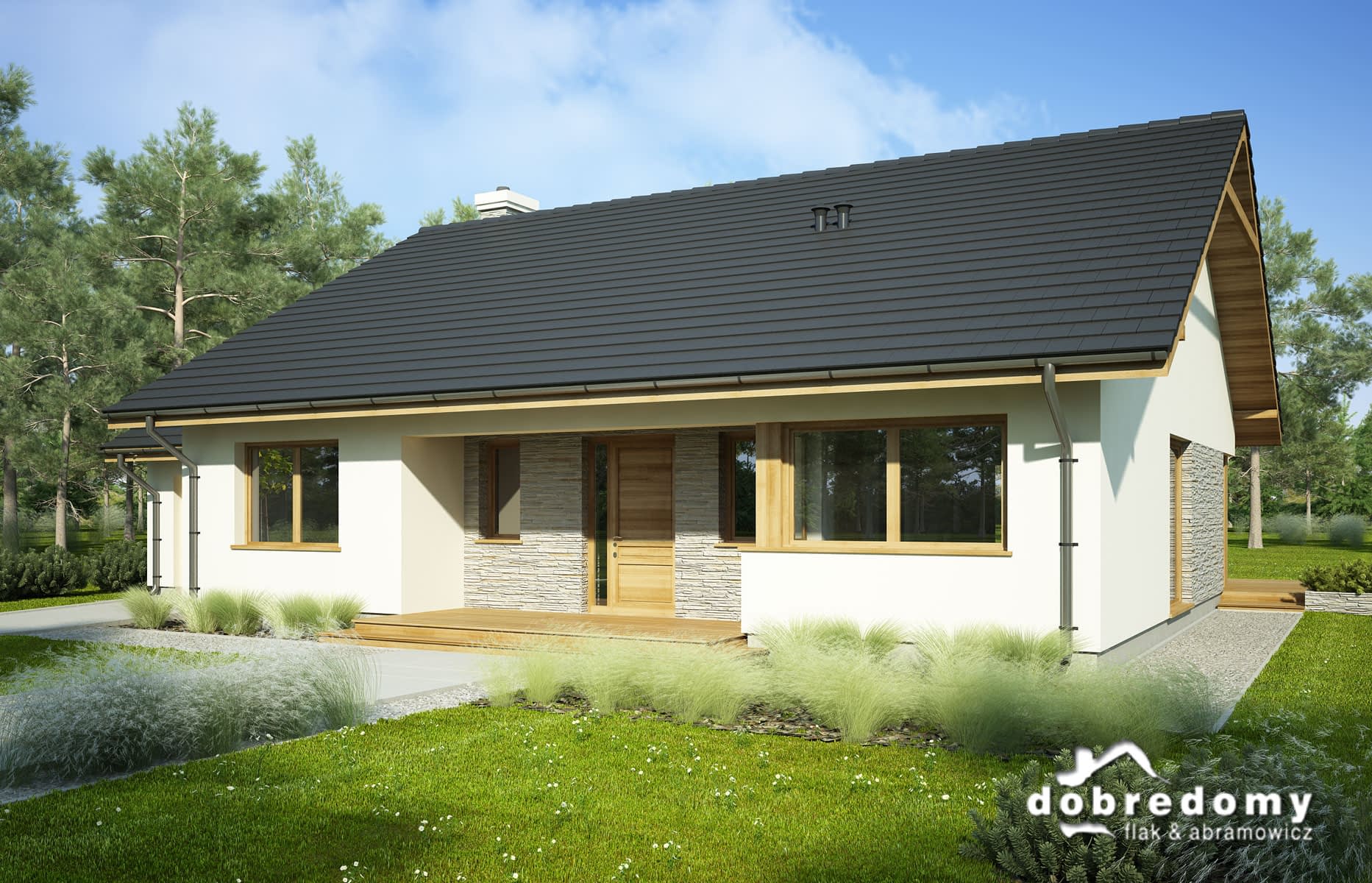 Elewacje pokryte tynkiem strukturalnym w systemie ociepleń Termo Organika oraz okładziną kamienną. Pokrycie dachu - dachówka ceramiczna lub cementowa CREATON.