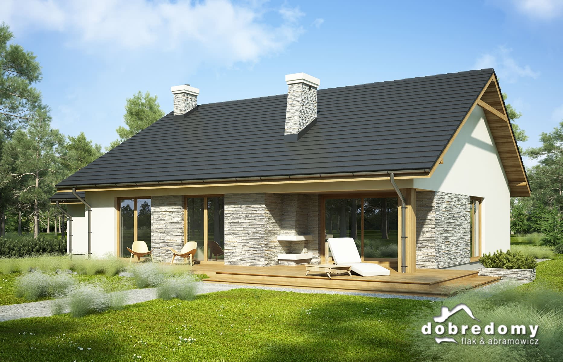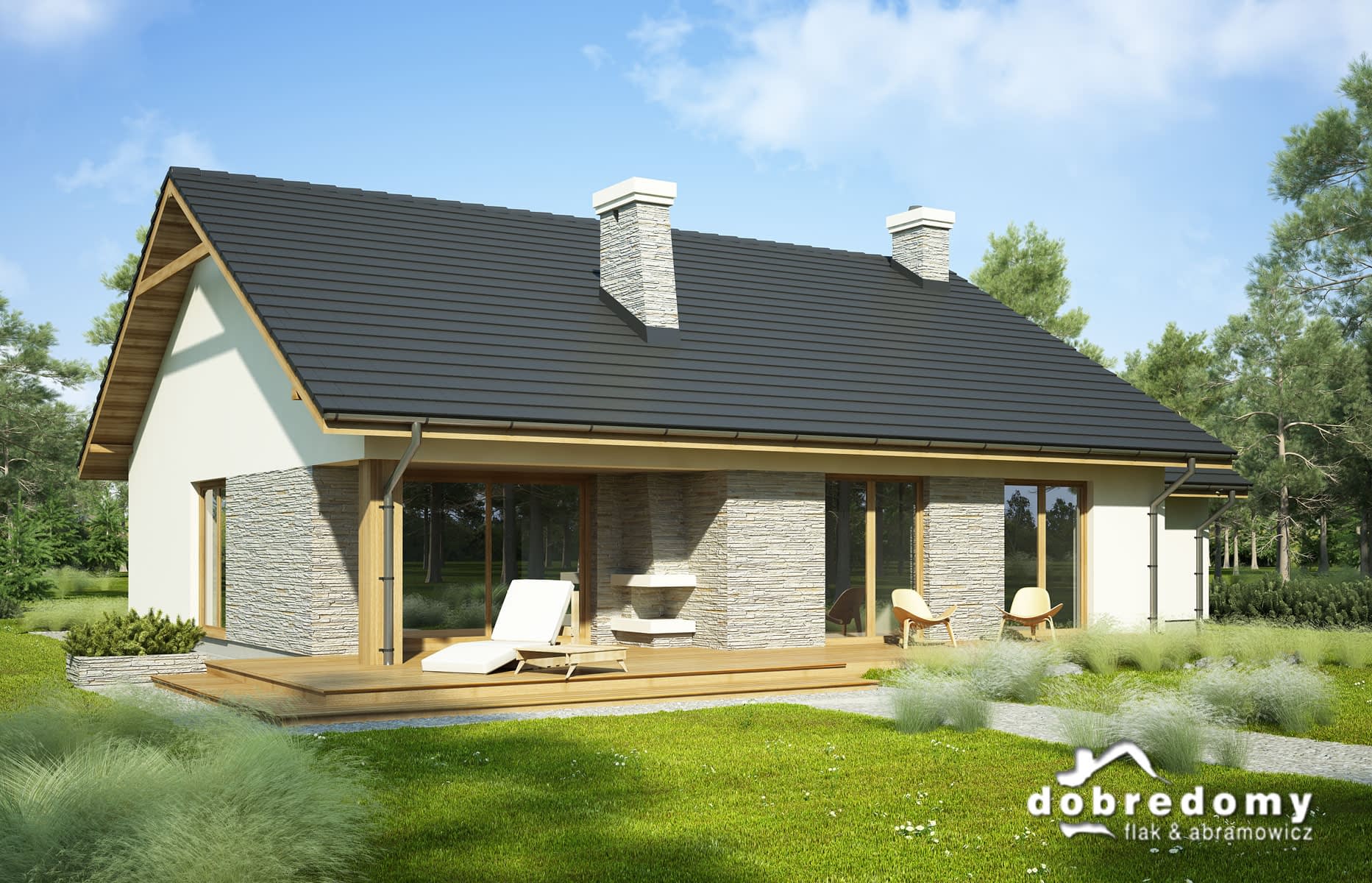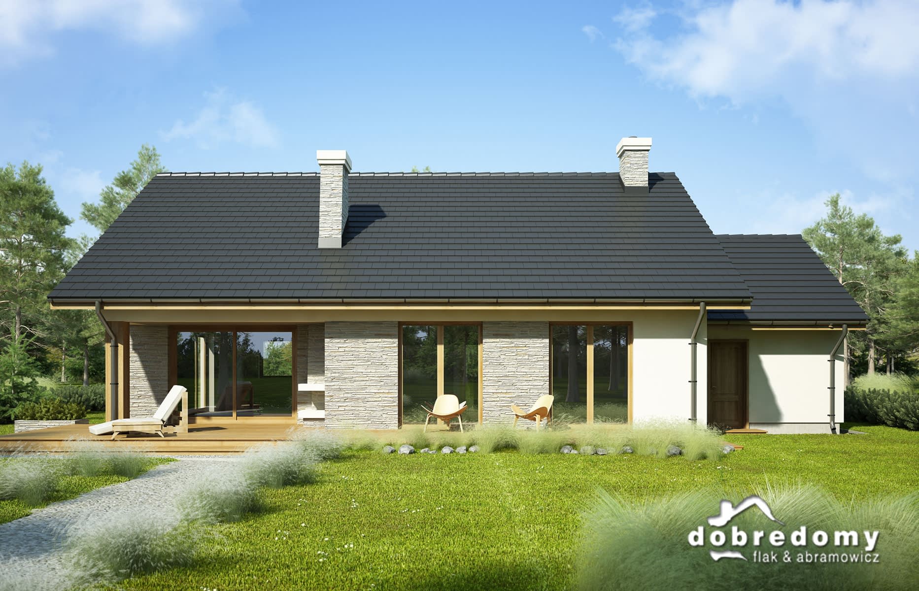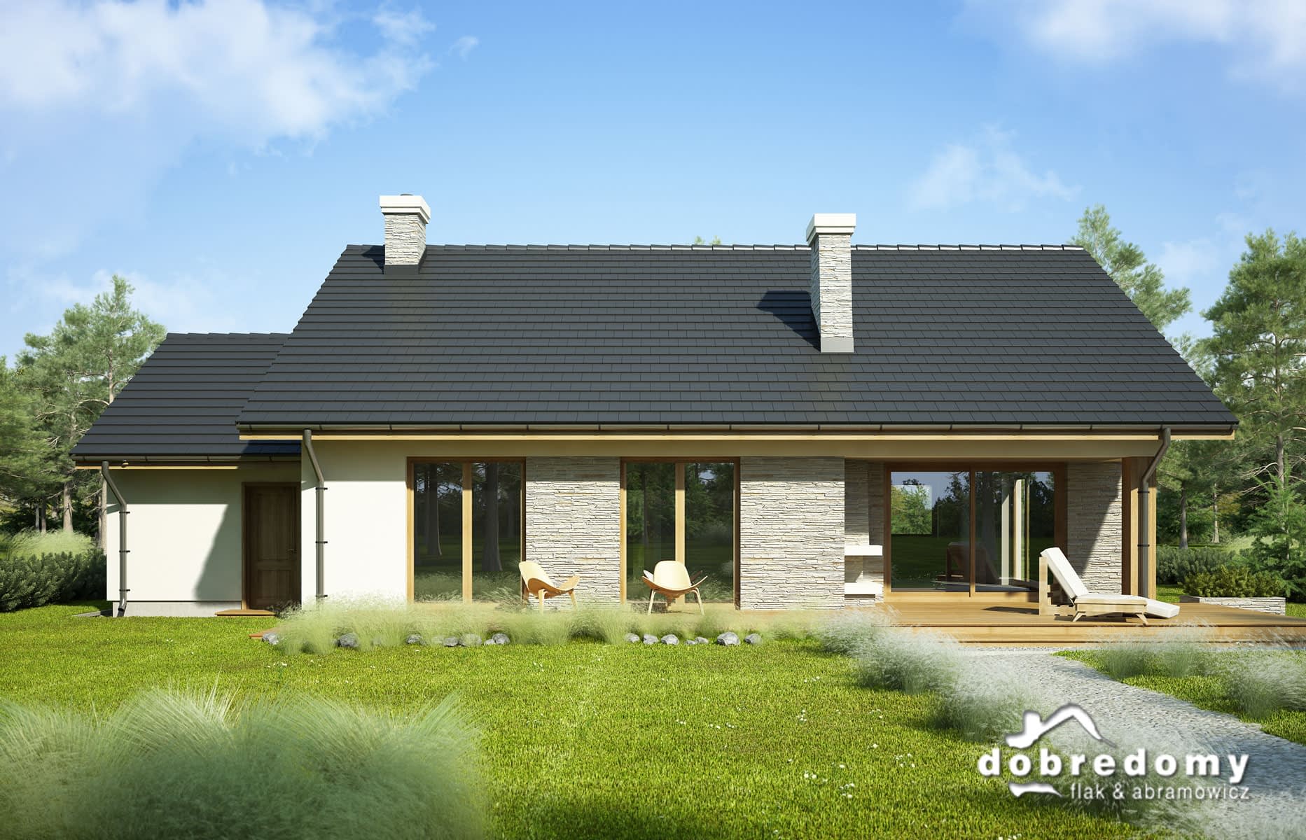 Elewacje pokryte tynkiem strukturalnym w systemie ociepleń Termo Organika oraz okładziną kamienną. Pokrycie dachu - dachówka ceramiczna lub cementowa CREATON.
