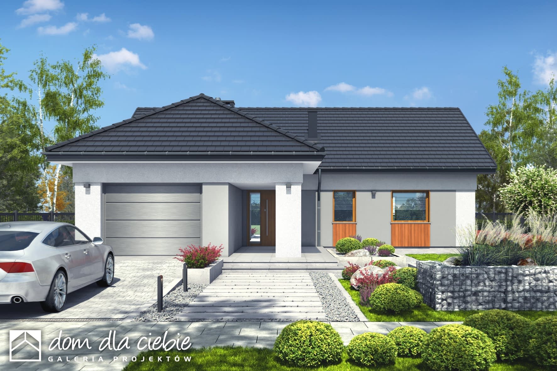 Projekt domu Kaja to propozycja niedużego domu dla 4 osobowej rodziny.Projekt posiada wszystkie funkcje potrzebne dla komfortu mieszkańców.W strefie wejściowej mamy wiatrołap z dostępem do kotłowni na paliwo stałe, garderobę oraz dostępne z holu wc. kompaktowy salon wyposażony jest w jadalnię a w kuchni mamy schowaną wygodną spiżarnię. W strefie nocnej znajdziemy 3 sypialnie , dwie z bezpośrednim wyjściem na ogród za domem oraz łazienkę. Na końcu korytarza wygospodarowano przydatną garderobę.Z przodu znajduje się garaż jednostanowiskowy.