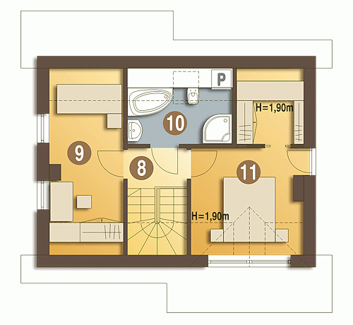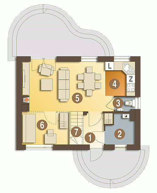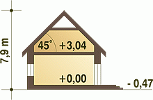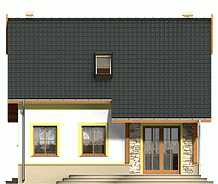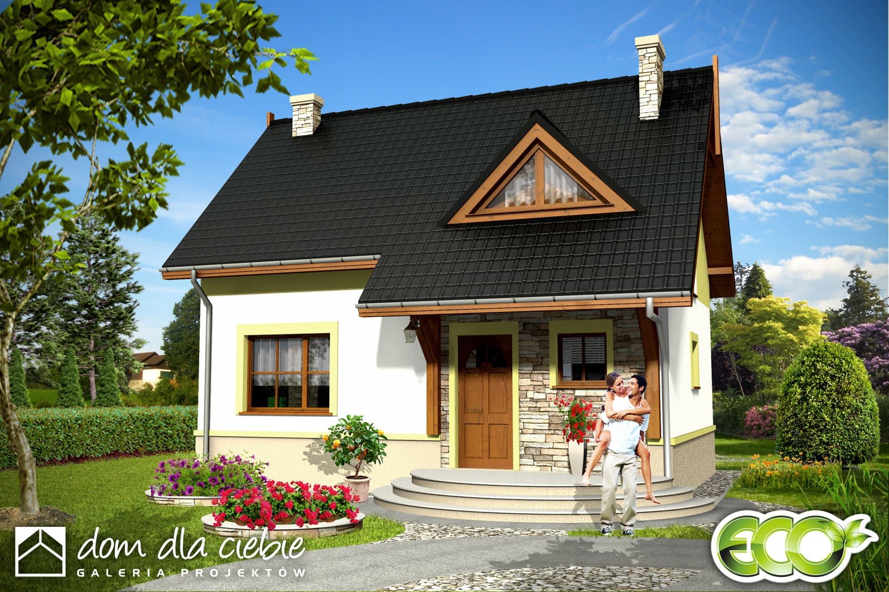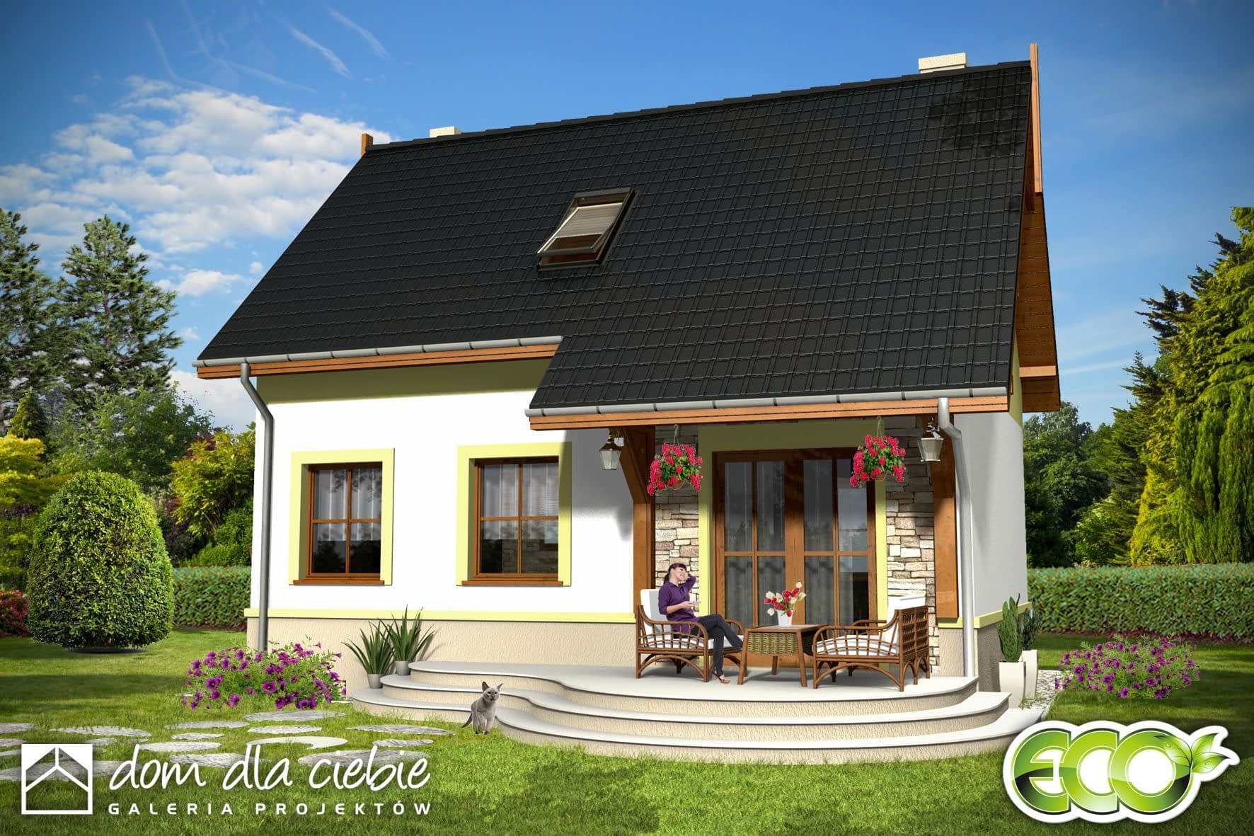 Mały, urokliwy domek dla 3-4 osobowej rodziny. Może z powodzeniem pełnić rolę domu całorocznego jak i letniskowego. Na niewielkiej powierzchni mieści, w bardzo funkcjonalnym układzie, wszystkie potrzebne pomieszczenia. Wiatrołąp posiada miejsce na szafę wnękową oraz możliwość wykorzystania miejsca pod niższym biegiem schodów np. na szuflady. Pom. gospodarcze pomieści piec gazowy oraz niezbędne w każdym domu sprzęty i urządzenia. Strefę ogólnodostępną parteru zaprojektowano w taki sposób, aby uzyskać jak najwiekszą przestrzeń, z tego powodu zaproponowano otwartą kuchnię i jednoprzestrzenny salon z jadalnią, a także zadbano o to, aby dostępny z salonu dodatkowy pokój, był wydzielony jedynie za pomocą ścianki działowej, prostej do likwidacji. Na poddaszu zaprojektowano dwie sypialnie: jedną niewielką ale ustawną, drugą większą z wewnętrzną garderobą oraz dość dużą łazienkę. W wersji z garażem poddasze powiększono o jeszcze jedną sypialnię.