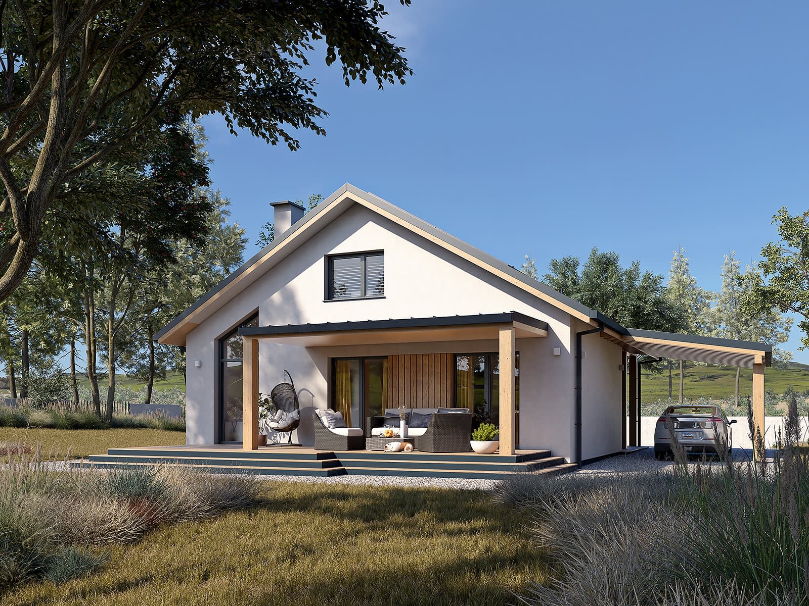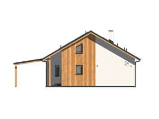 Kalatea - parterowy dom z maksymalnie wykorzystaną przestrzenią Kalatea to funkcjonalny i kompaktowy projekt domu parterowego, zaprojektowany z myślą o 2-3-osobowej rodzinie. Stanowi idealną alternatywę dla mieszkania w bloku, oferując prywatność i wygodę użytkowania przy zachowaniu niewielkich kosztów budowy i eksploatacji. Prosta, prostokątna bryła została przykryta dwuspadowym dachem w kolorze jasnoszarym. Nowoczesny charakter domu podkreślają jasny tynk, drewniane detale elewacyjne oraz drewniana stolarka. Zadaszony podcień przy wejściu zapewnia praktyczną osłonę przed deszczem i śniegiem.Konstrukcja