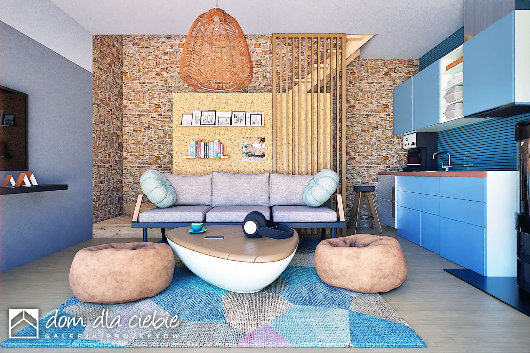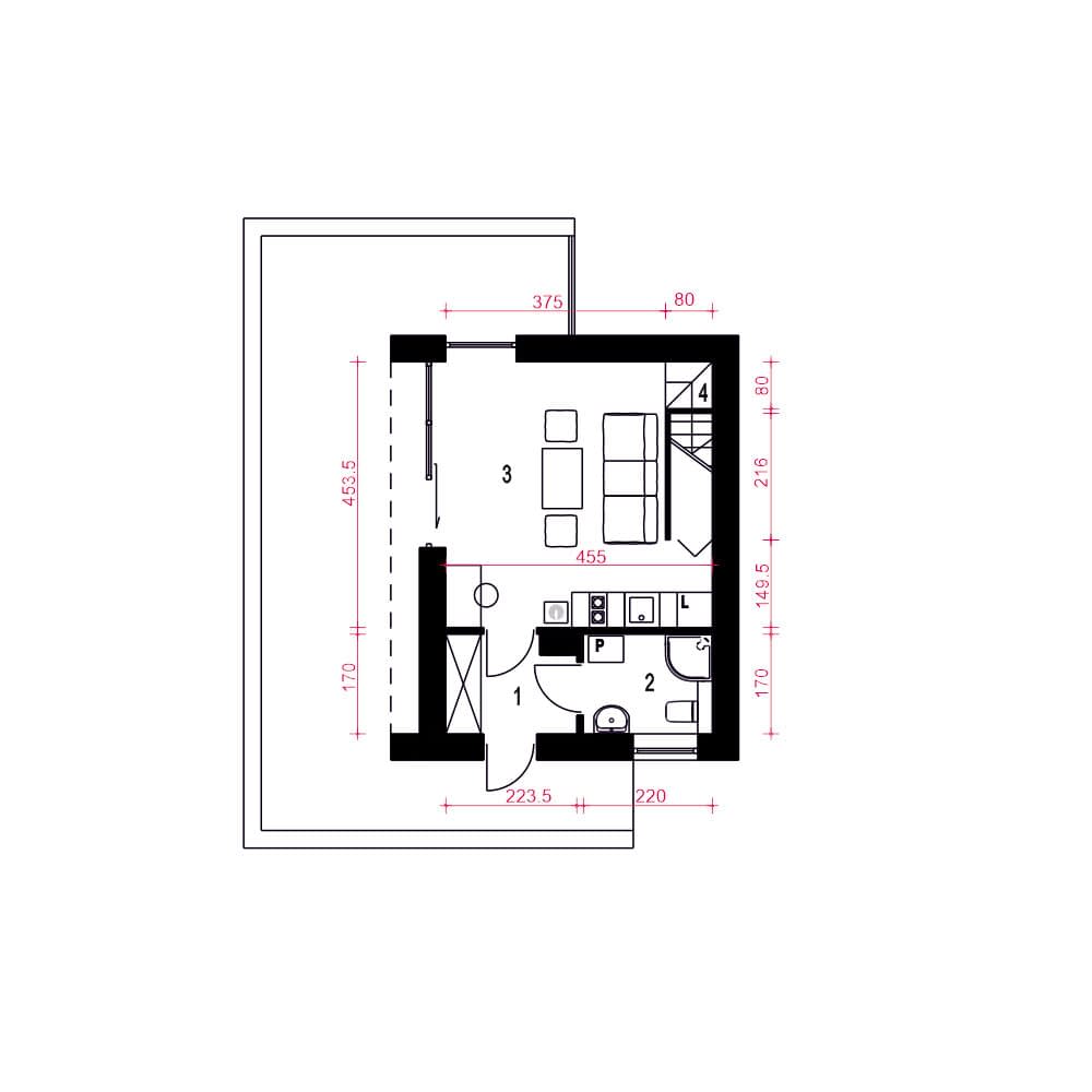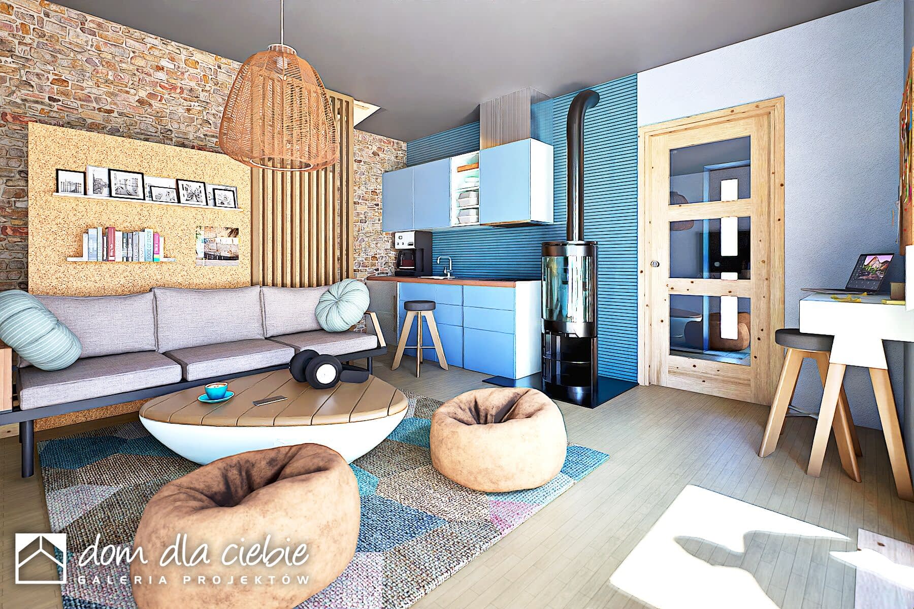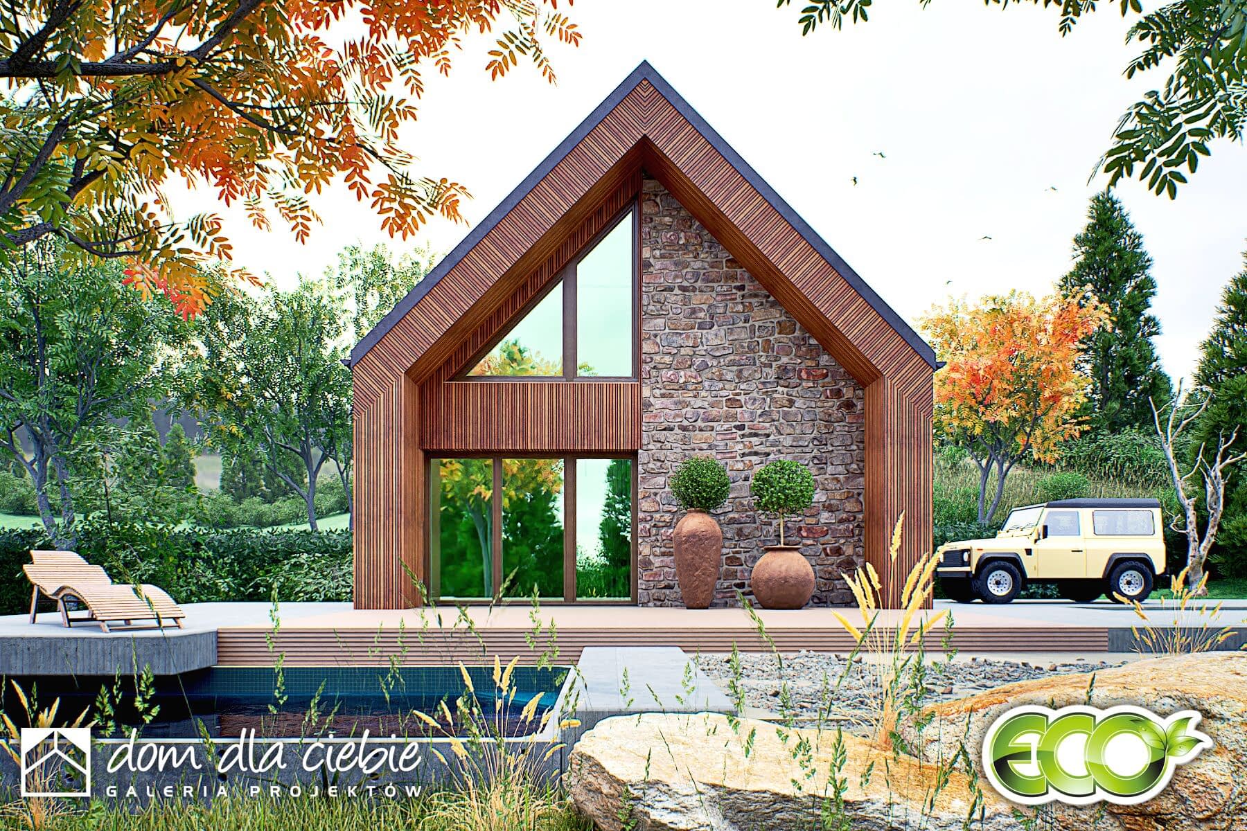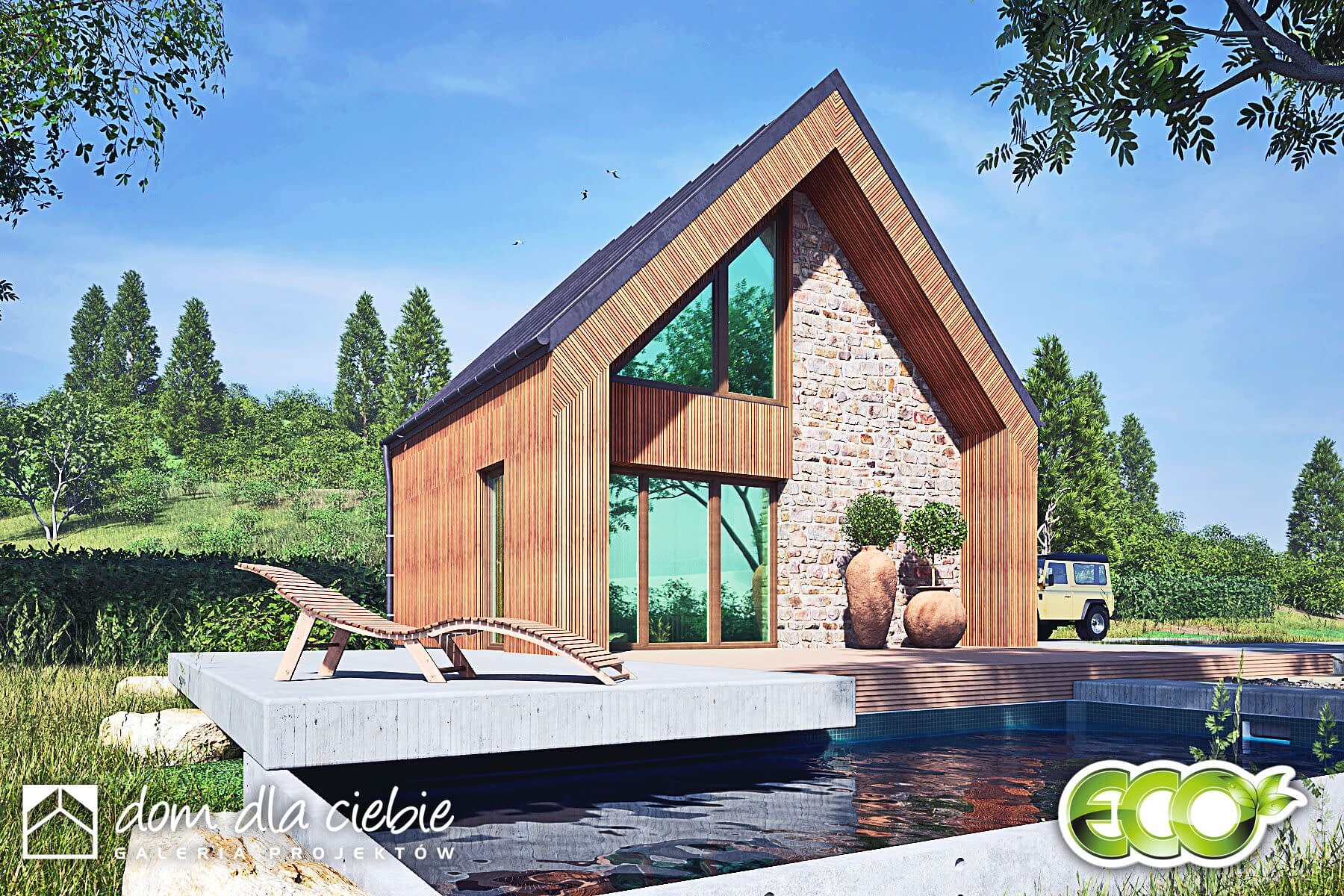 Kamyczek II -projekt niewielkiego domku z dwuspadowym dachem na rzucie prostokąta. Dom z elewacją drewnianą i kamienną. Jest to propozycja projektu do 70 m2 powierzchni zabudowy.Kamyczej II pasuje do naturalnego otoczenia. Zadaszone wejście prowadzi do wiatrołapu, w którym przewidziano szafę wnękową. Stąd można dostać się do łazienki z prysznicem. W strefie dziennej mamy niewielką kuchnię, miejsce na wypoczynek, biurko, schowek pod schodami i schody na poddasze oraz kominek. Ogrzewanie piecem gazowym i kominkiem. Z salonu wchodzi się schodami na poddasze.Kamyczek to propozycja ekonomicznego i ekologicznego domu, który doskonale sprawdzi się jako weekendowy lub dom całoroczny dla niewymagających użytkowników.