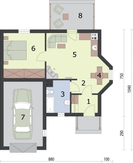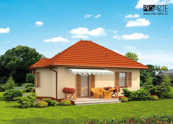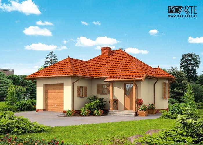 Gdyby spróbować wskazać zalety projektu Kansas, to należy w pierwszej kolejności wymienić: bezpieczeństwo i praktyczne rozwiązania. Kansas to pełna szyku i uroku budowla na którą składa się dom z garażem. Piękny kopertowy dach w całości pokrywa całość budynku. Trzeb zwrócić uwagę na to, że jest to jeden z najbardziej harmonijnie i stylowo prezentujących się projektów domków letniskowych na rynku. Uwagę przykuwa budzący zachwyt wykusz, jednolita tonacja całości sprawia, że może stać się hitem spośród naszych projektów. Od południa znajduje się ganek oraz garaż i to one w na pierwszy rzut oka przykuwają uwagę. Gdy dobrze się przyjrzymy, to można zauważyć, że od wschodu w bryle budynku znajduje się wypust, to wykusz, który skrywa jadalnię. Po przejściu przez ganek, w wiatrołapie znajdziemy miejsce na garderobę pod zabudowę. Dalej, po przejściu do komunikacji, jej lewa część wiedzie do kuchni, zaś po prawej jest wspomniana jadalnia. Za nią znajduje się największe pomieszczenie, czyli pokój dzienny z aneksem kuchennym, kominkiem. Całości wnętrz dopełnia sypialnia. Z pokoju dziennego można wyjść na taras, który będzie miejscem niejednej biesiady w gronie bliskich, letniego śniadania, czy romantycznej kolacji.