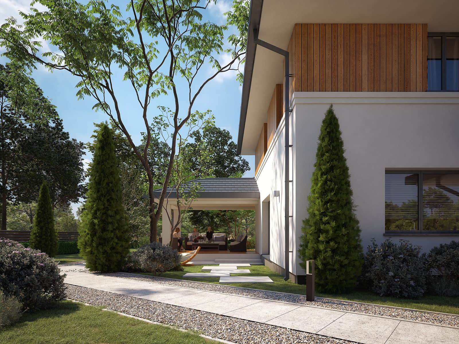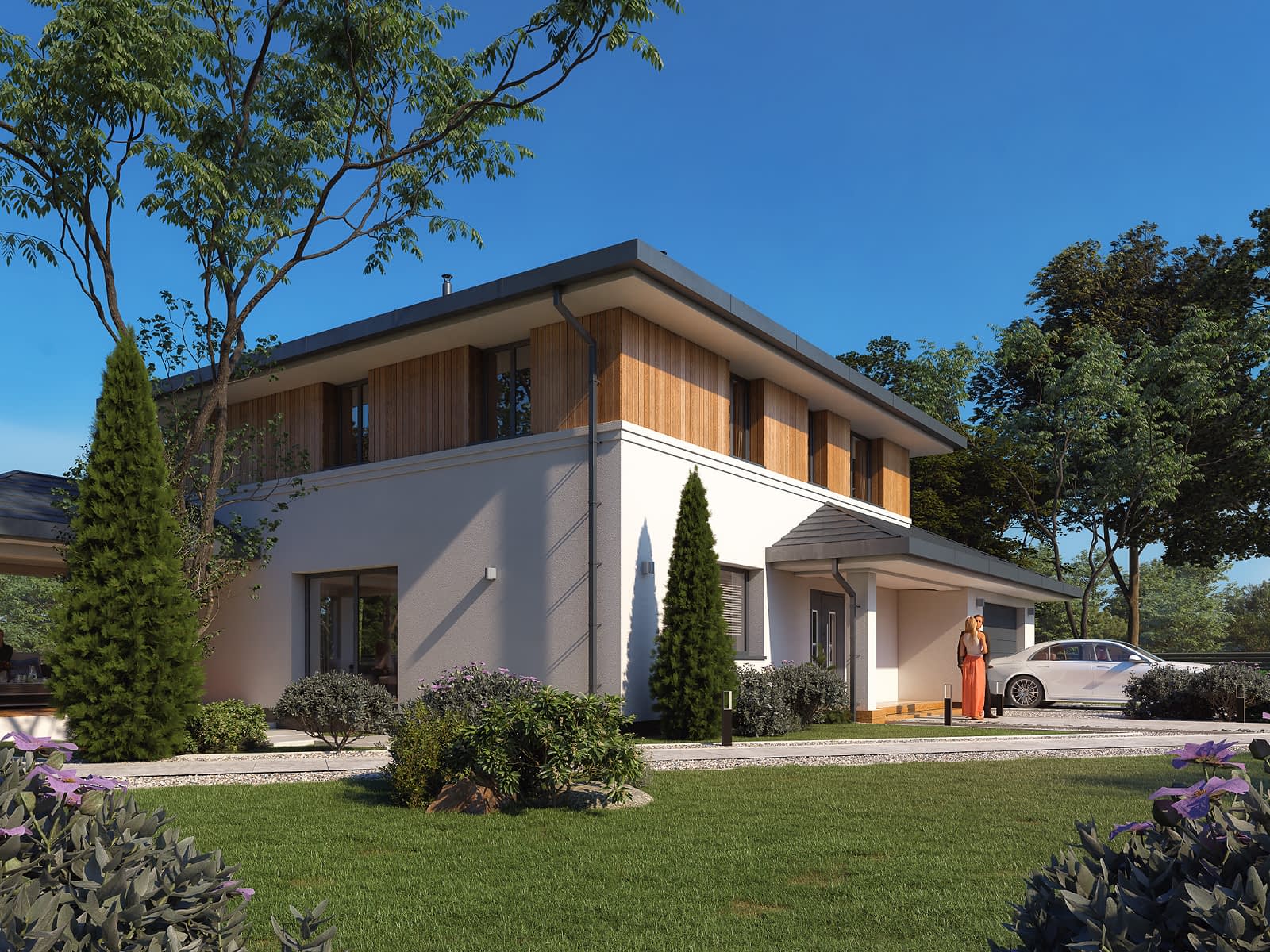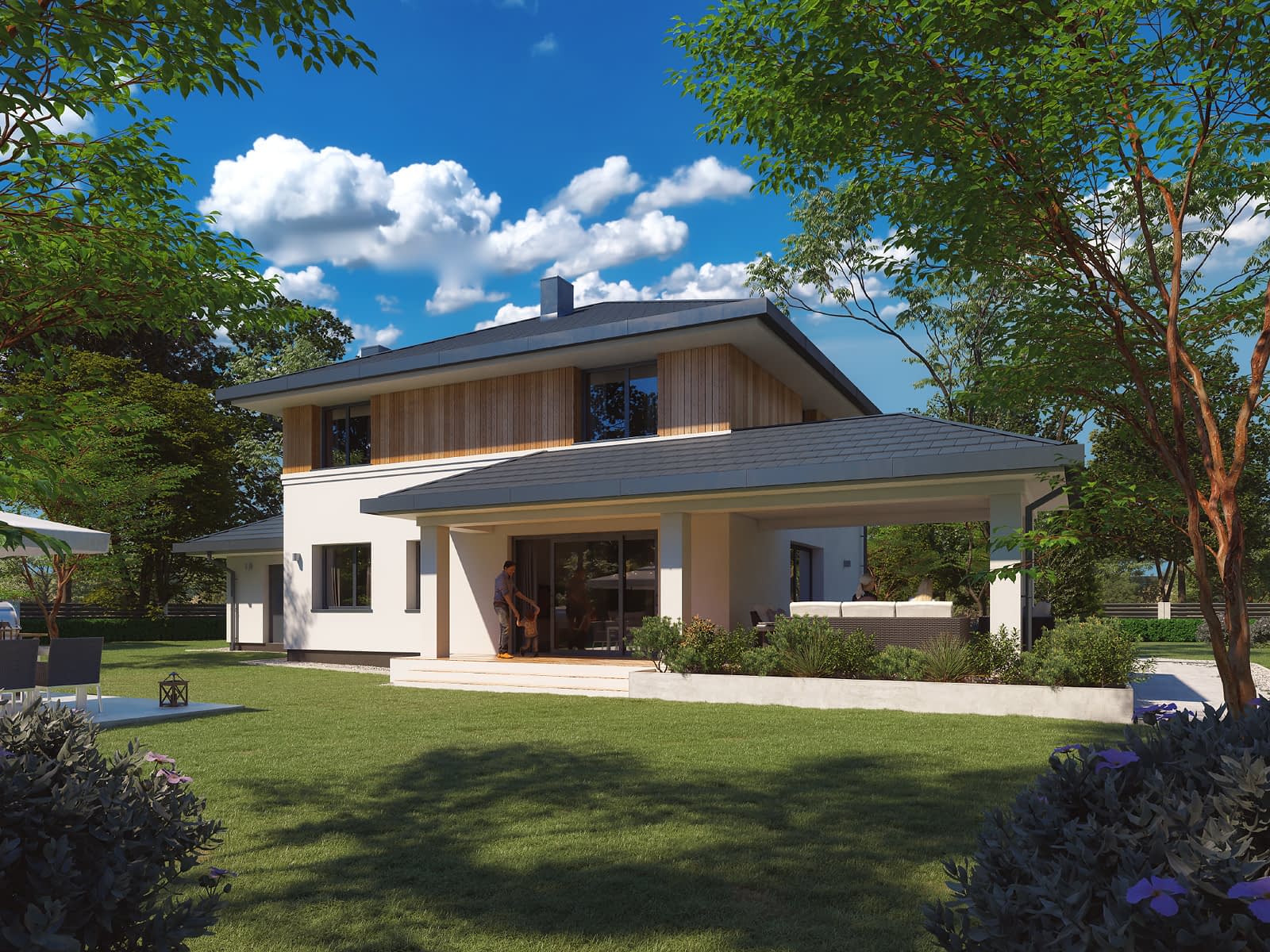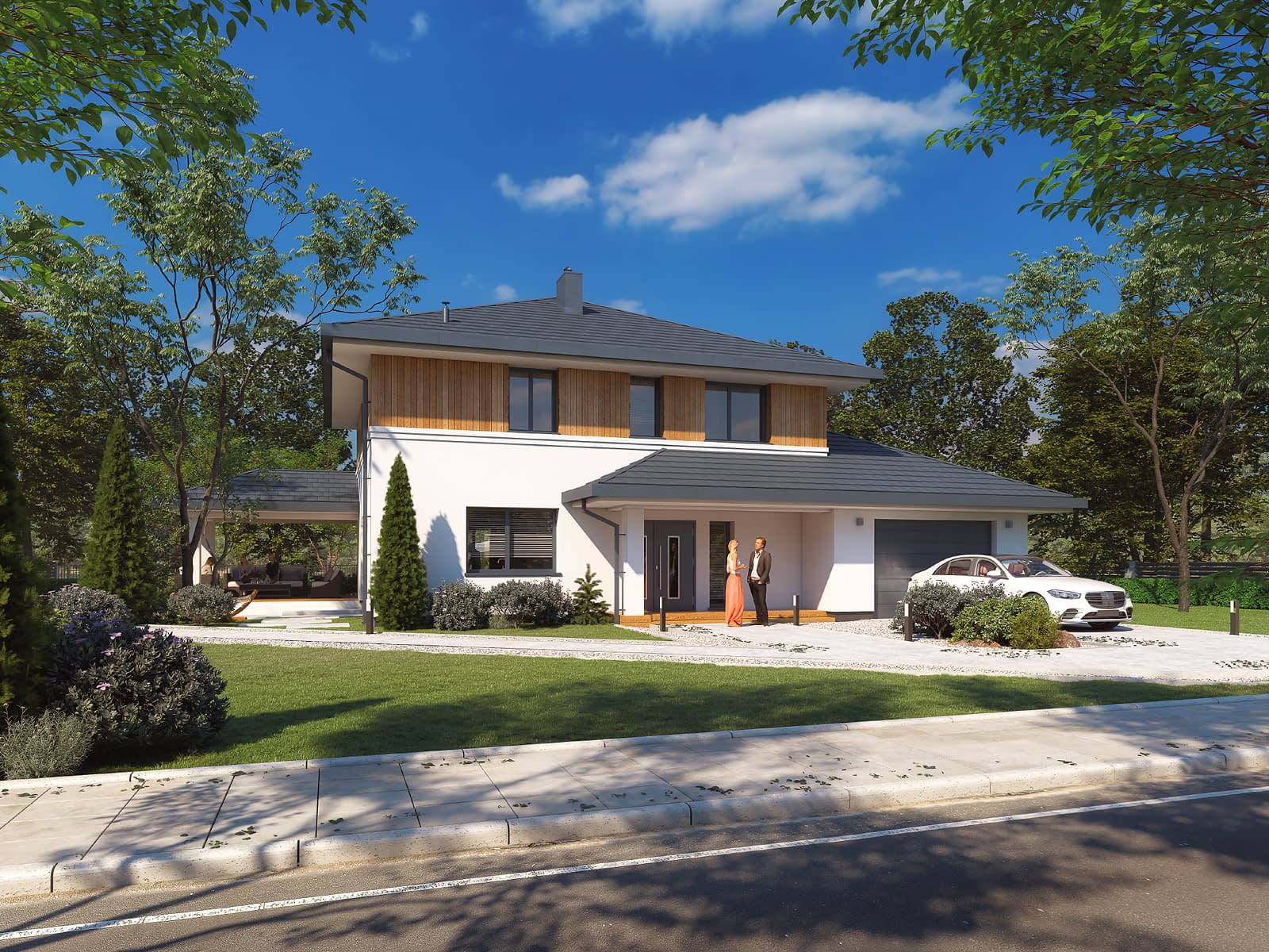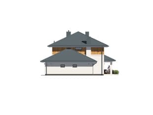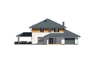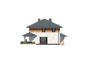 Kardamon to projekt domu z użytkowym poddaszem o powierzchni 174 m2. Nowoczesny dom o rozłożystej bryle posiada garaż na jedno stanowisko. Autor projektu zaproponował nowoczesne wykończenie. Na elewacji pojawił się biały tynk i drewniana szalówka. Wykorzystanie szalówki w kolorze naturalnego drewna nie tylko ociepliło budynek, ale również wprowadziło przyjemny klimat. Na dachu pojawiła się dachówka w kolorze grafitowym. W tym samym odcieniu dobrano stolarkę okienną i drzwiową. Dom prezentuje się oryginalnie i nowocześnie.Konstrukcja