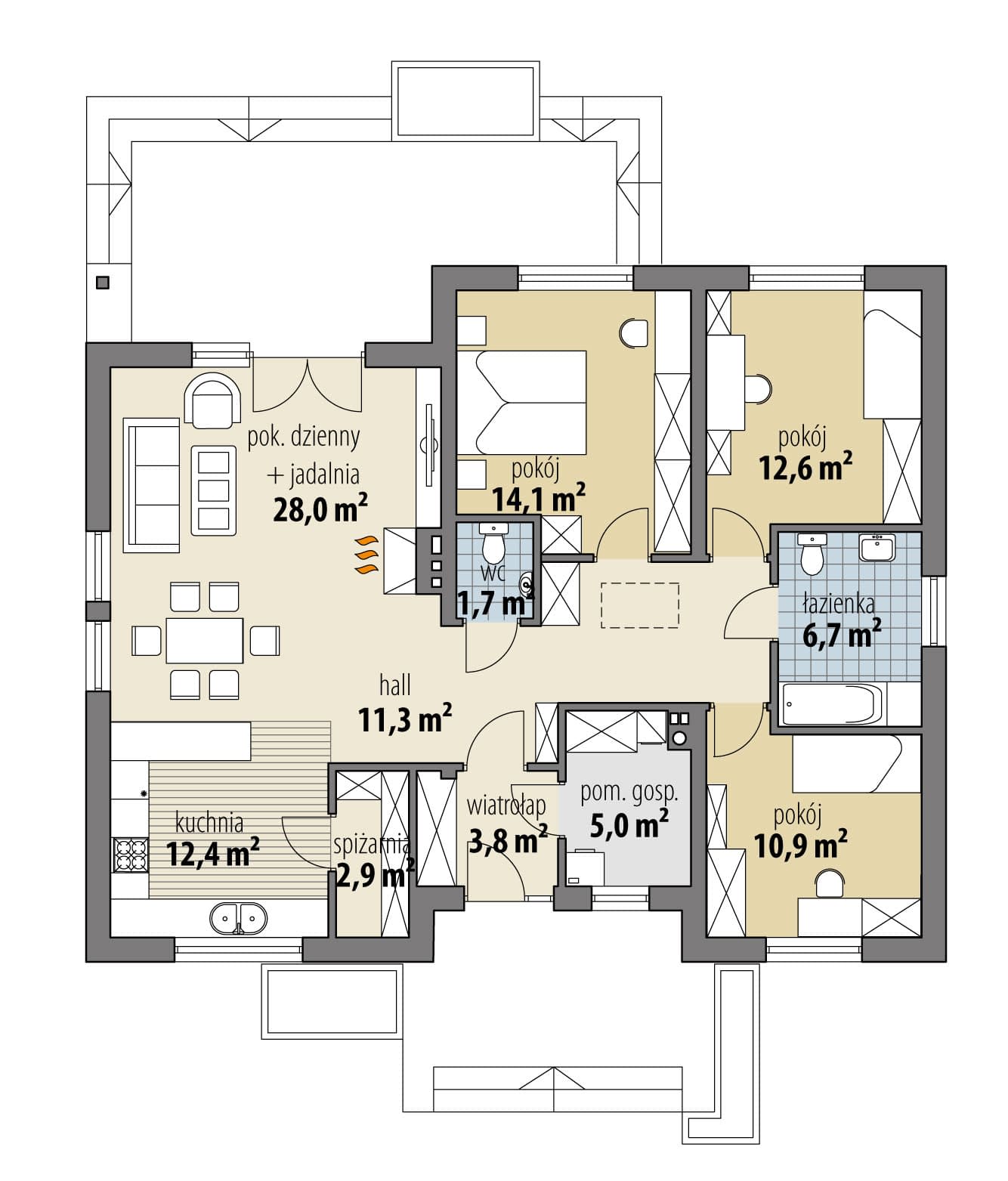 Dom parterowy, niepodpiwniczony, przeznaczony dla 3-4 osobowej rodziny. Na parterze znajduje się pokój dzienny połączony z jadalnią i kuchnią, spiżarnia, toaleta, trzy sypialnie, łazienka oraz pomieszczenie gospodarcze z kotłem grzewczym. Z hallu istnieje możliwość wejścia na obszerny strych schodami schowanymi w stropie. Projekt dostępny w wersjach: Karina I, Karina II oraz Karina IV.
