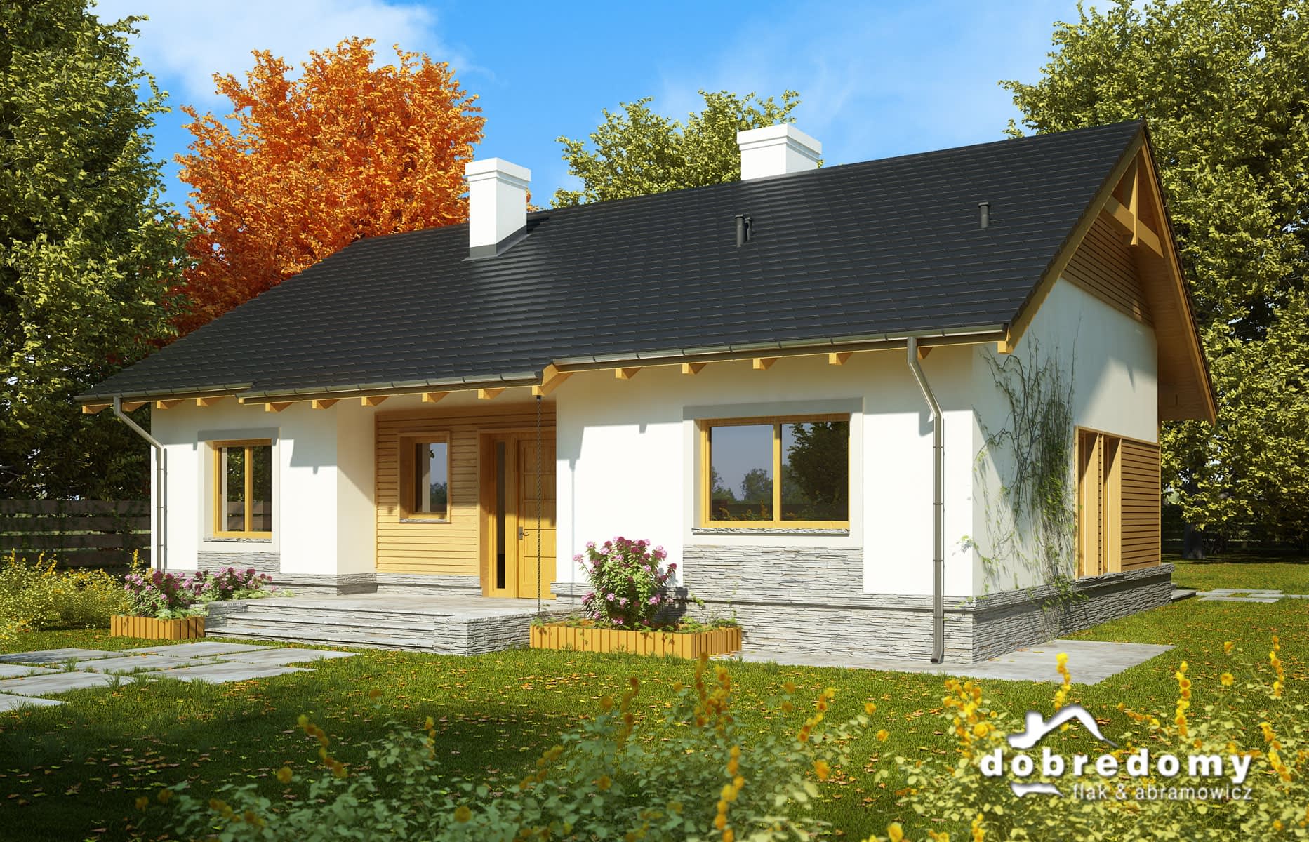 Elewacje pokryte tynkiem strukturalnym w systemie ociepleń Termo Organika, okładziną drewnianą oraz klinkierową. Pokrycie dachu - dachówka ceramiczna lub cementowa CREATON.