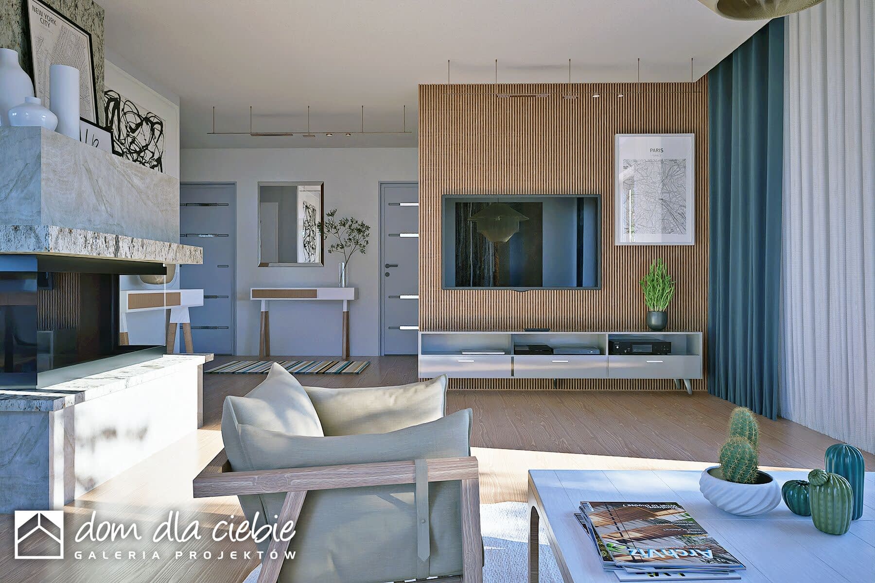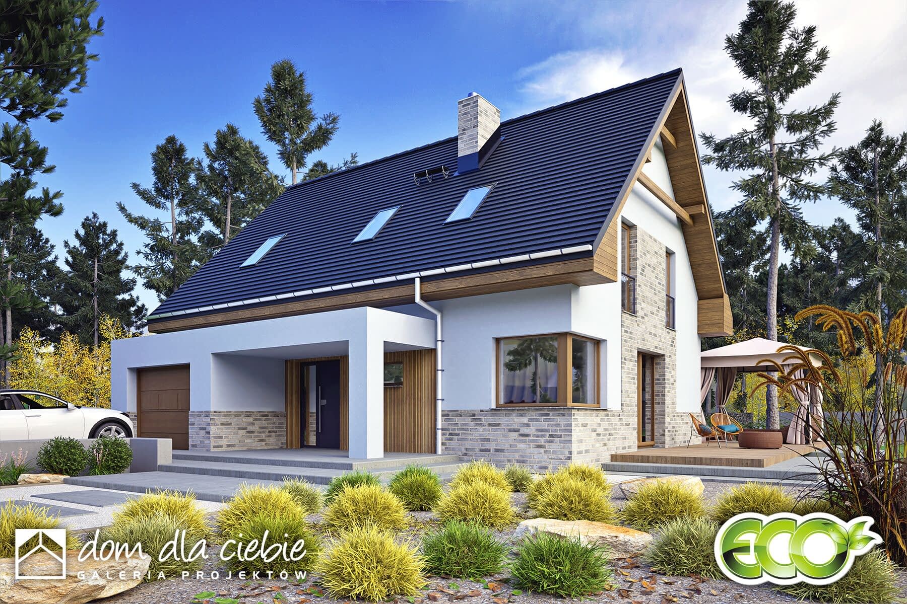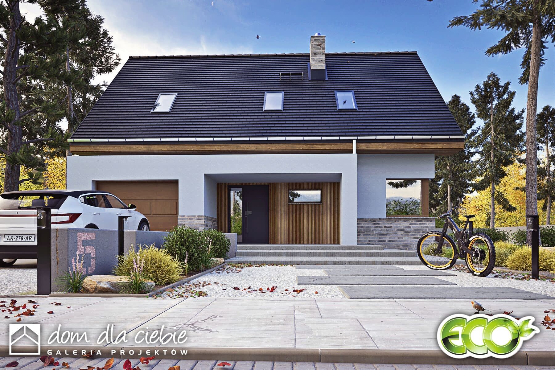 Karla to nowoczesny i funkcjonalny projekt domu jednorodzinnego z poddaszem użytkowym, przeznaczony dla 4–5-osobowej rodziny. Zwarta bryła, dwuspadowy dach i stonowana elewacja z jasnego tynku i klinkieru łączą elegancję z ekonomią budowy. Zadaszone wejście podkreśla prostą, nowoczesną formę.Na parterze zaplanowano przestronną strefę dzienną z salonem, jadalnią i kuchnią oraz kominkiem w centralnym punkcie. Dodatkowy pokój może pełnić funkcję gabinetu lub sypialni gościnnej. Przewidziano też WC, garderobę pod schodami oraz dostęp do garażu i pomieszczenia technicznego.Poddasze to trzy sypialnie, w tym jedna z własną łazienką, oraz wspólna, przestronna łazienka z wanną i prysznicem.Projekt Karla harmonijnie łączy nowoczesność z naturalnymi akcentami. Dzięki dużym przeszkleniom wnętrza są jasne i otwarte na ogród, a prosta forma budynku pasuje zarówno do krajobrazu wiejskiego, jak i podmiejskiego.