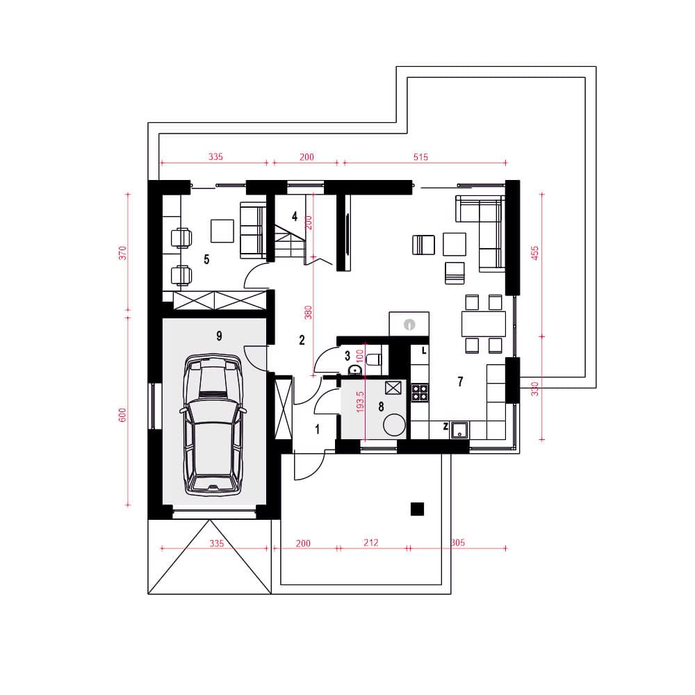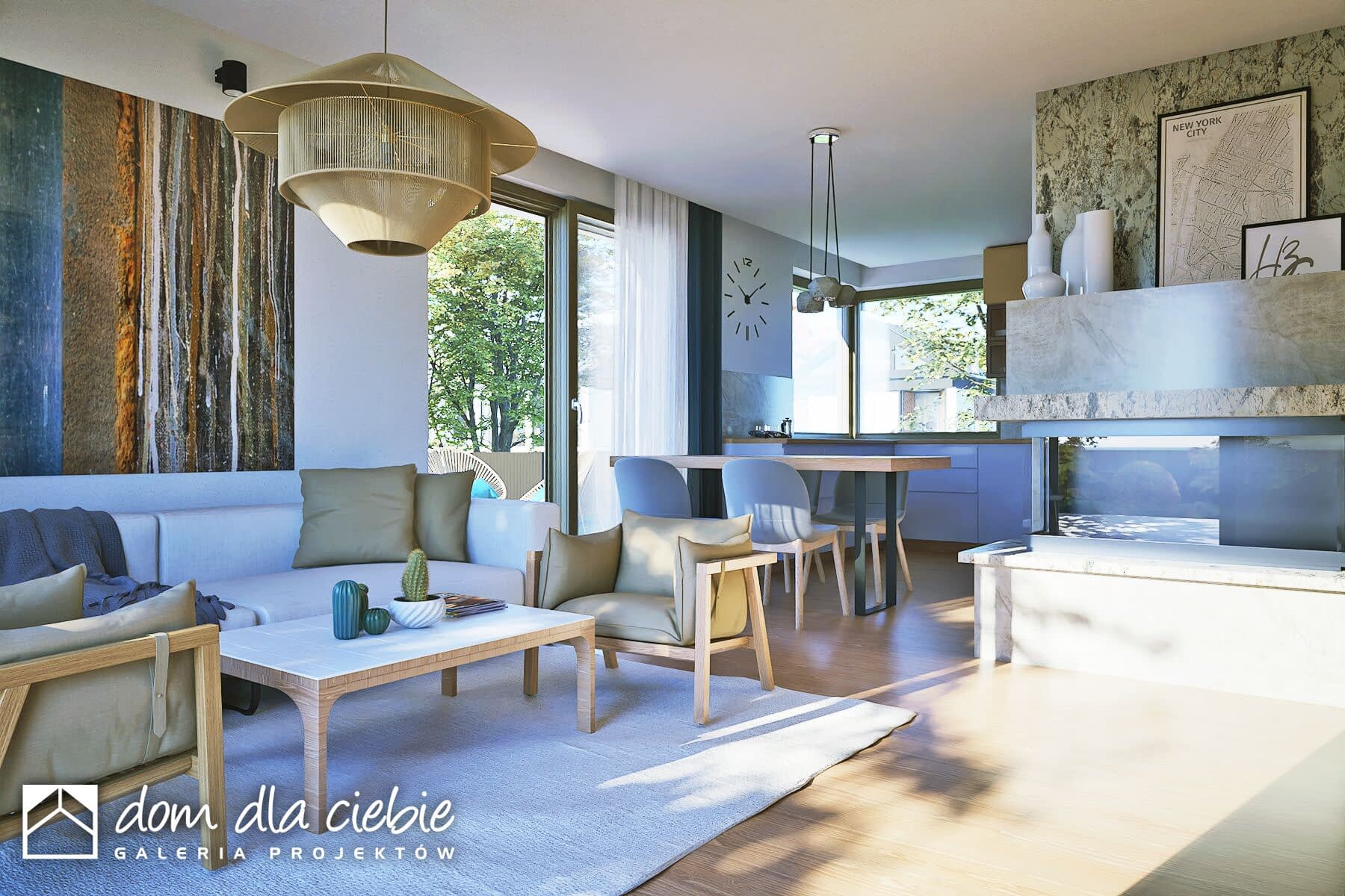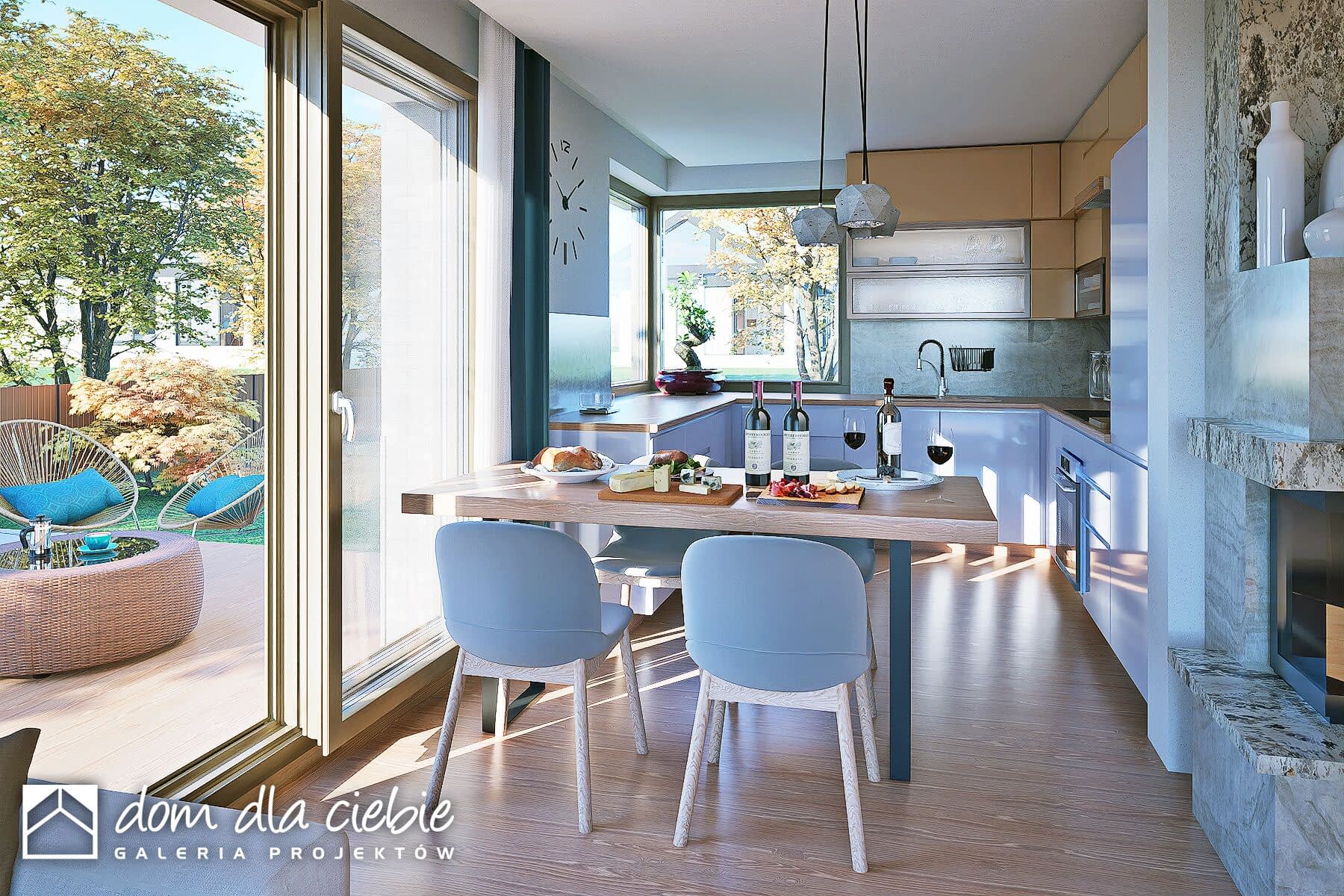Karla to nowoczesny i funkcjonalny projekt domu jednorodzinnego z poddaszem użytkowym, przeznaczony dla 4–5-osobowej rodziny. Zwarta bryła, dwuspadowy dach i stonowana elewacja z jasnego tynku i klinkieru łączą elegancję z ekonomią budowy. Zadaszone wejście podkreśla prostą, nowoczesną formę.Na parterze zaplanowano przestronną strefę dzienną z salonem, jadalnią i kuchnią oraz kominkiem w centralnym punkcie. Dodatkowy pokój może pełnić funkcję gabinetu lub sypialni gościnnej. Przewidziano też WC, garderobę pod schodami oraz dostęp do garażu i pomieszczenia technicznego.Poddasze to trzy sypialnie, w tym jedna z własną łazienką, oraz wspólna, przestronna łazienka z wanną i prysznicem.Projekt Karla harmonijnie łączy nowoczesność z naturalnymi akcentami. Dzięki dużym przeszkleniom wnętrza są jasne i otwarte na ogród, a prosta forma budynku pasuje zarówno do krajobrazu wiejskiego, jak i podmiejskiego.