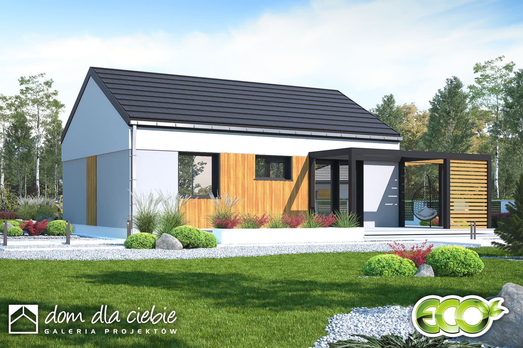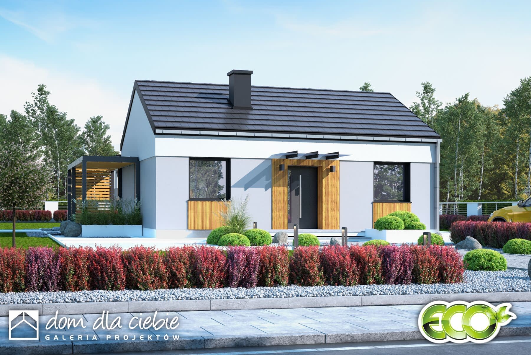 Karmelek to niewielki, uroczy domek idealny dla 3-os rodziny. Pomimo niewielkich rozmiarów znajdziemy w jego wnętrzu wszelkie elementy niezbędne do wygodnego życia. W strefie wejściowej mamy wiatrołap z wygodną szafą oraz wydzielonym miejscem na kocioł grzewczy a następnie hol, który prowadzi do salonu z kuchnią, jadalnią oraz kominkiem a także do dwóch sypialni i łazienki. Nowoczesny wygląd Karmelka to wysokie okna oraz efektowna pergola, w której cieniu miło będzie schronić się latem. Projekt domu Karmelek to ekonomiczna propozycja domu energooszczędnego o powierzchni zabudowy do 70m2.